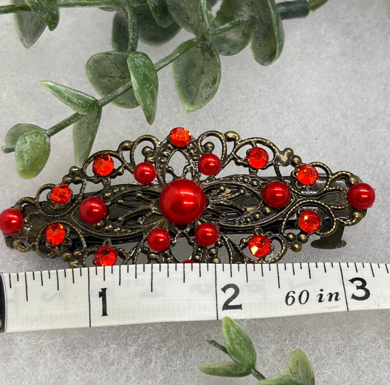 Ruby Red crystal faux pearl barrette Vintage Style 3.5”antique tone Metal bridal wedding shower birthday princess prom gift accessories