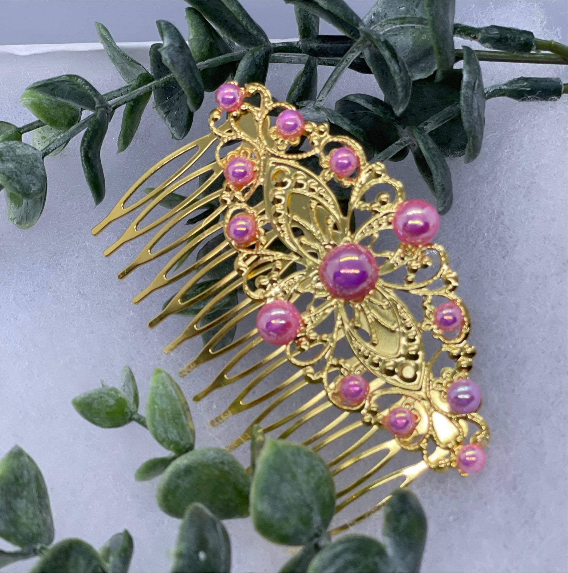 Pink purple pearls vintage style Gold tone side comb hair accessory accessories gift birthday event formal bridesmaid 3.5” Metal side Comb