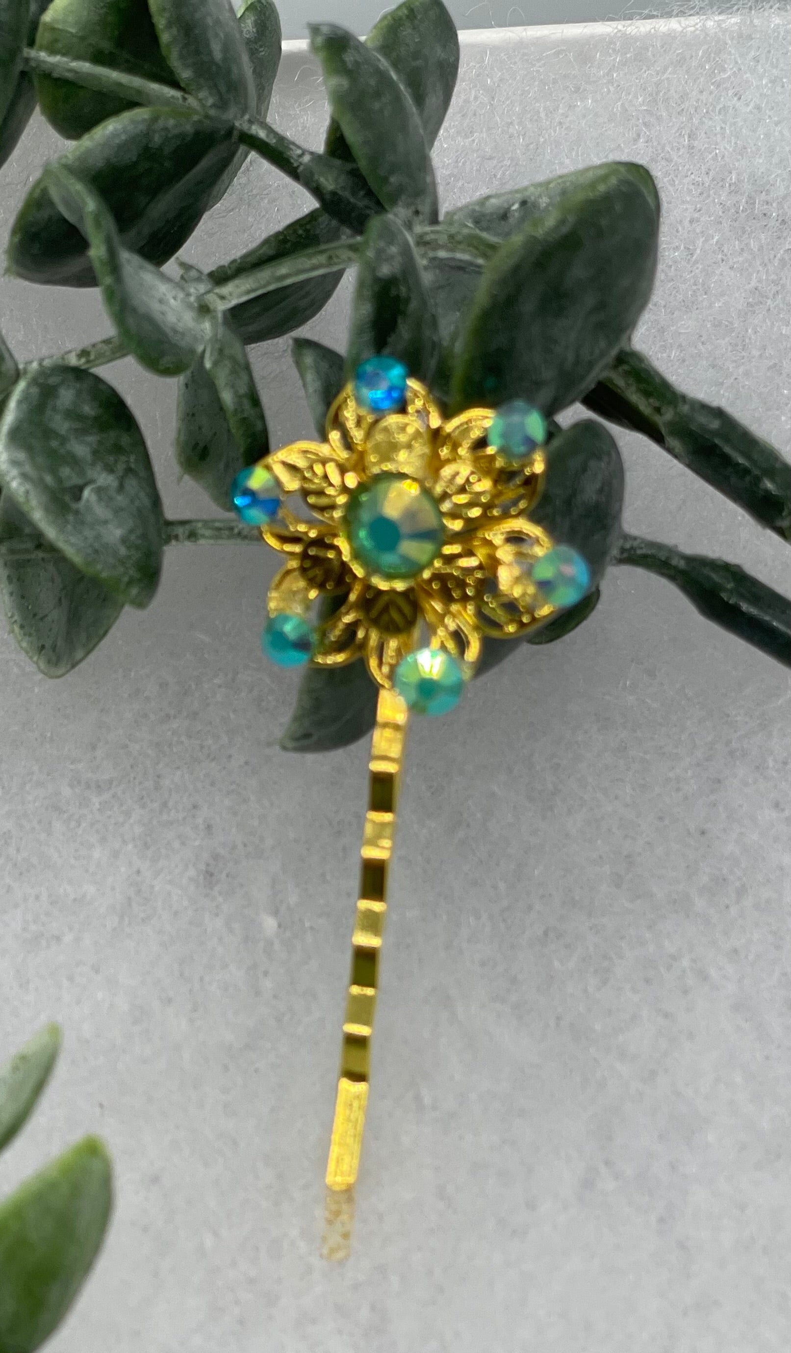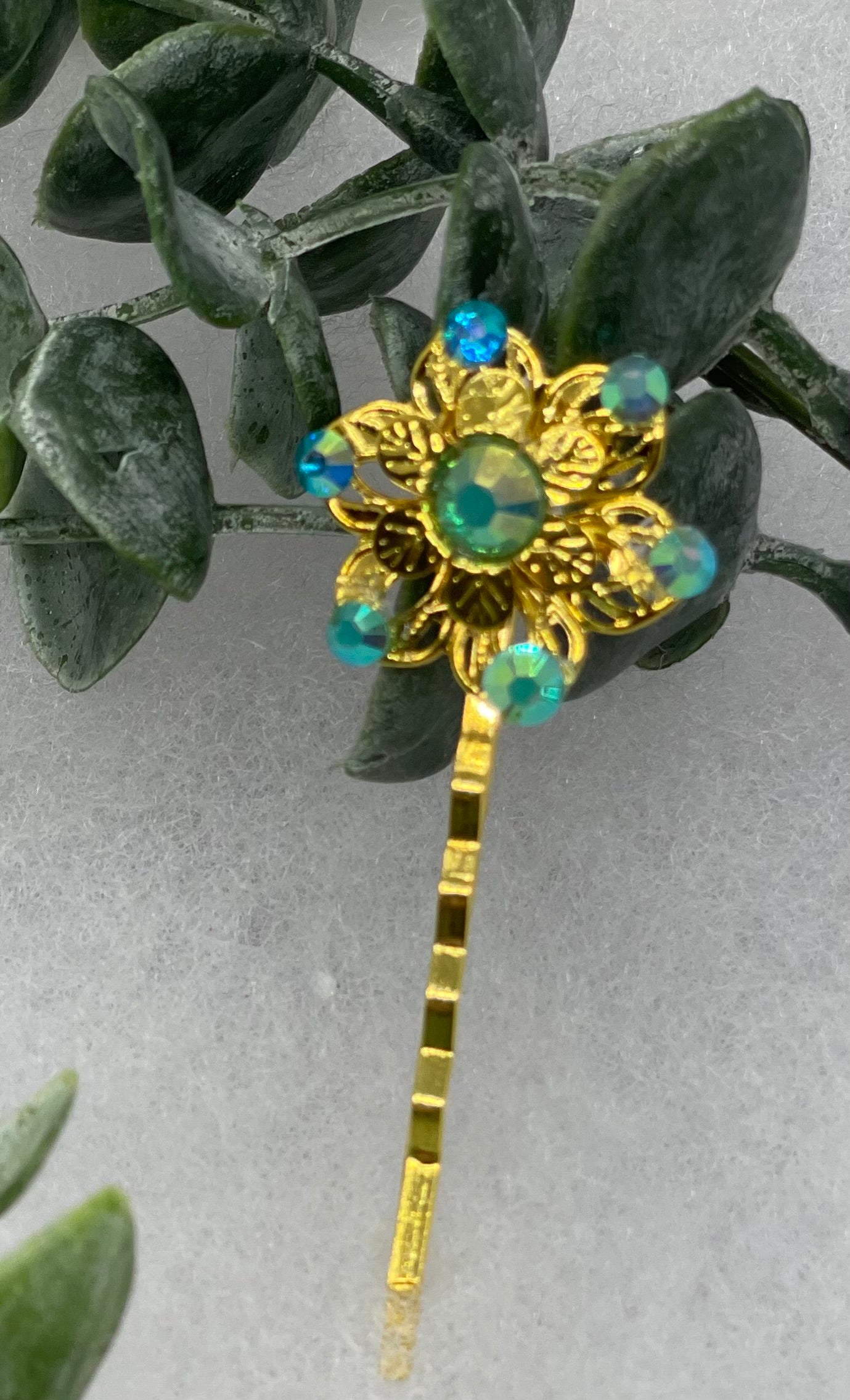 iridescent Teal crystal Gold Antique vintage Style approximately 3.0” flower hair pin wedding engagement bride princess formal hair accessory accessories