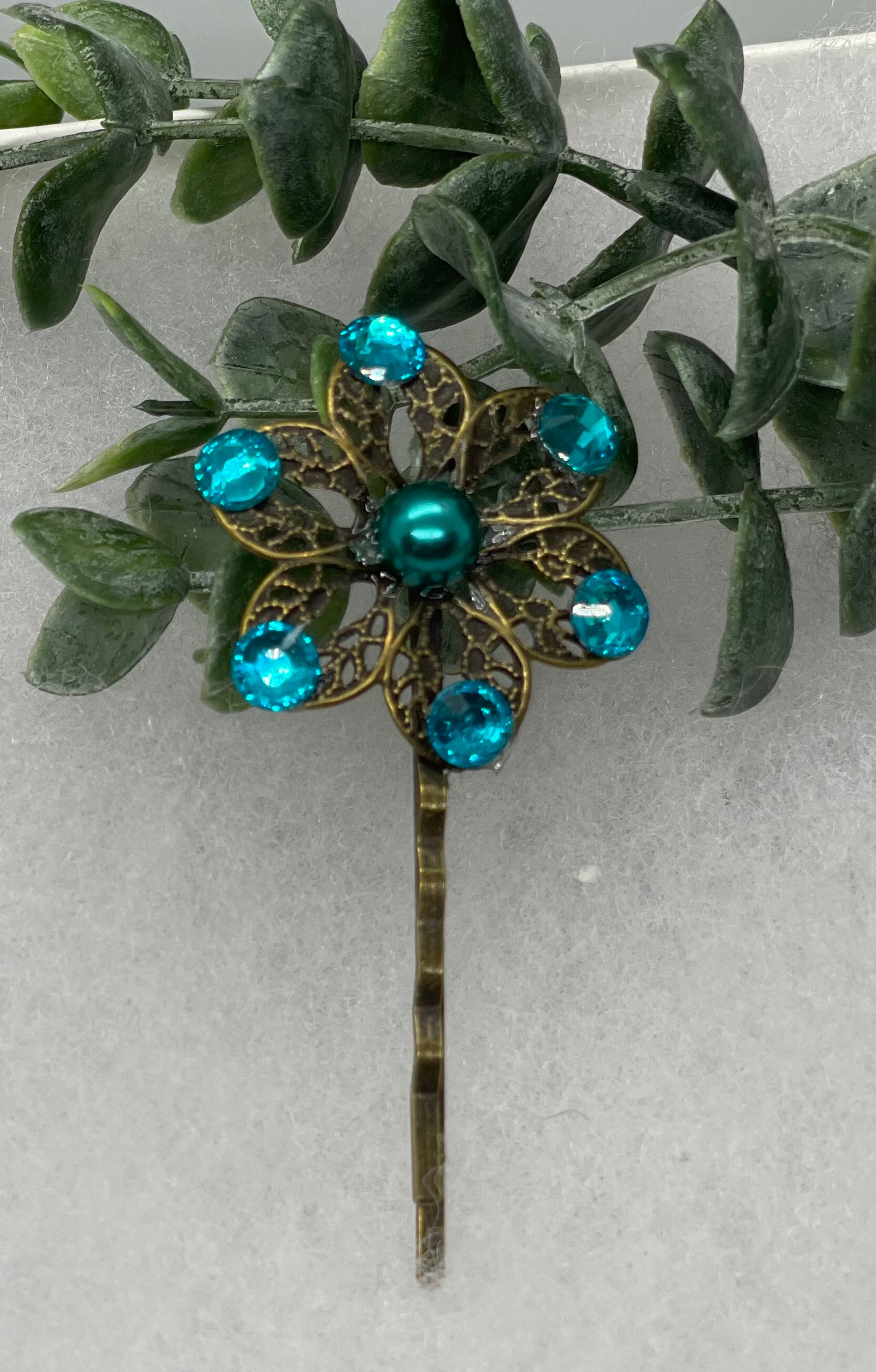 Teal crystal pearl Antique vintage Style approximately 3.0” flower hair pin wedding engagement bride princess formal hair accessory