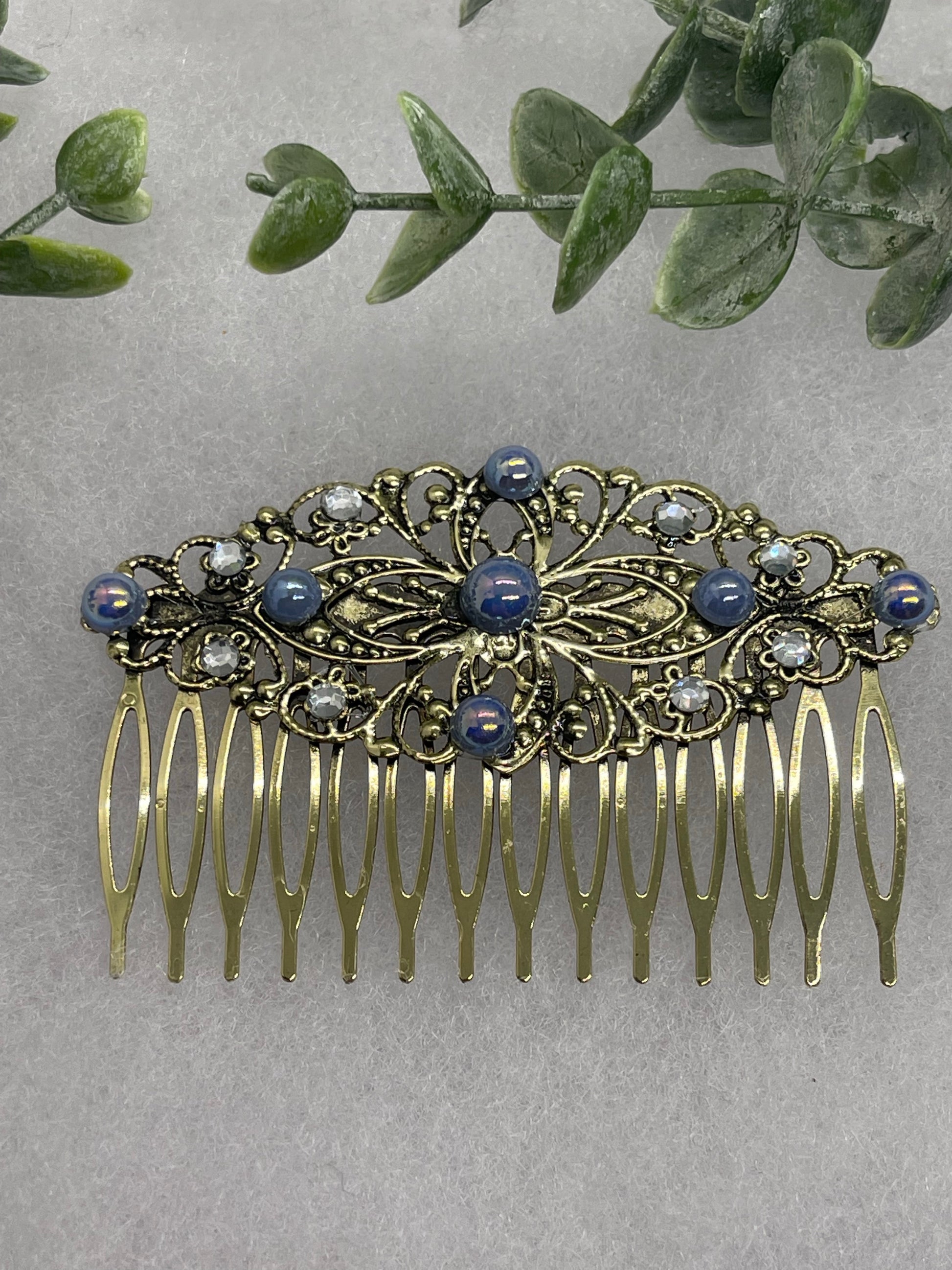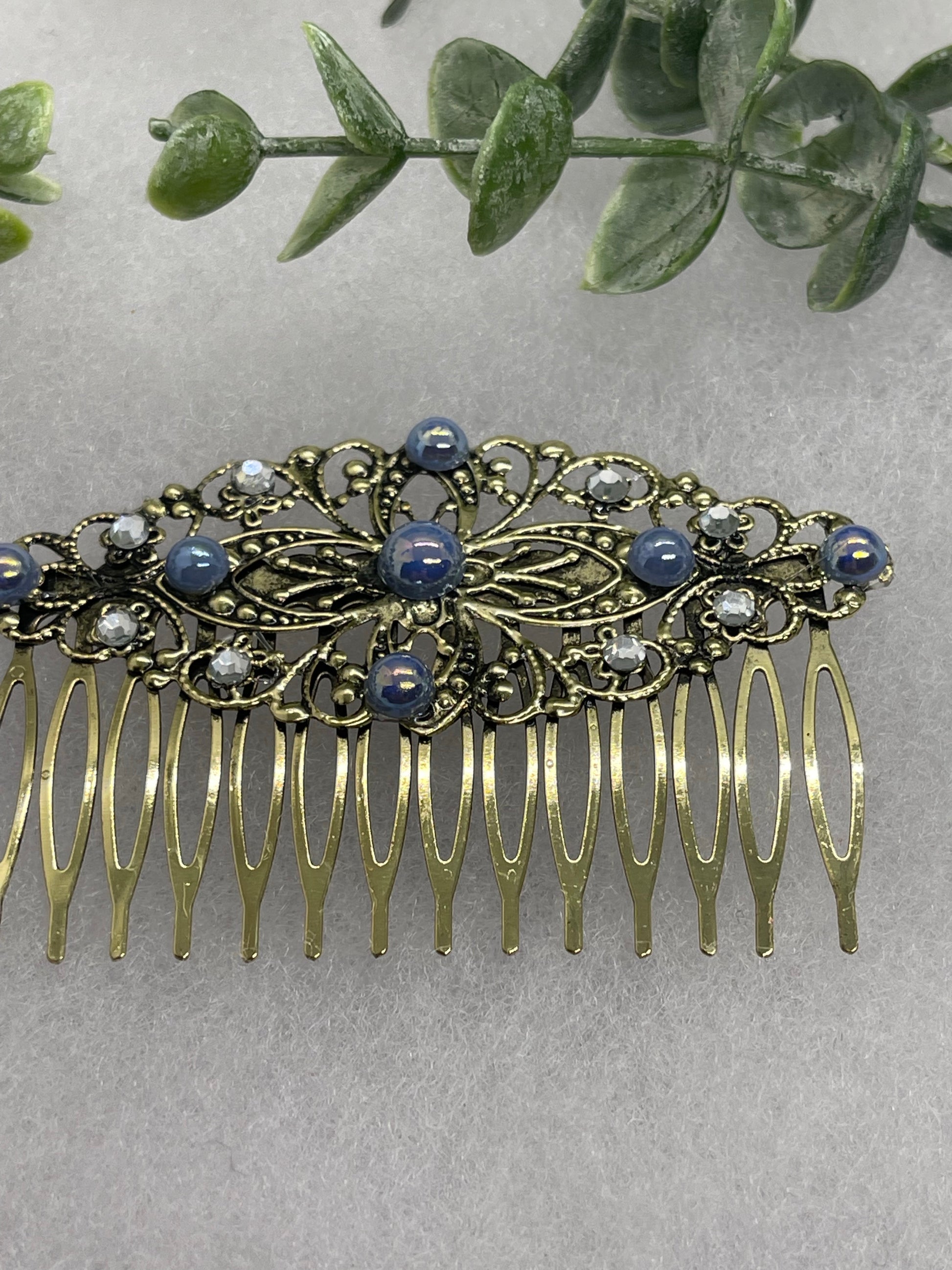 Blue iridescent crystal Pearl vintage style silver tone side comb hair accessory accessories gift birthday