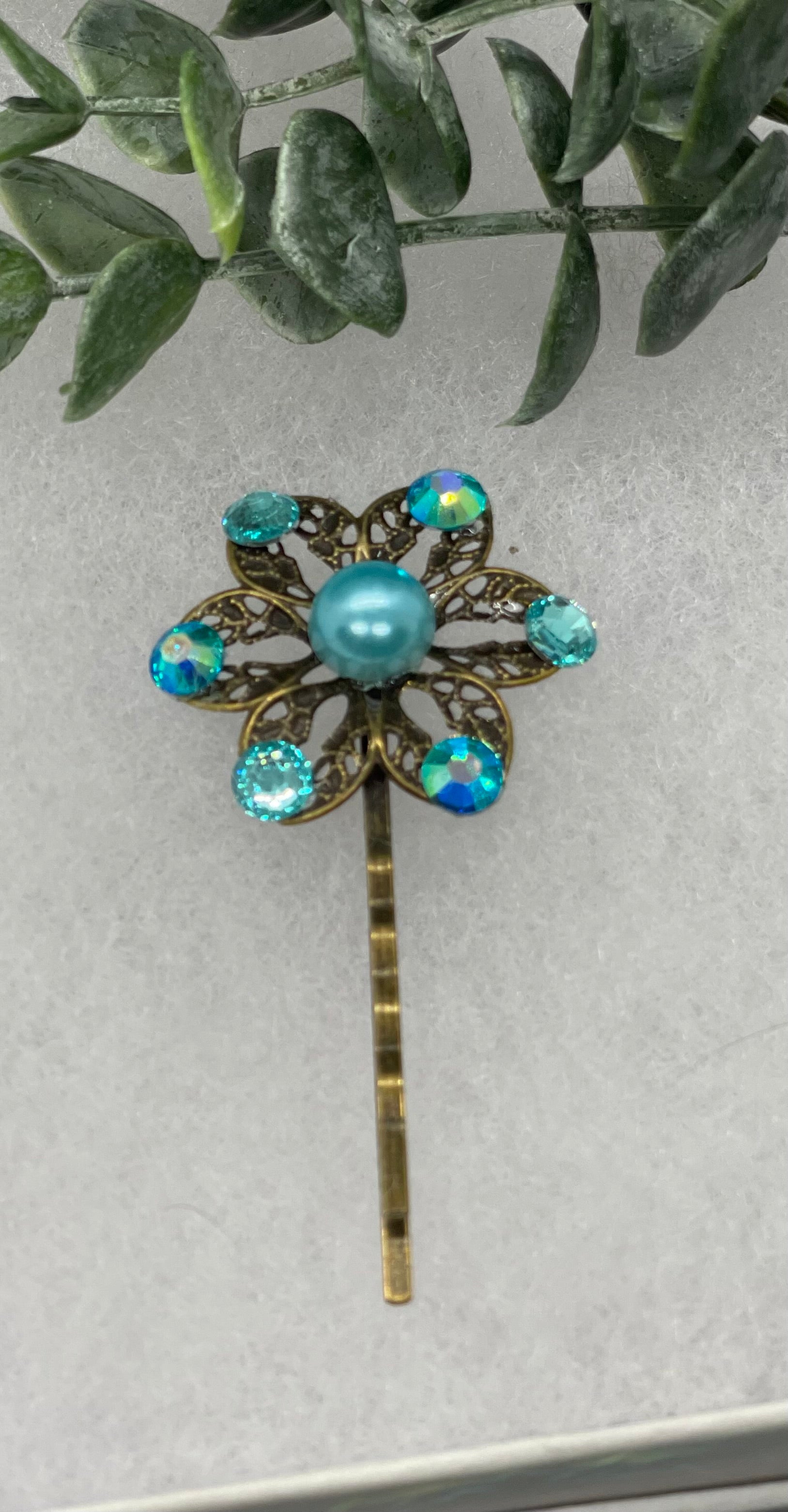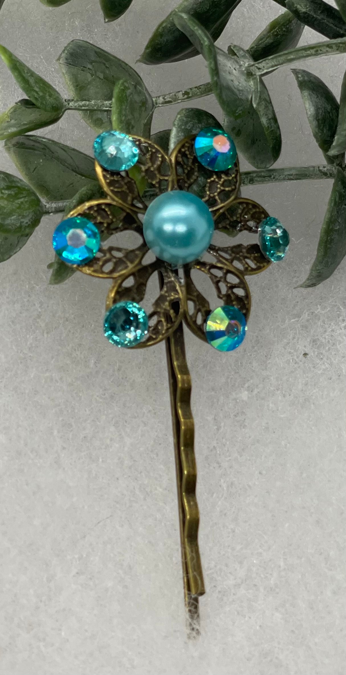 Blue Teal crystal iridescent pearl Antique vintage Style approximately 3.0” flower hair pin wedding engagement bride princess formal hair accessory