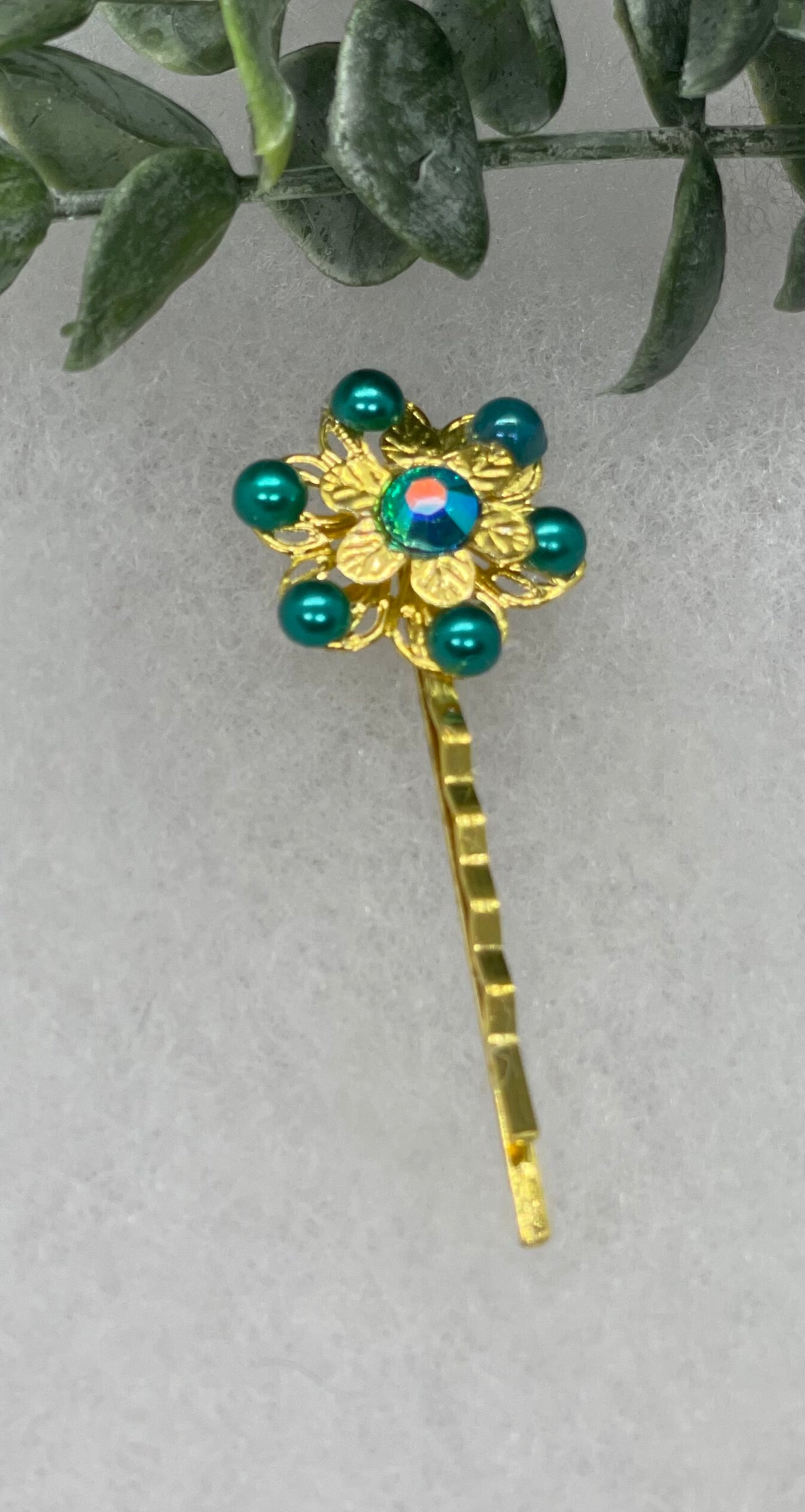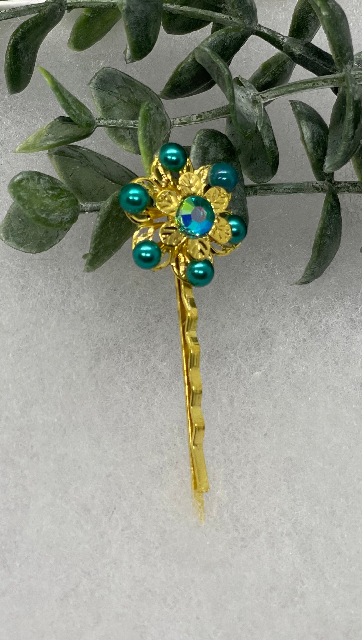 Teal Pearl crystal Gold Antique vintage Style approximately 3.0” flower hair pin wedding engagement bride princess formal hair accessory accessories