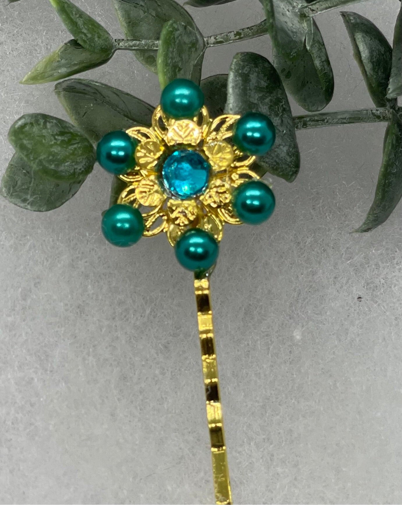Teal Pearl crystal Gold Antique vintage Style approximately 3.0” flower hair pin wedding engagement bride princess formal hair accessory accessories