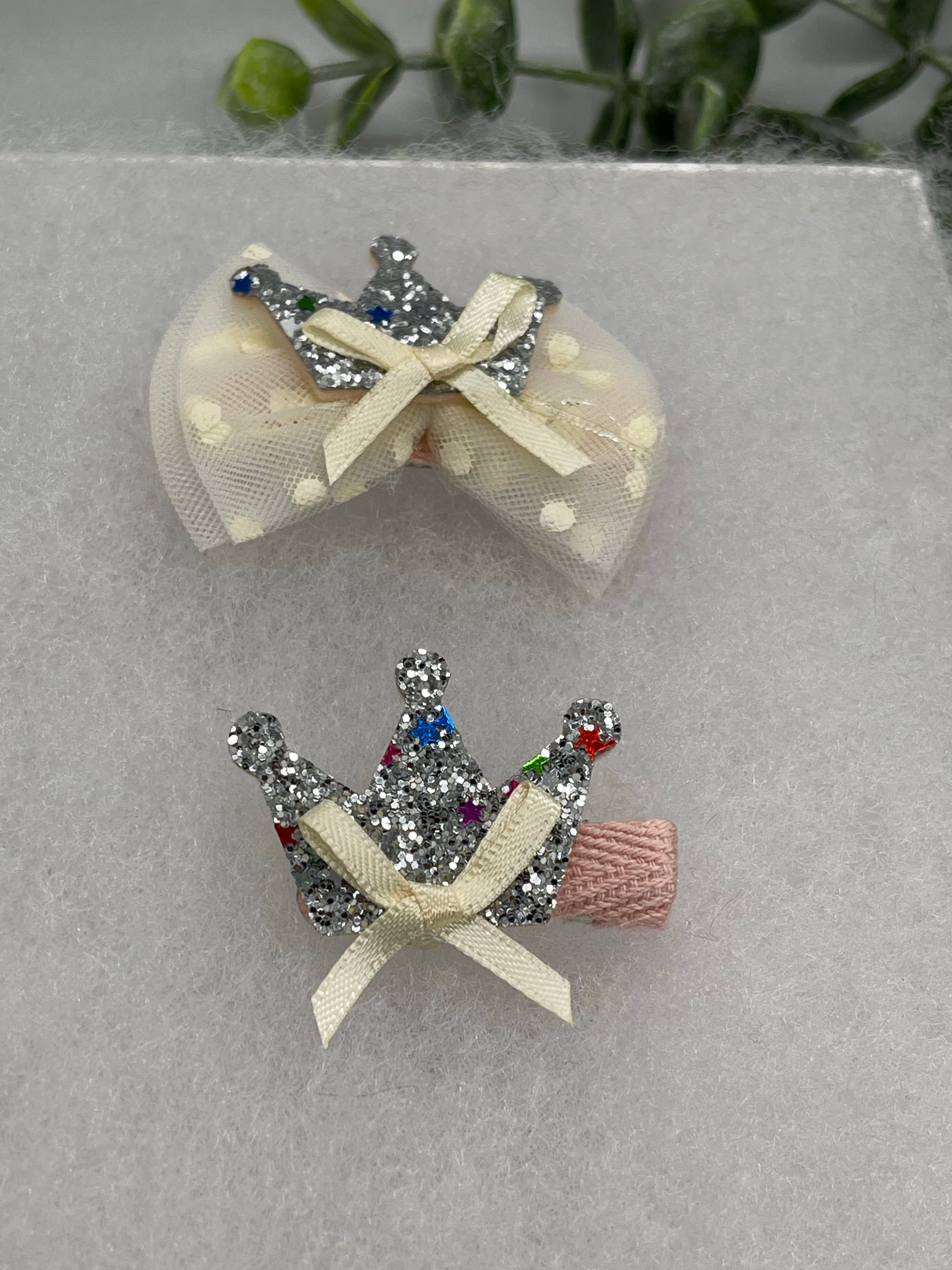 Beige Bow crown Girls hair clips 2 pc set pink 1.0” 1.5” alligator clips girls little girls hair accessory accessories jewelry