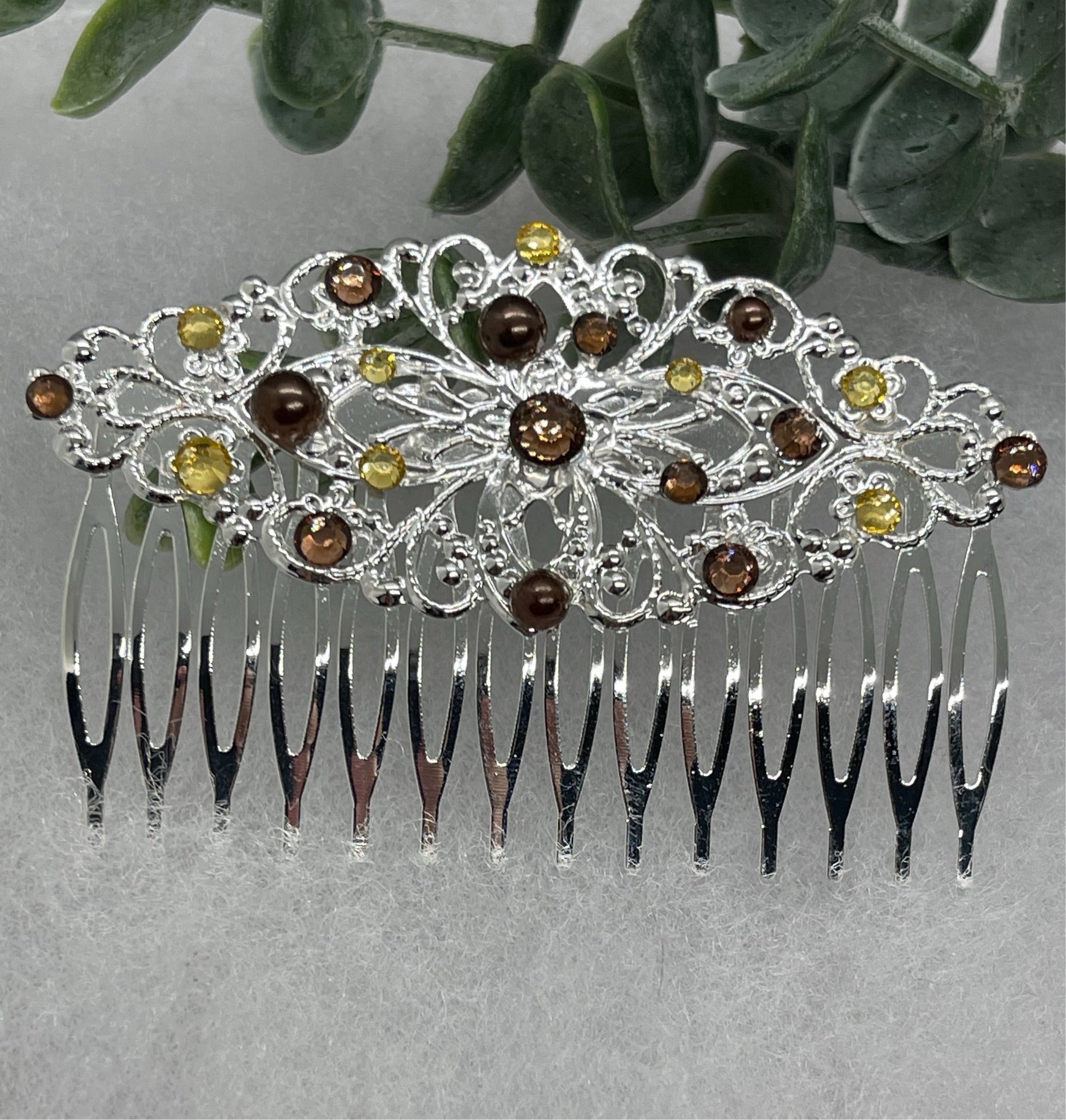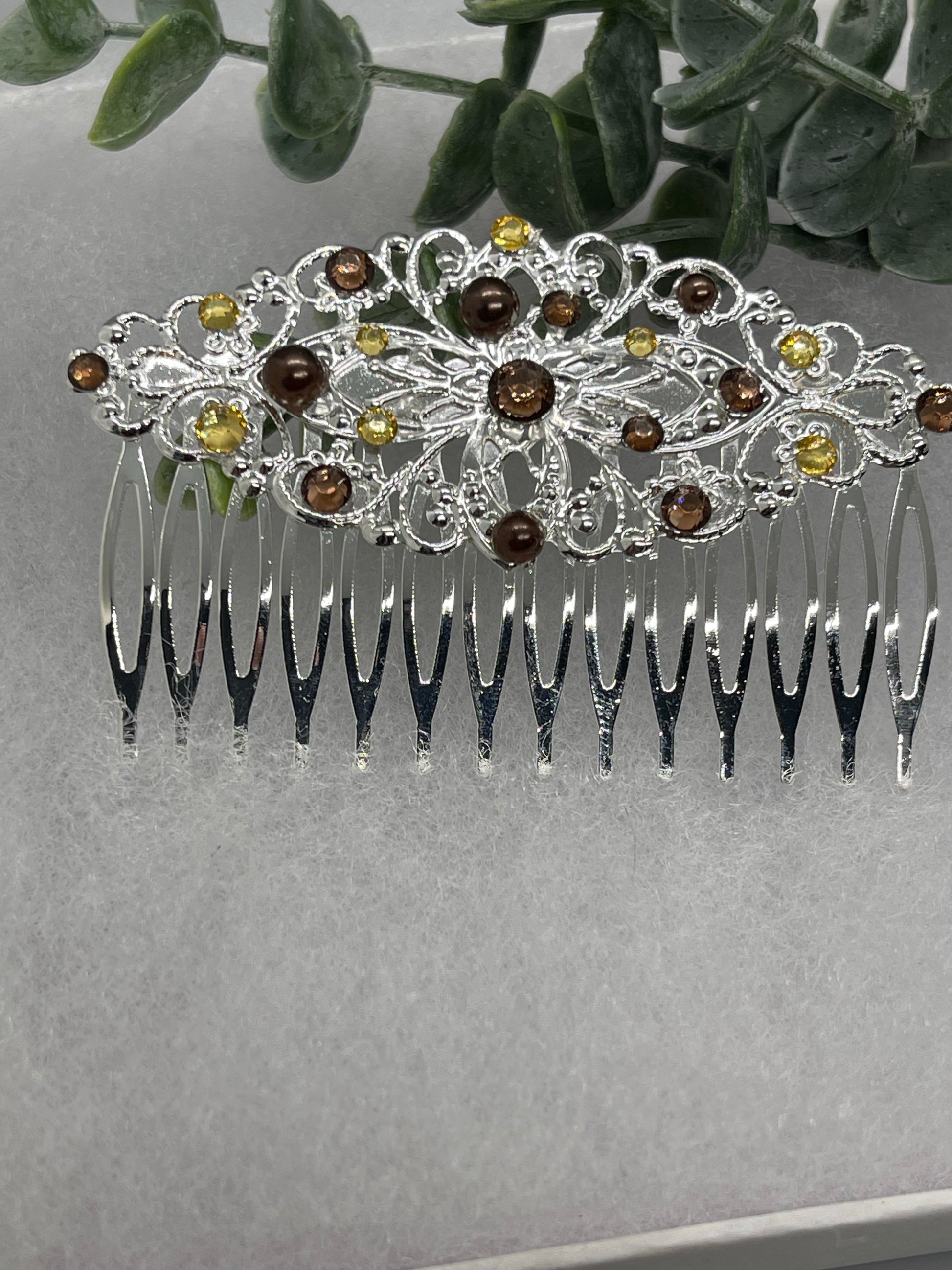 Brown yellow crystal rhinestone 3.5” silver side comb Antique vintage style bridal Wedding shower sweet 16 birthday princess bridesmaid hair accessory
