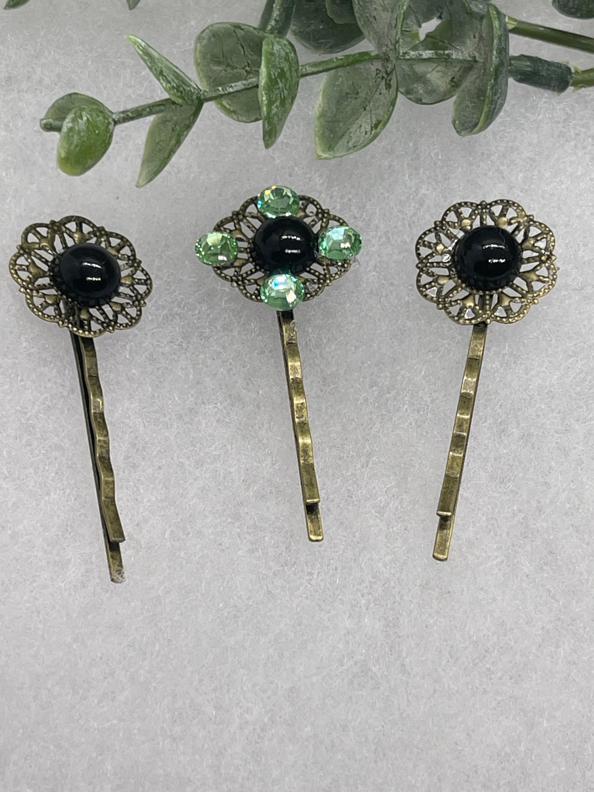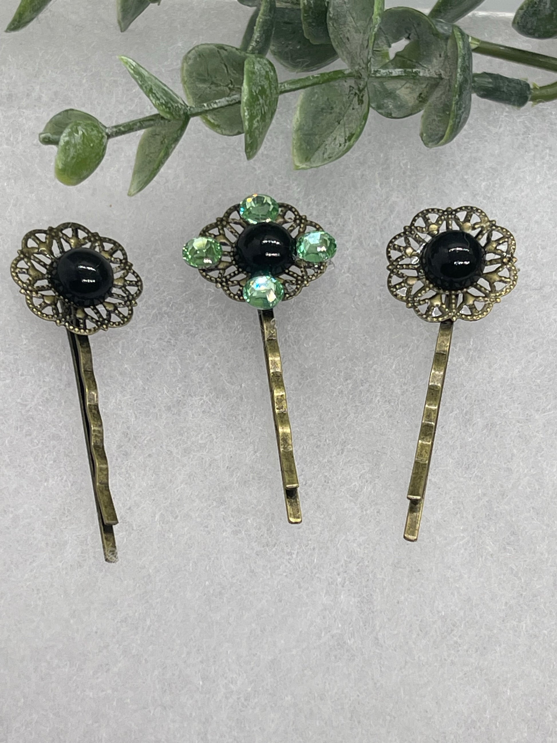 Black Green crystal faux pearl 3 pc set Antique vintage Style approximately 3.0” flower hair pin wedding