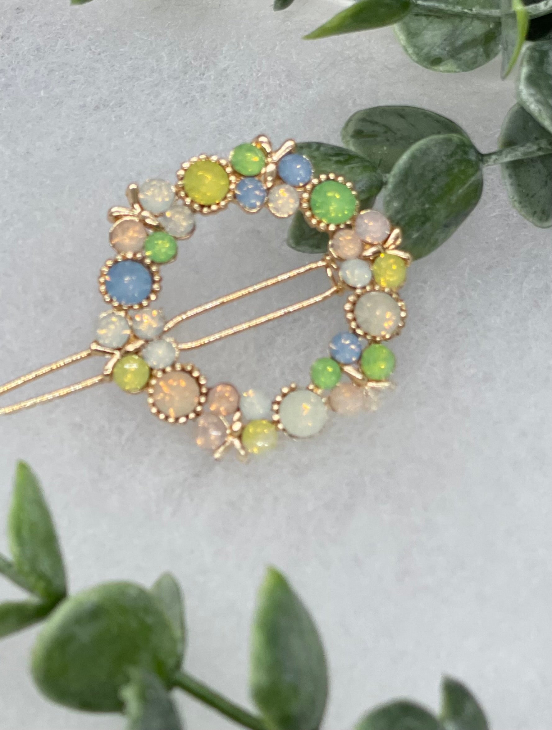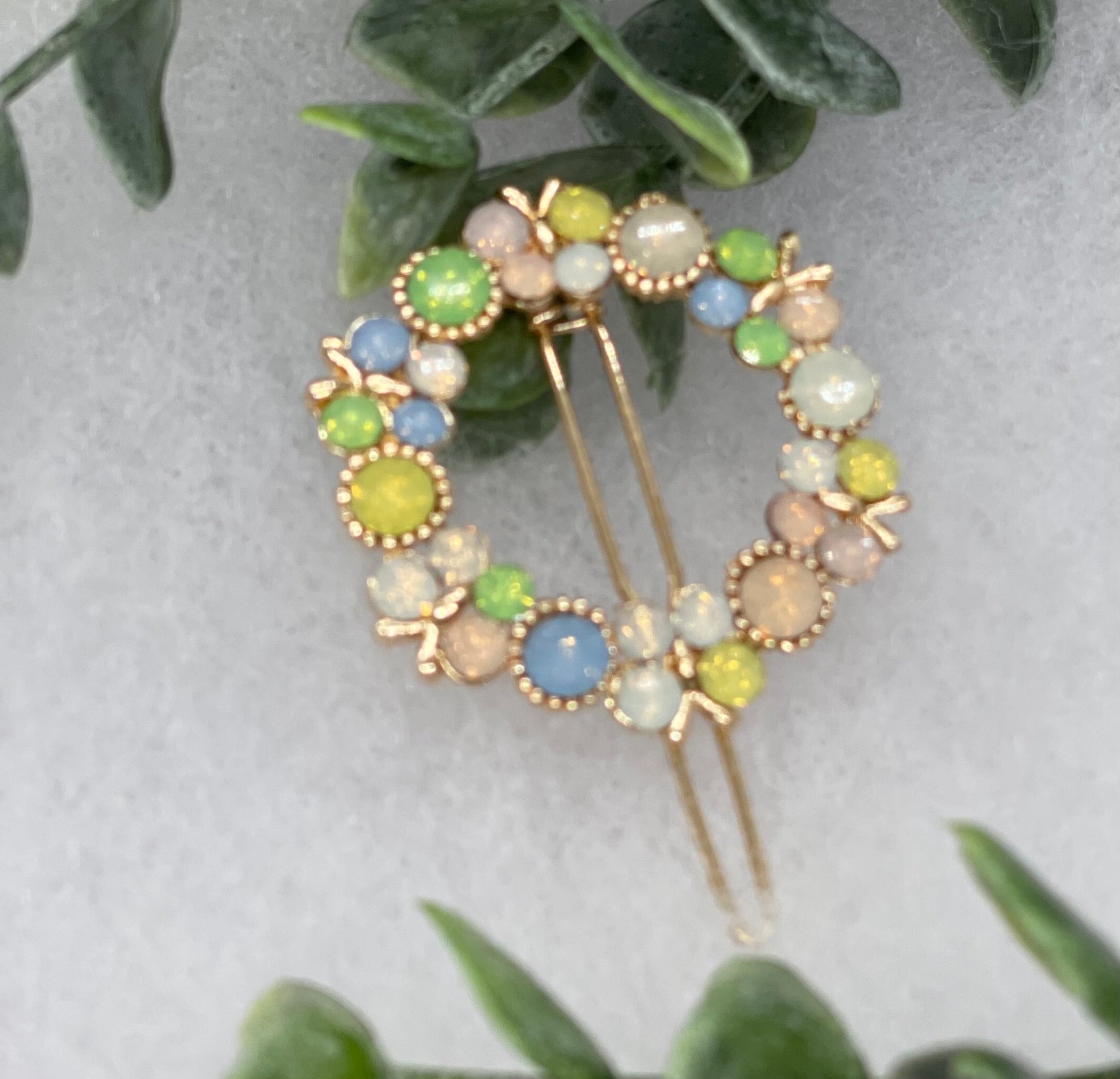 Rainbow crystal rhinestone flower approximately 2.5” barrette Gold vintage style bridal Wedding shower sweet 16