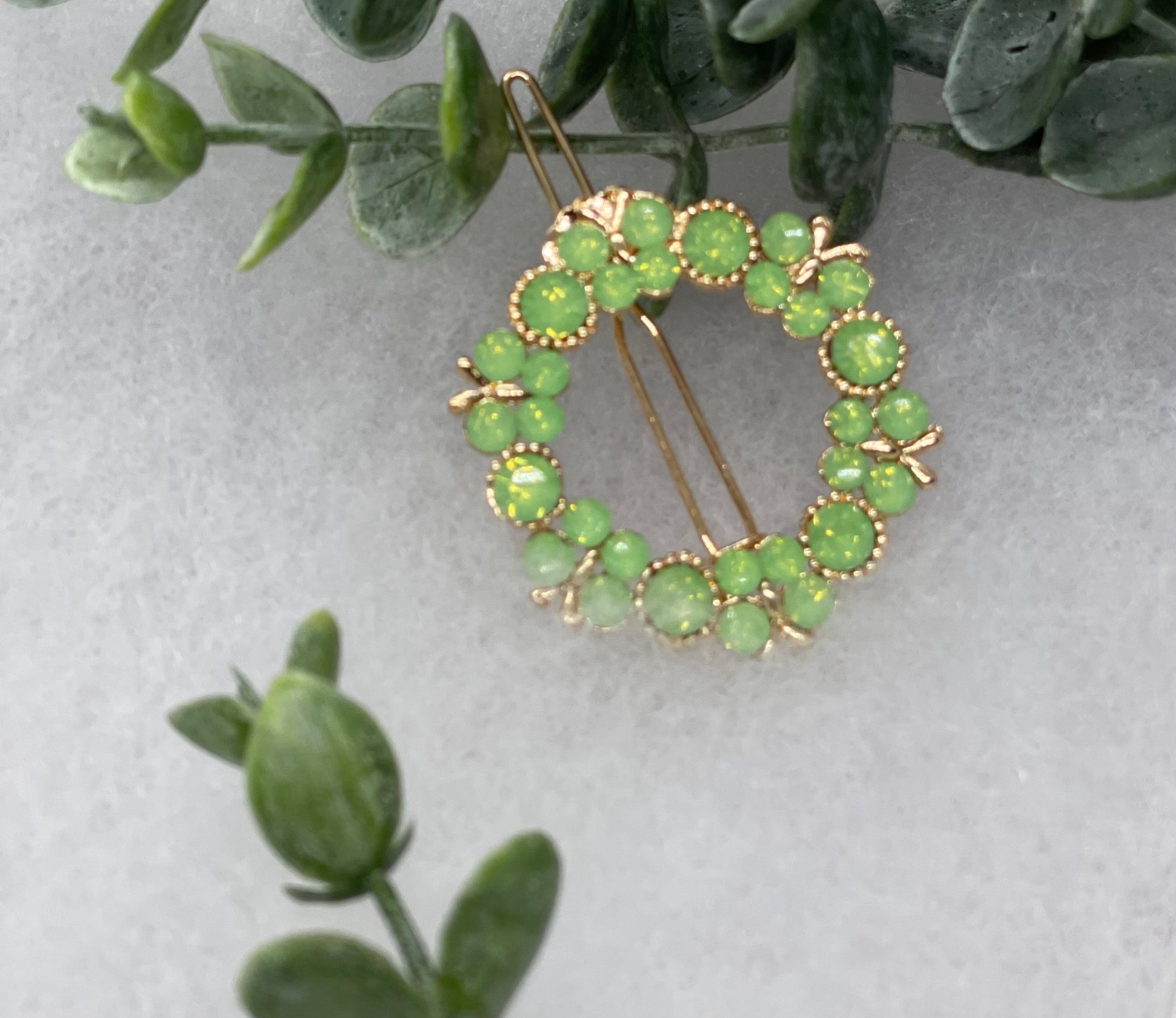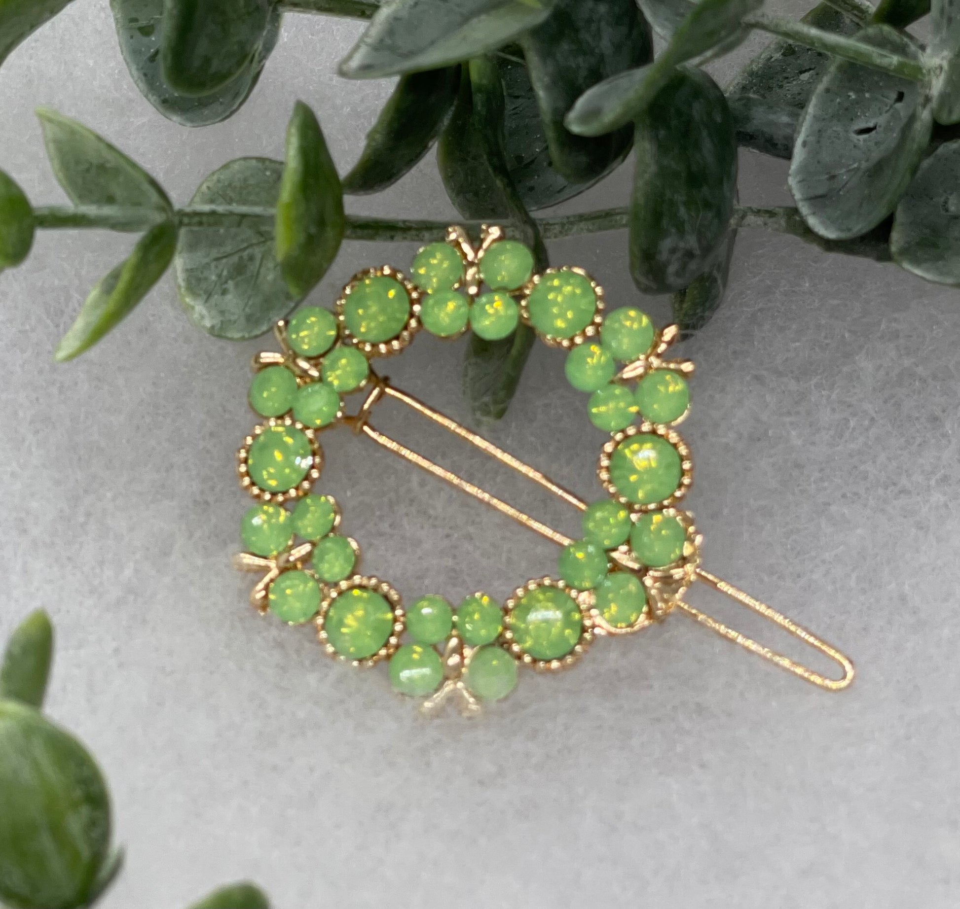 Green crystal rhinestone flower approximately 2.5” barrette Gold vintage style bridal Wedding showe