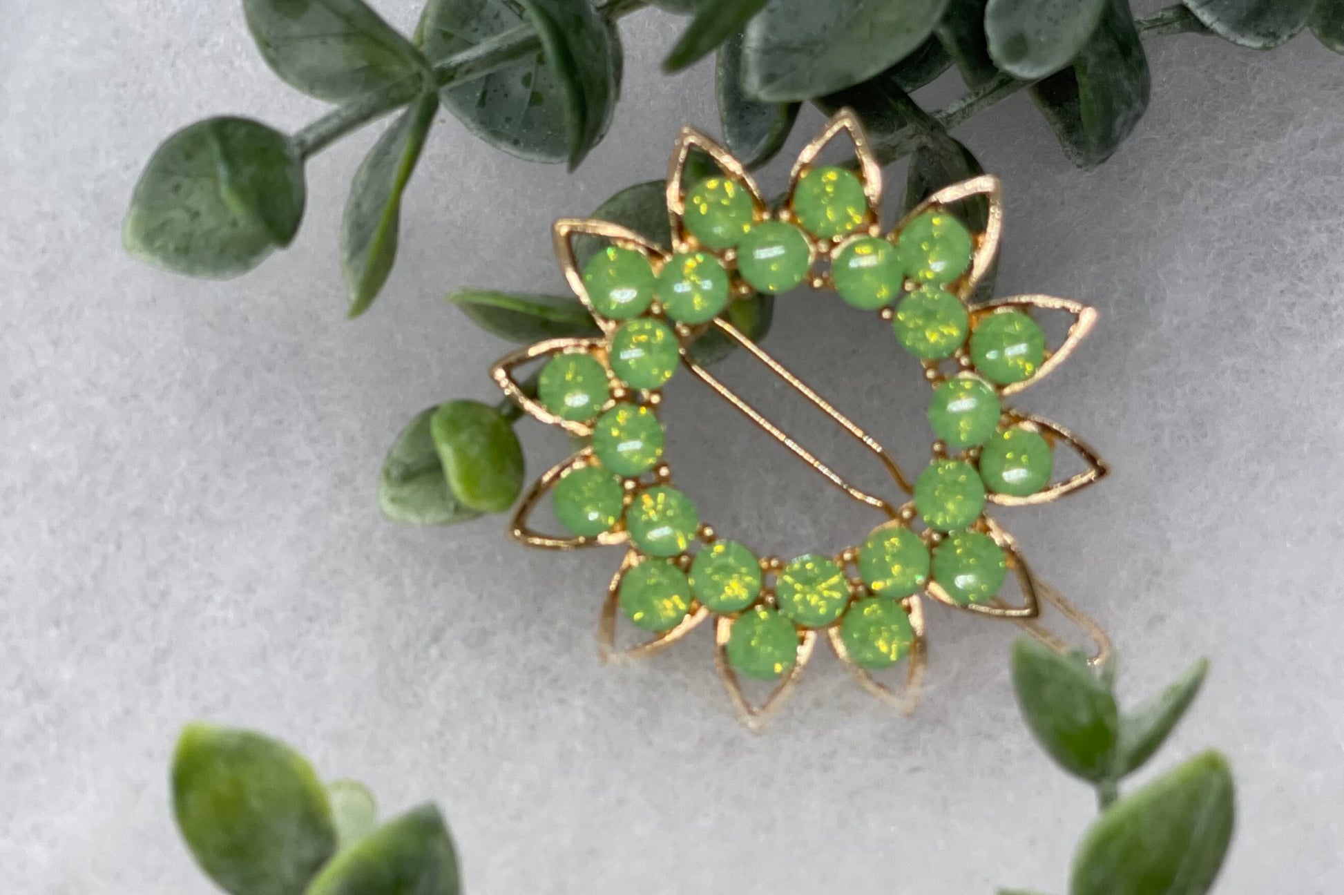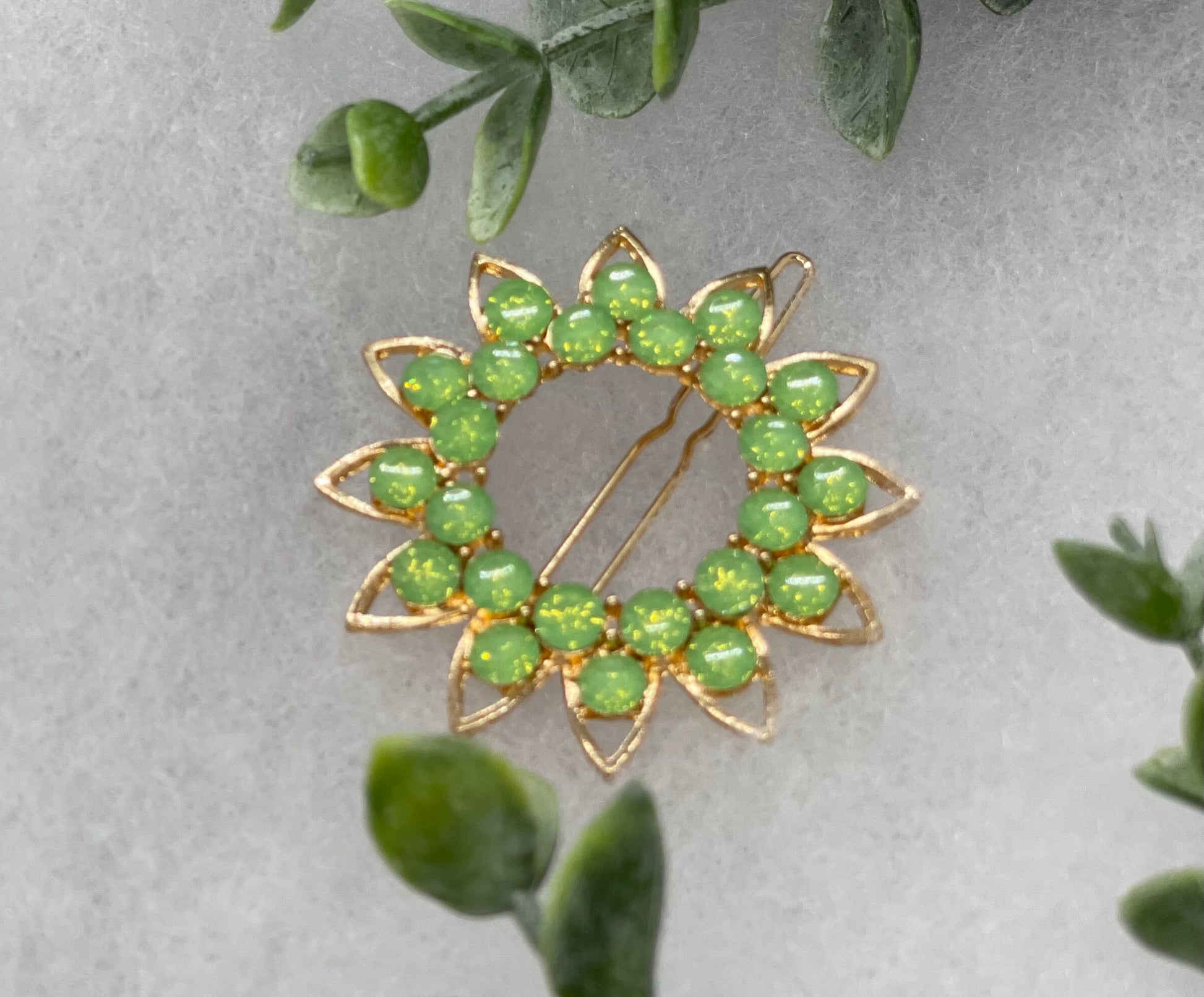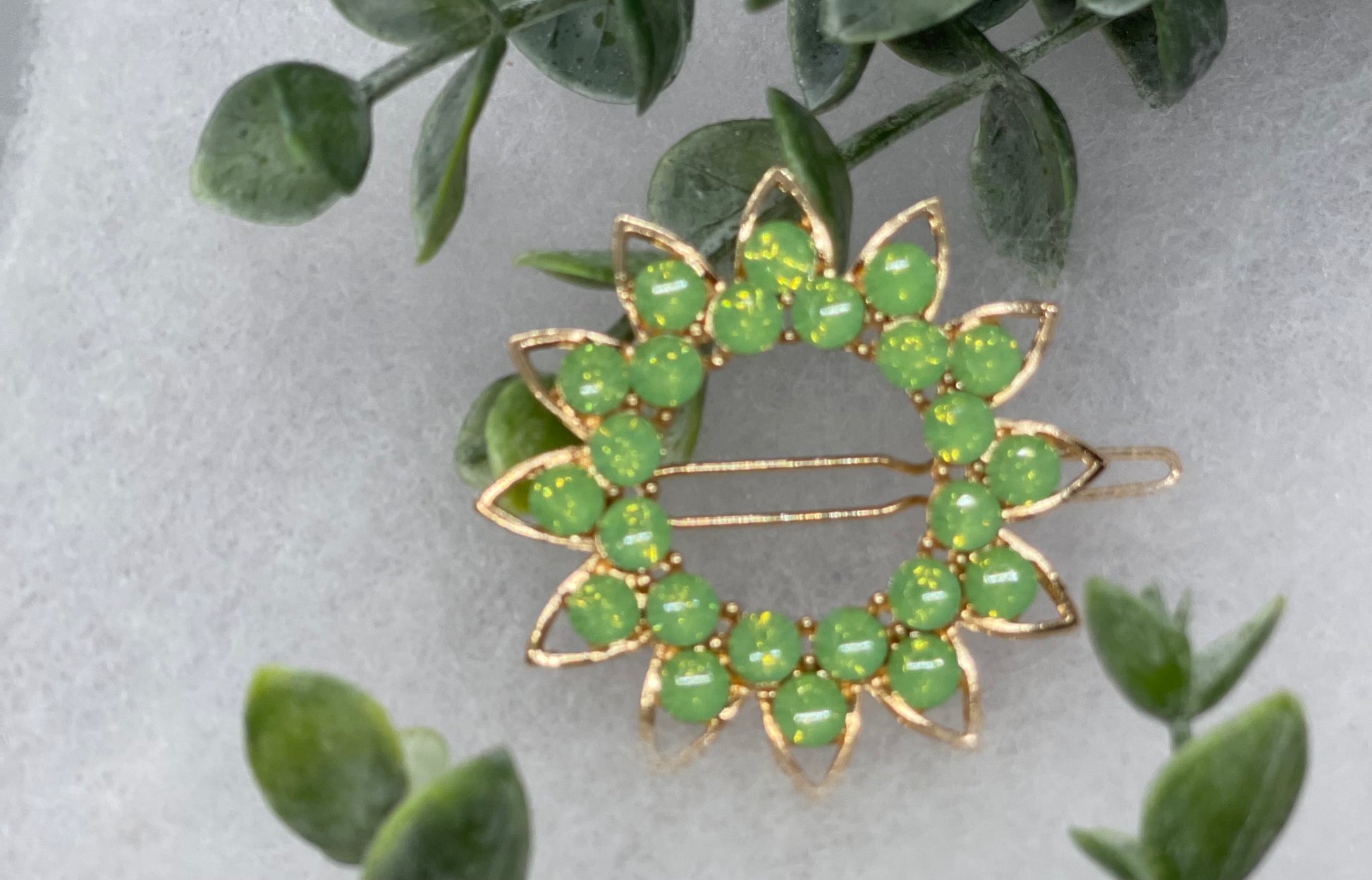 Green crystal rhinestone sunflower approximately 2.5” barrette Gold vintage style bridal Wedding shower