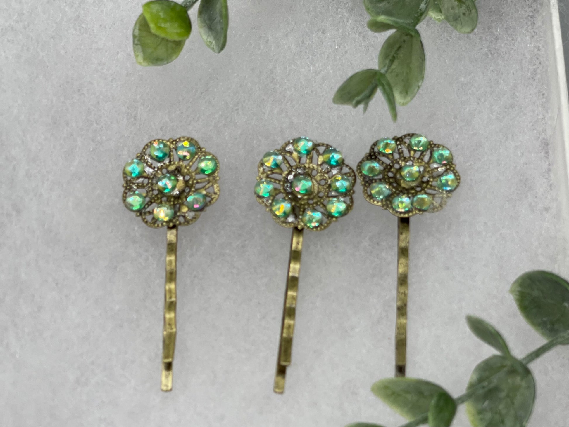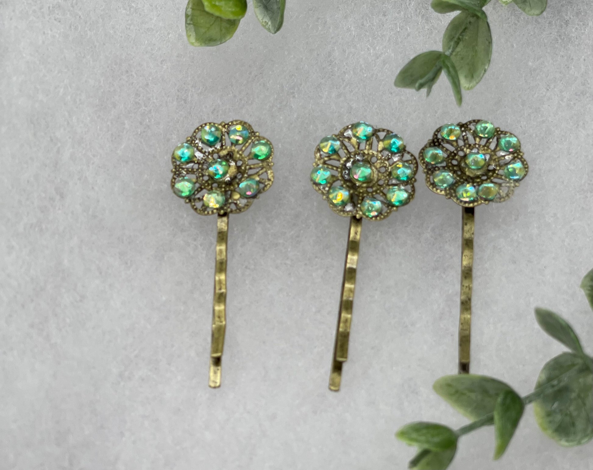 Green crystal 3 pc set Antique vintage Style approximately 3.0” flower hair pin wedding engagement bride princess formal hair accessories