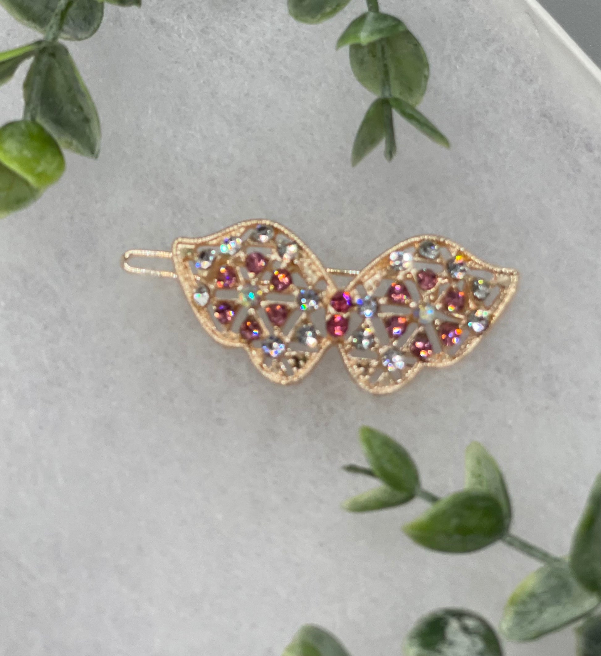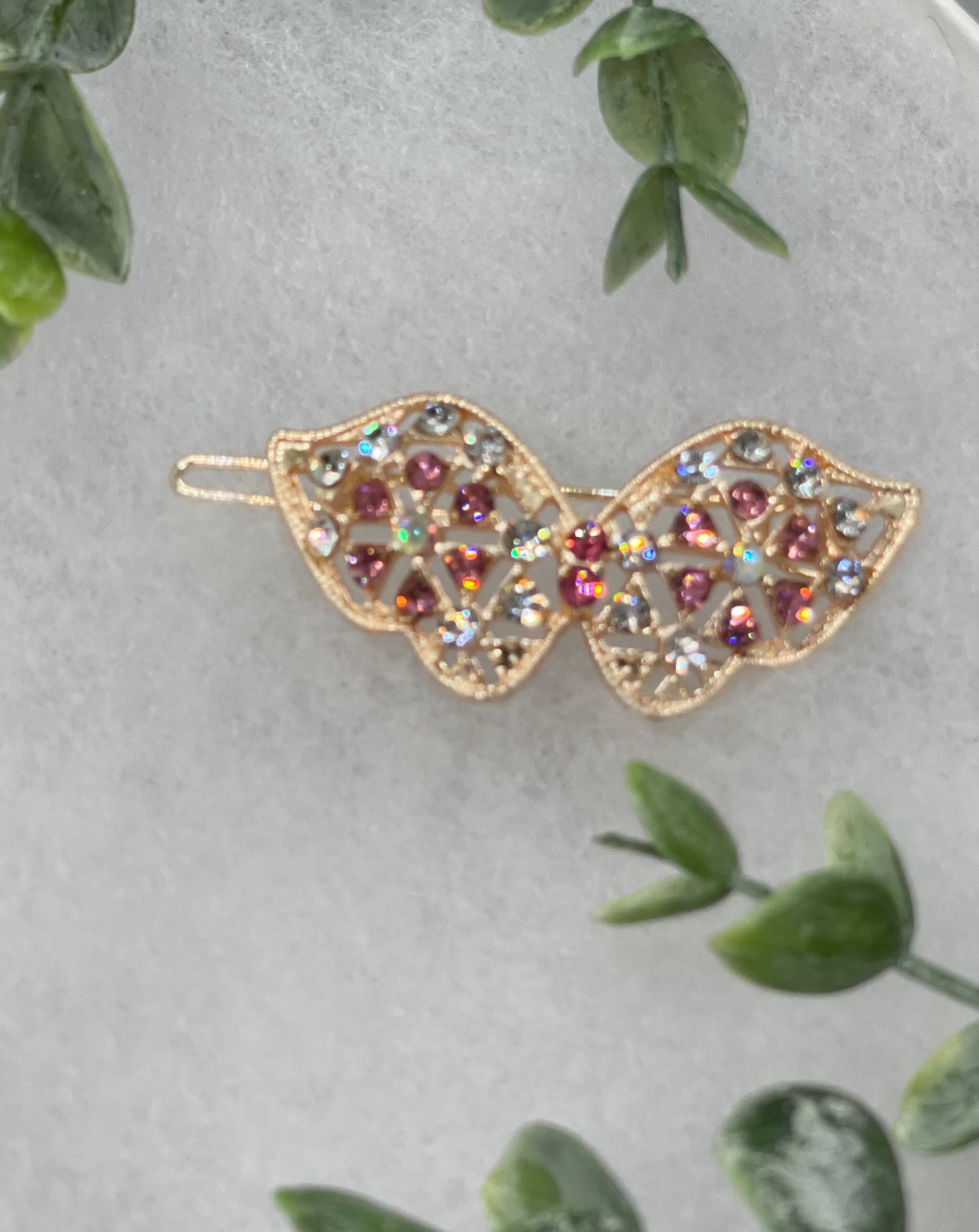 Pink butterfly crystal rhinestone approximately 2.0” barrette Gold vintage style bridal Wedding princess