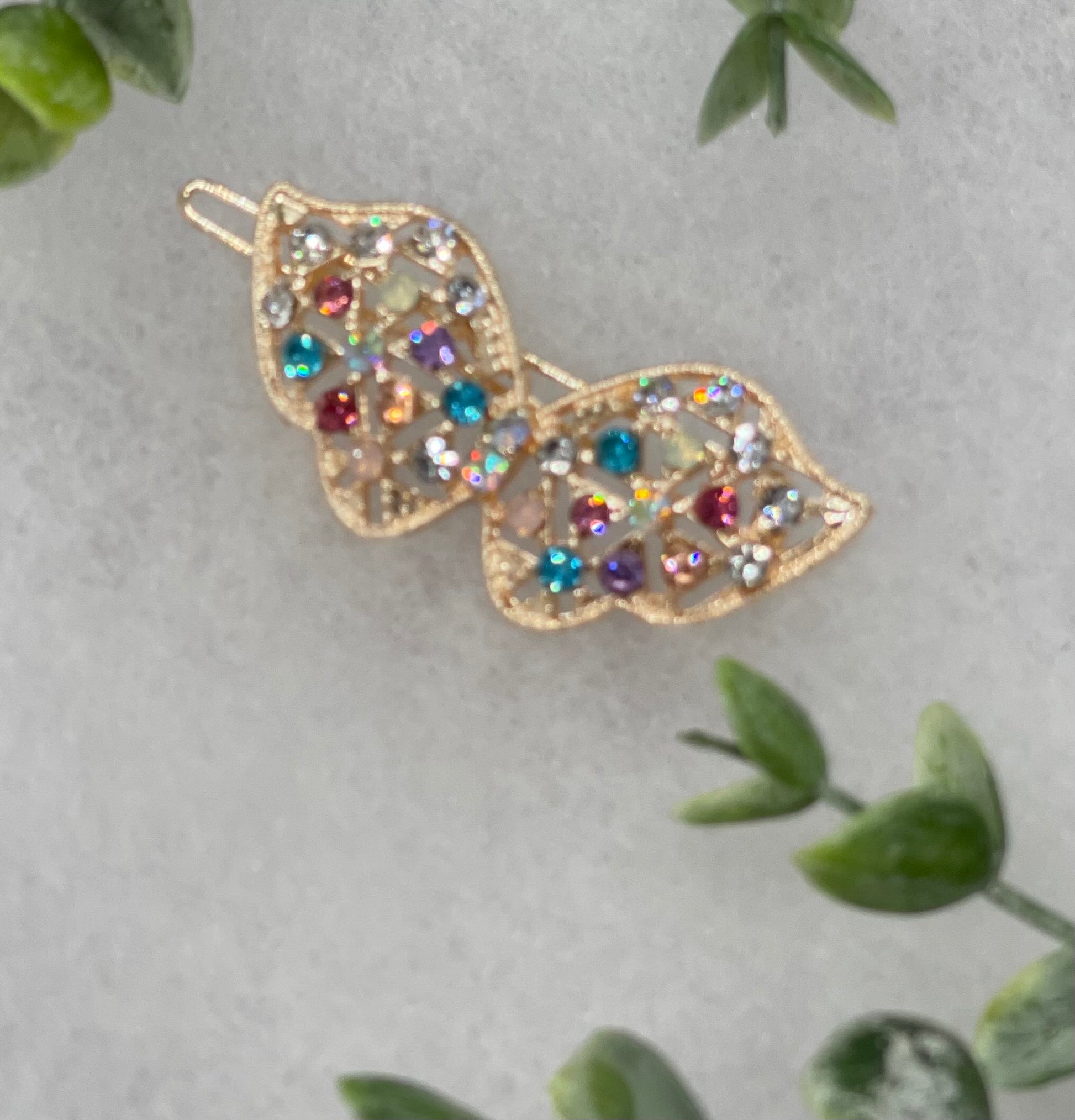 Rainbow butterfly crystal rhinestone approximately 2.0” barrette Gold vintage style bridal Wedding shower sweet 16