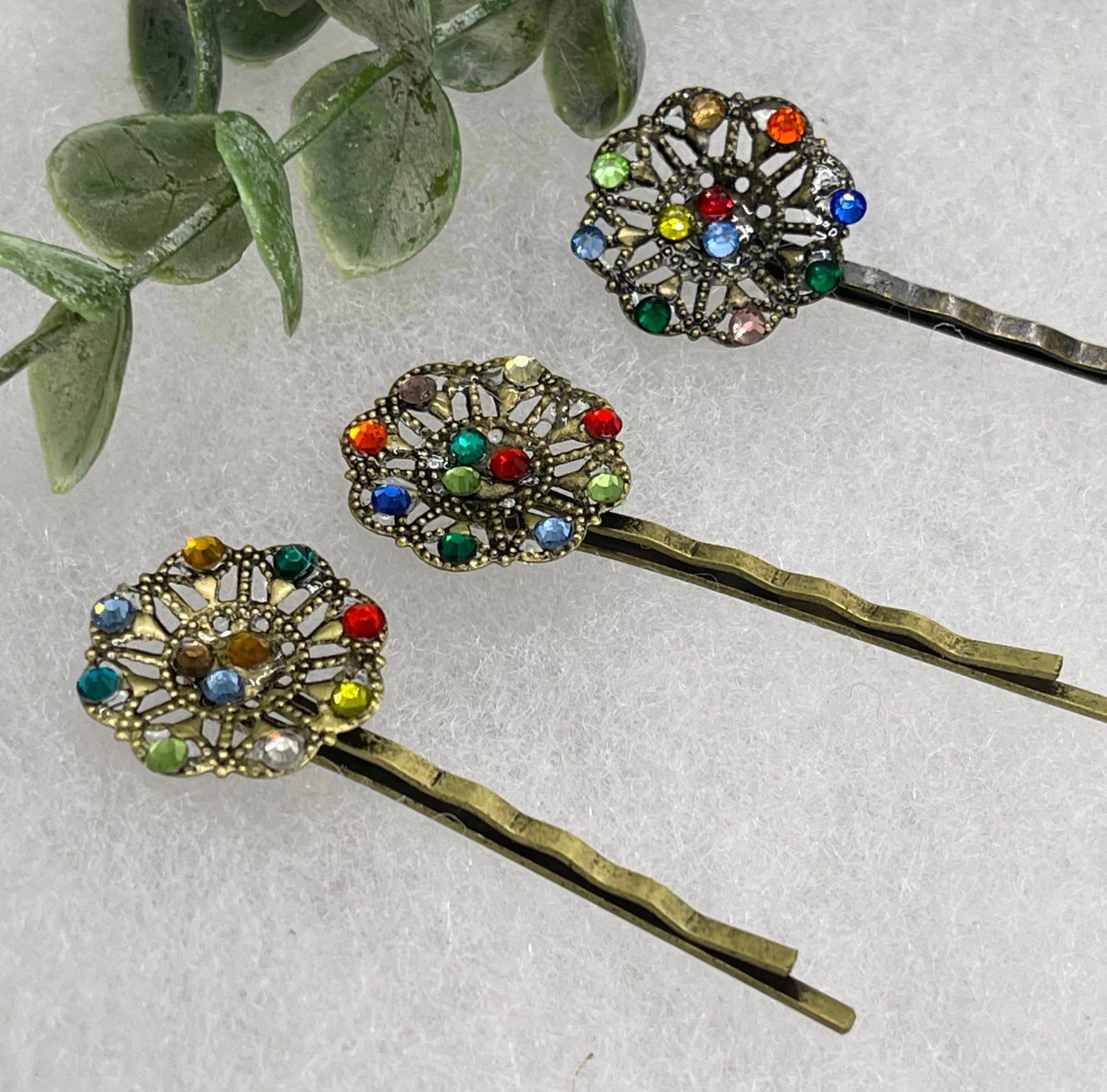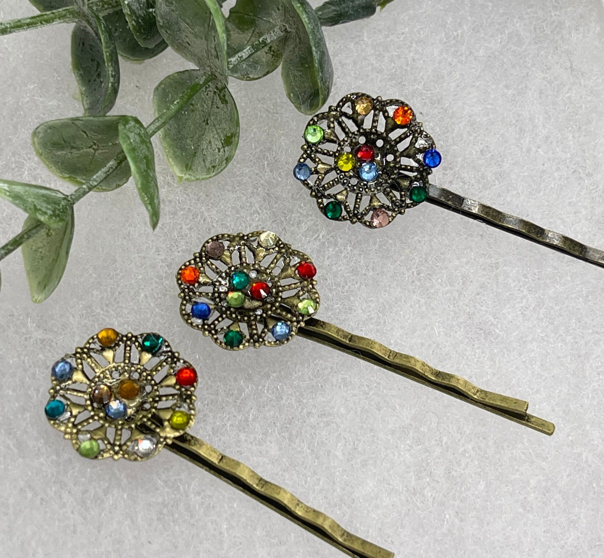 Rainbow crystal 3 pc set Antique vintage Style approximately 3.0” flower hair pin wedding engagement bride princess formal hair accessories