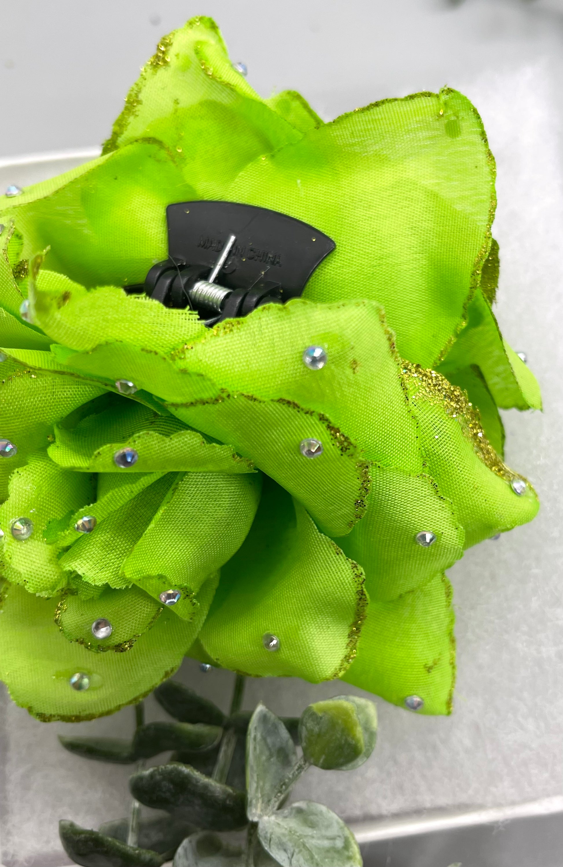 lime Green Rose flower crystal rhinestone tiny bit of glitter embellished Claw Jaw clip approximately Large 5.0”W 4.0”L formal hair accessory wedding bridal engagement princess bridesmaid
