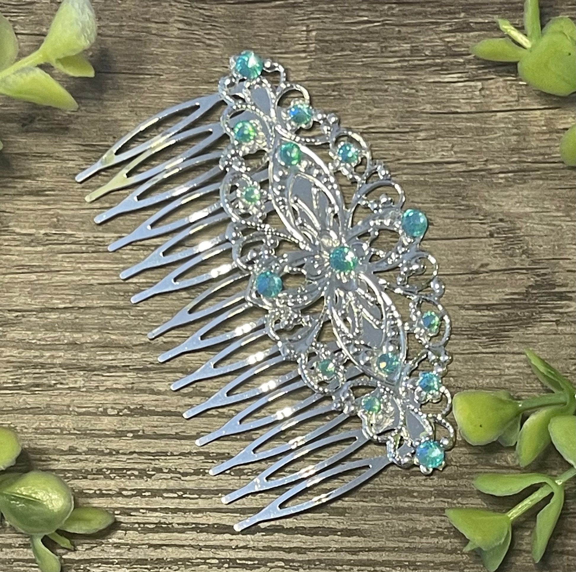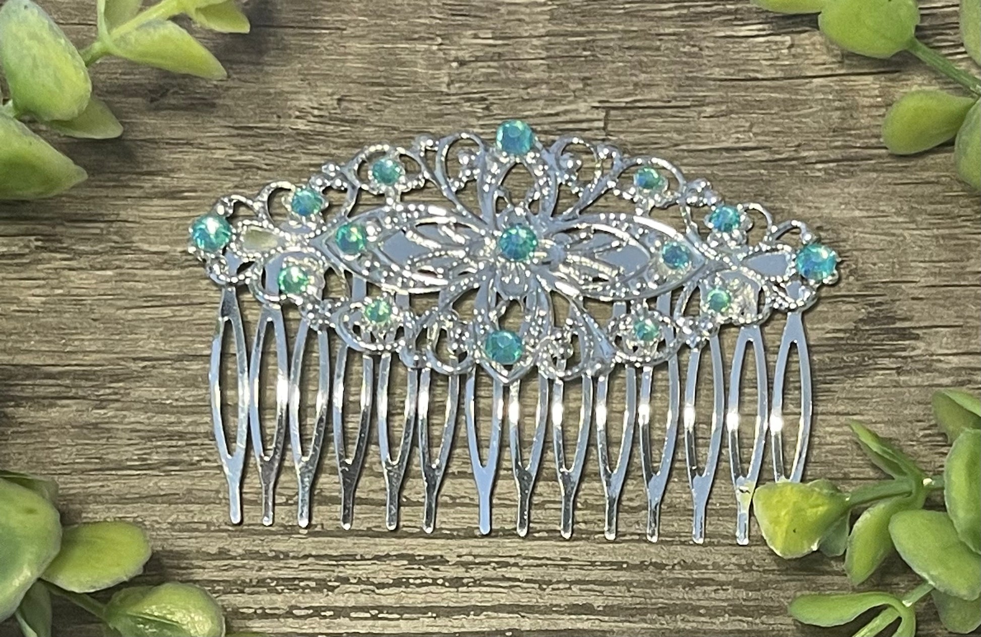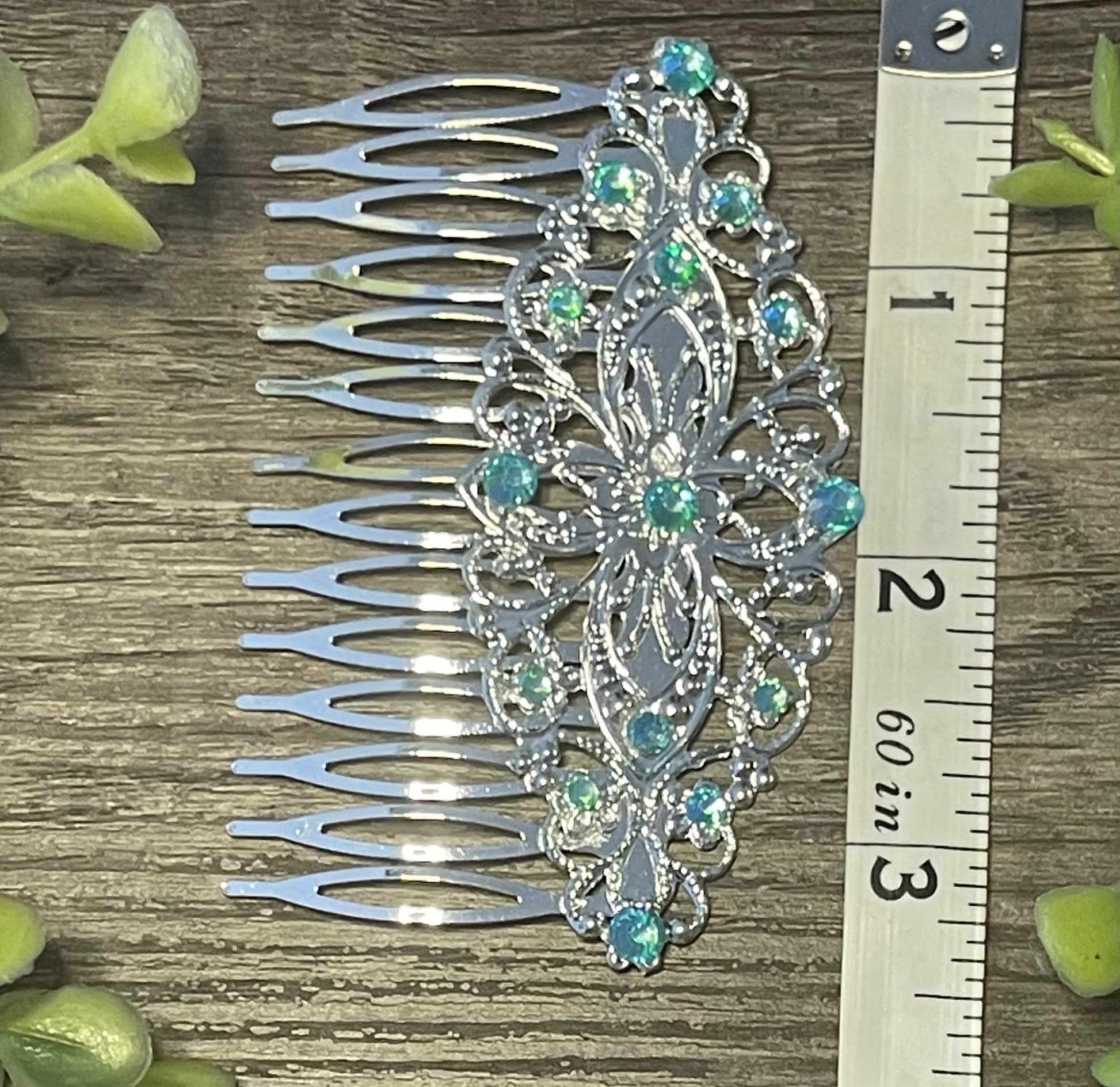 Aqua blue crystal rhinestone Comb on 3.5” silver Metal Hair Comb accessory Handmade Retro Bridal Party Prom