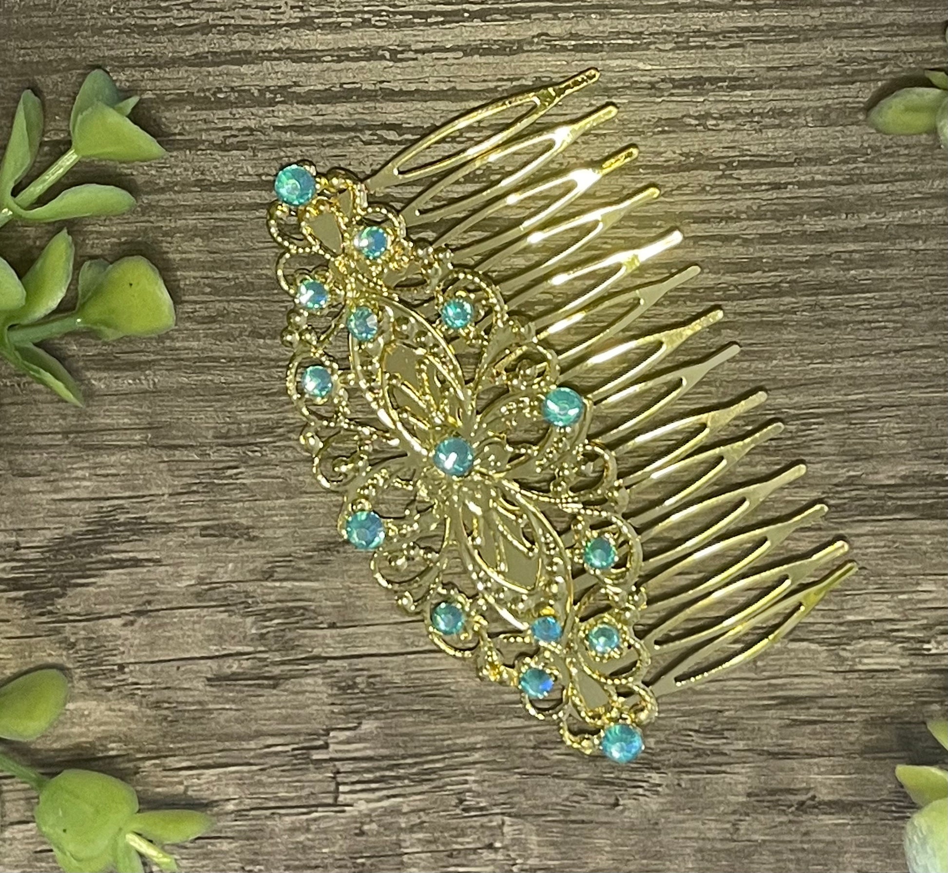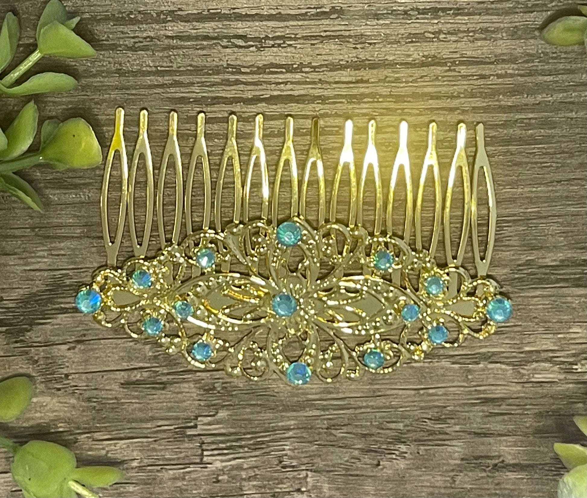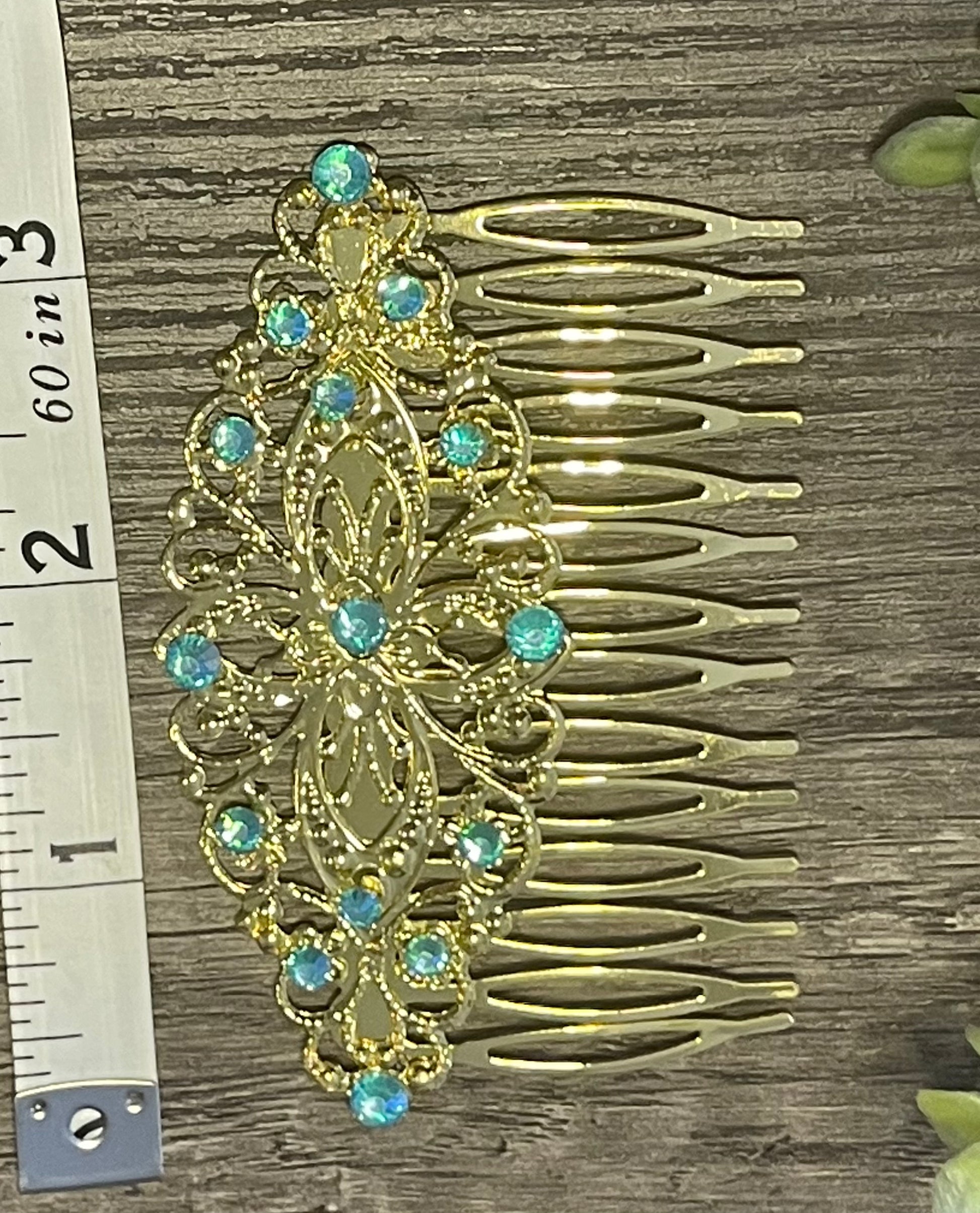 Aqua crystal rhinestone Comb on 3.5” antique Metal Hair Comb accessory Handmade Retro Bridal Prom birthday wedding bridal gift