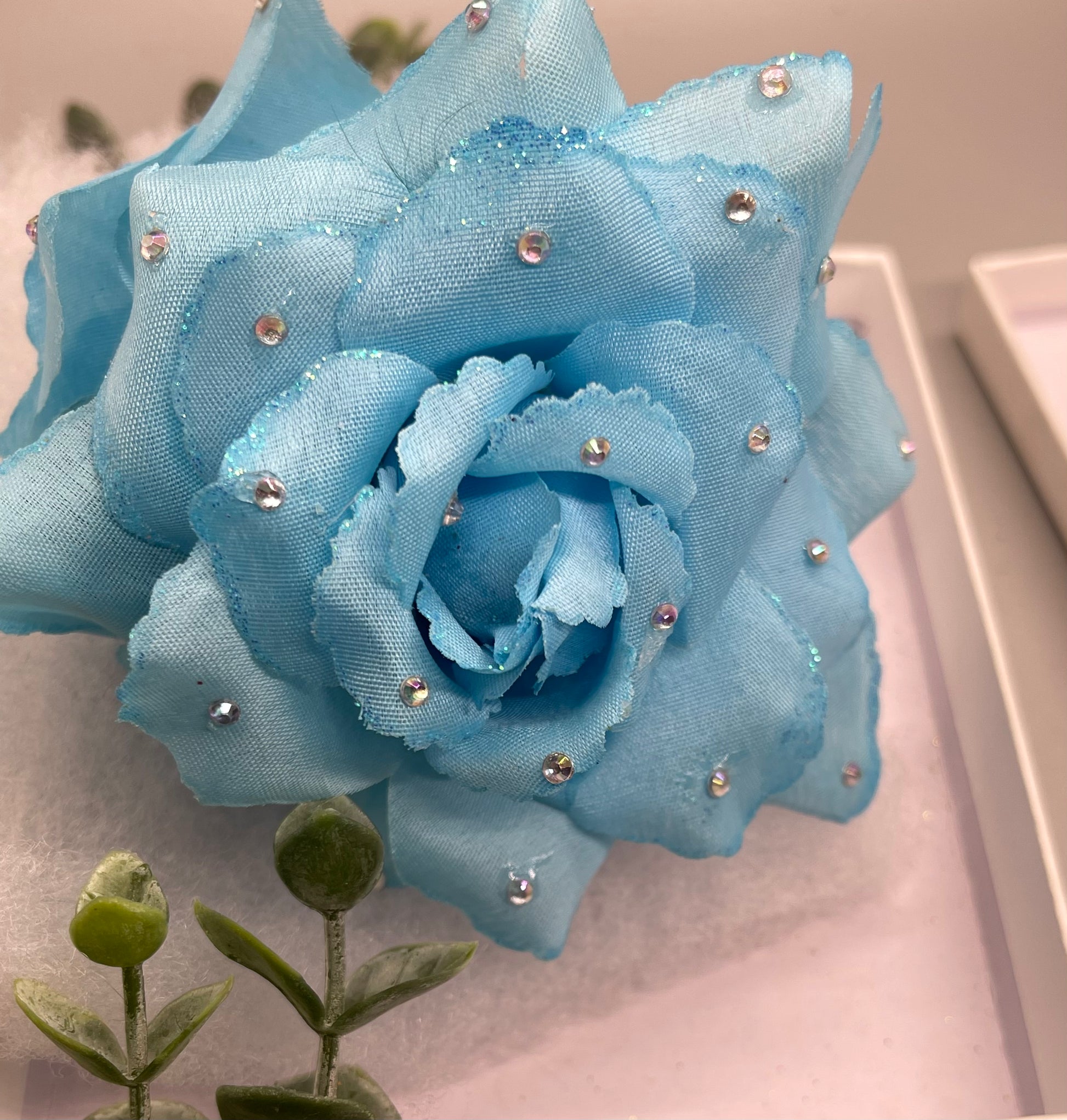 Baby Blue Rose flower crystal rhinestone tiny bit of glitter embellished Claw Jaw clip approximately Large 5.0”W 4.0”L formal hair accessory wedding bridal engagement princess bridesmaid