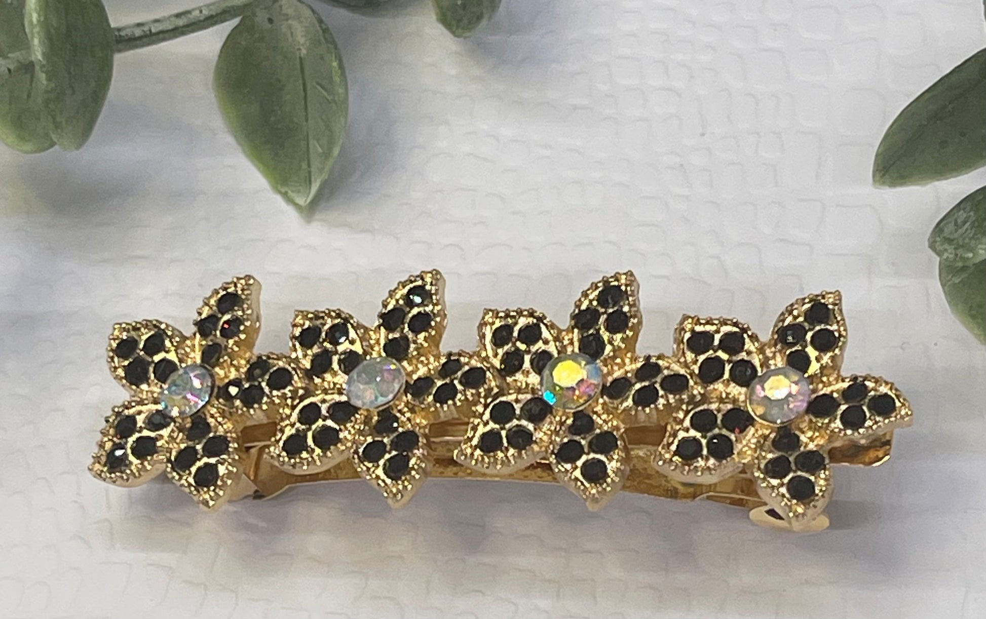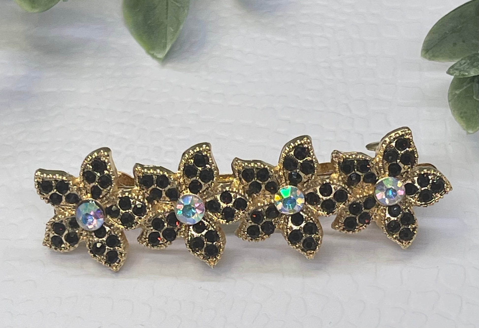 Black Crystal rhinestone flower star barrette approximately 3.0” gold tone formal hair accessories gift wedding bridesmaid