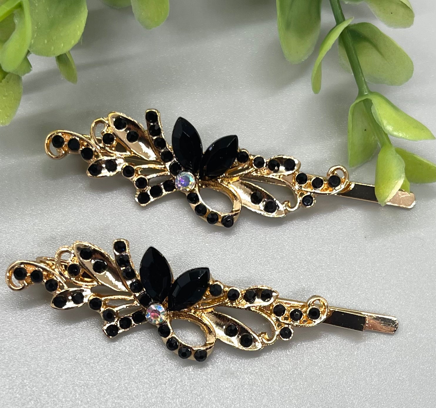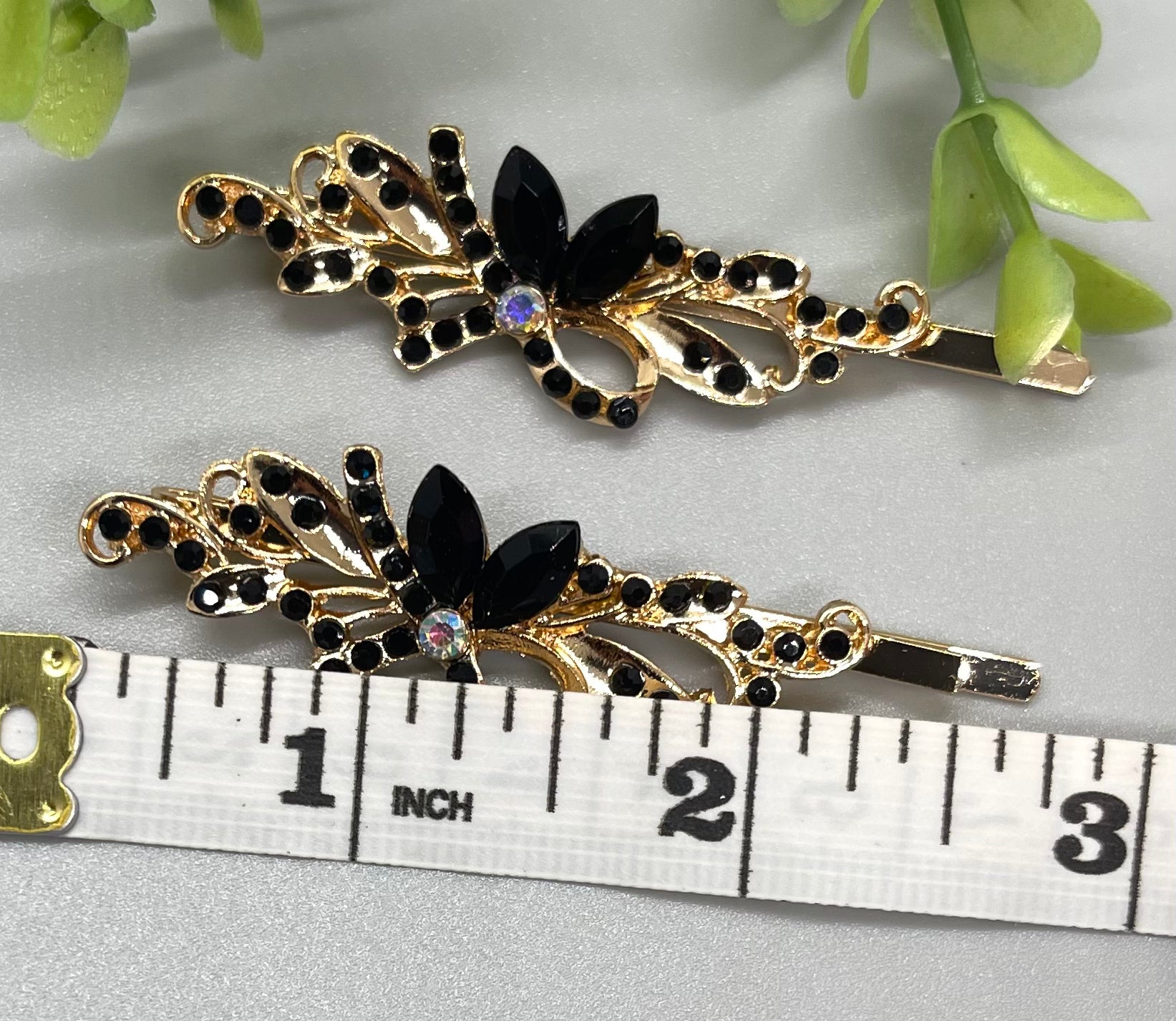 black crystal rhinestone Rose Gold approximately 2.75 hair pins 2 pc set wedding bridal shower engagement formal princess accessory birthday prom