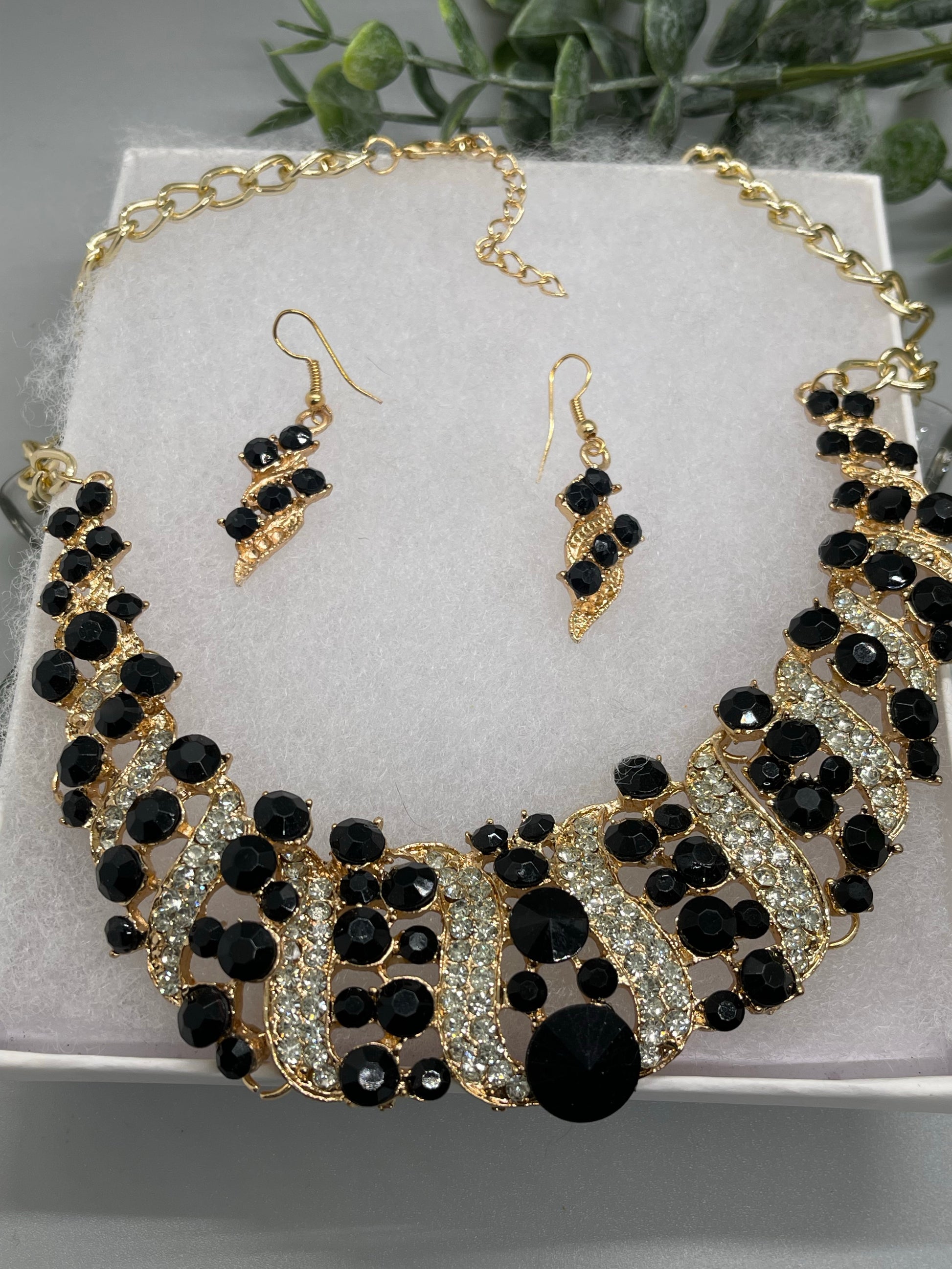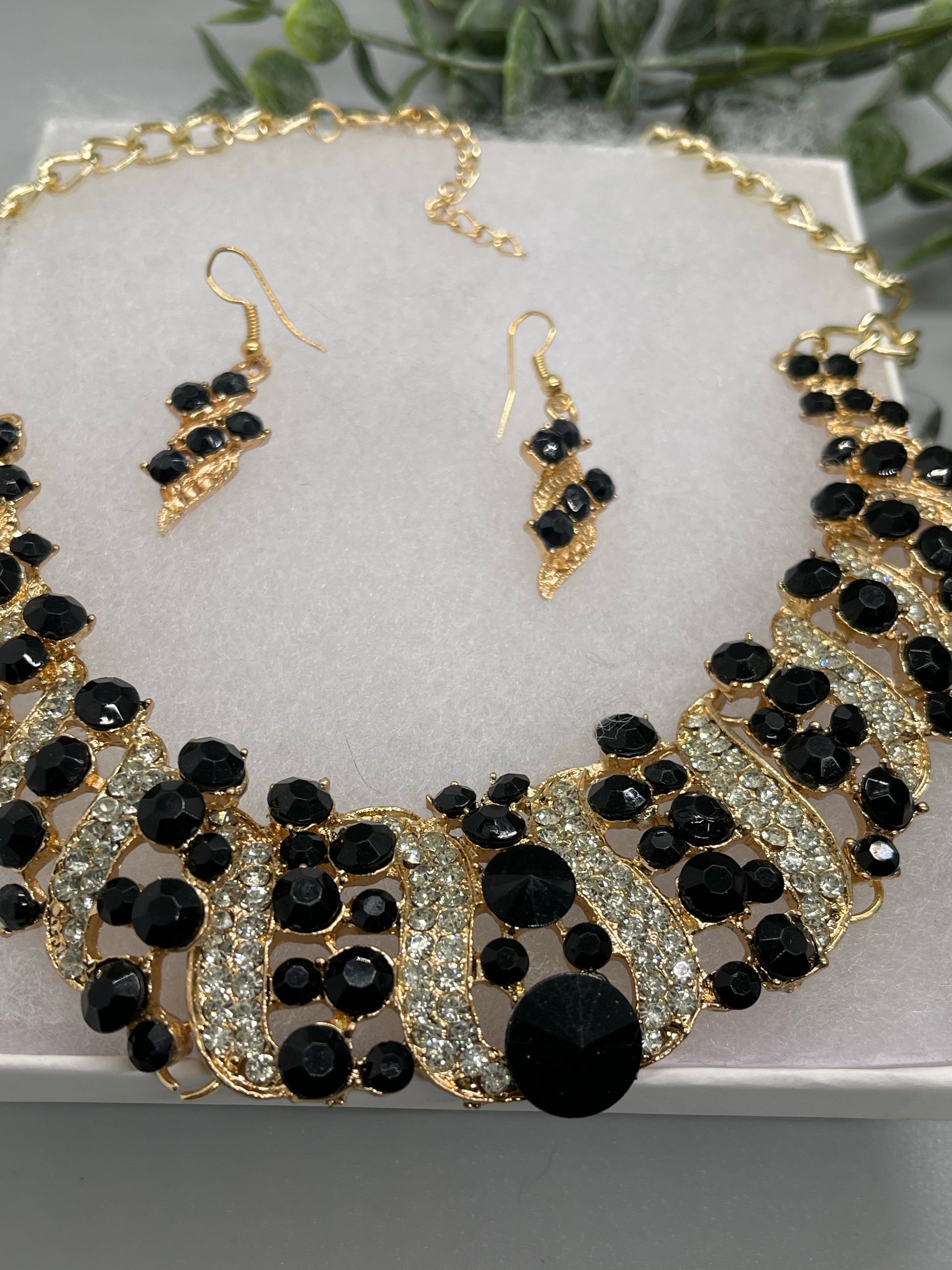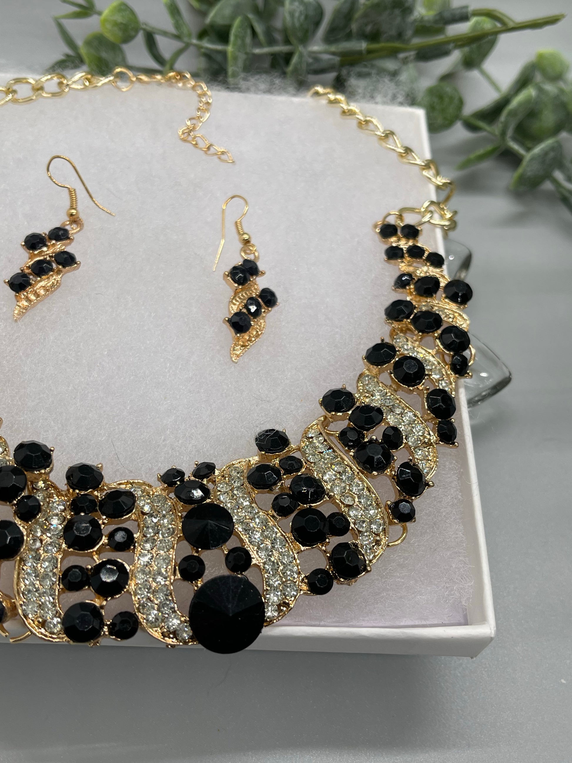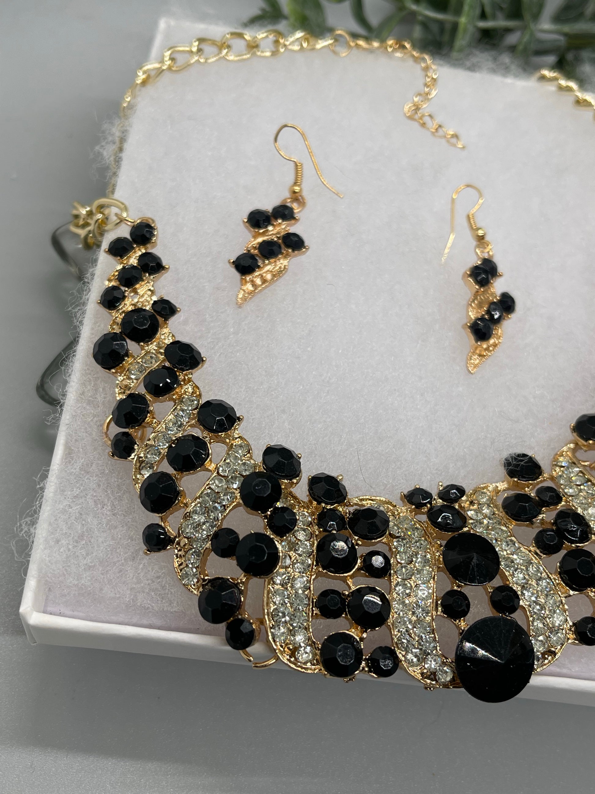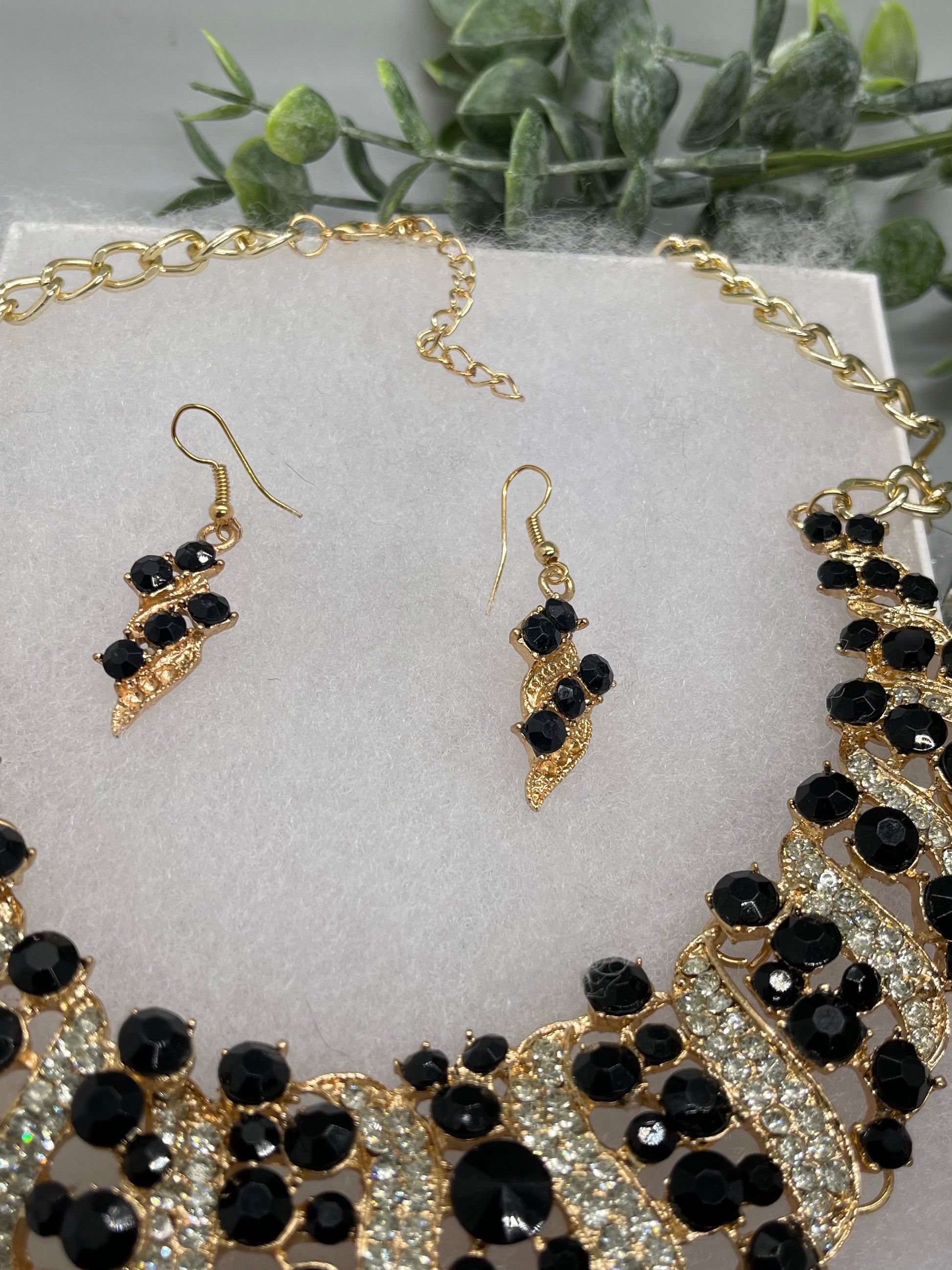 Black gold crystal rhinestone necklace earrings set wedding engagement formal accessory