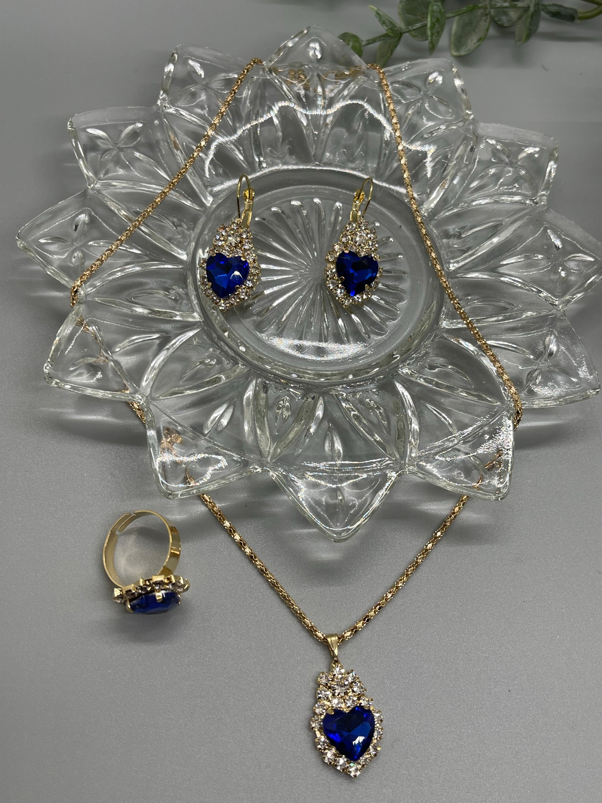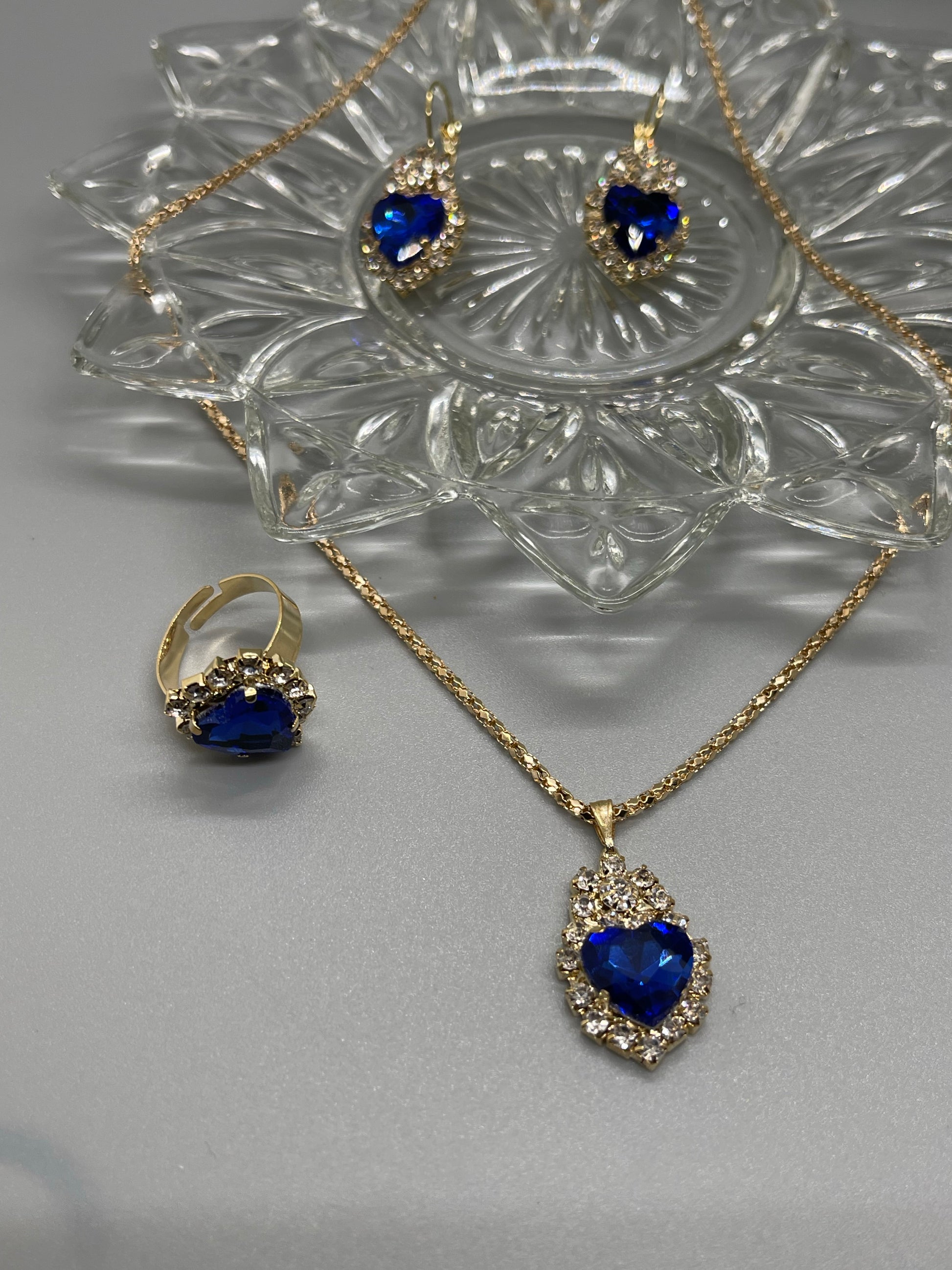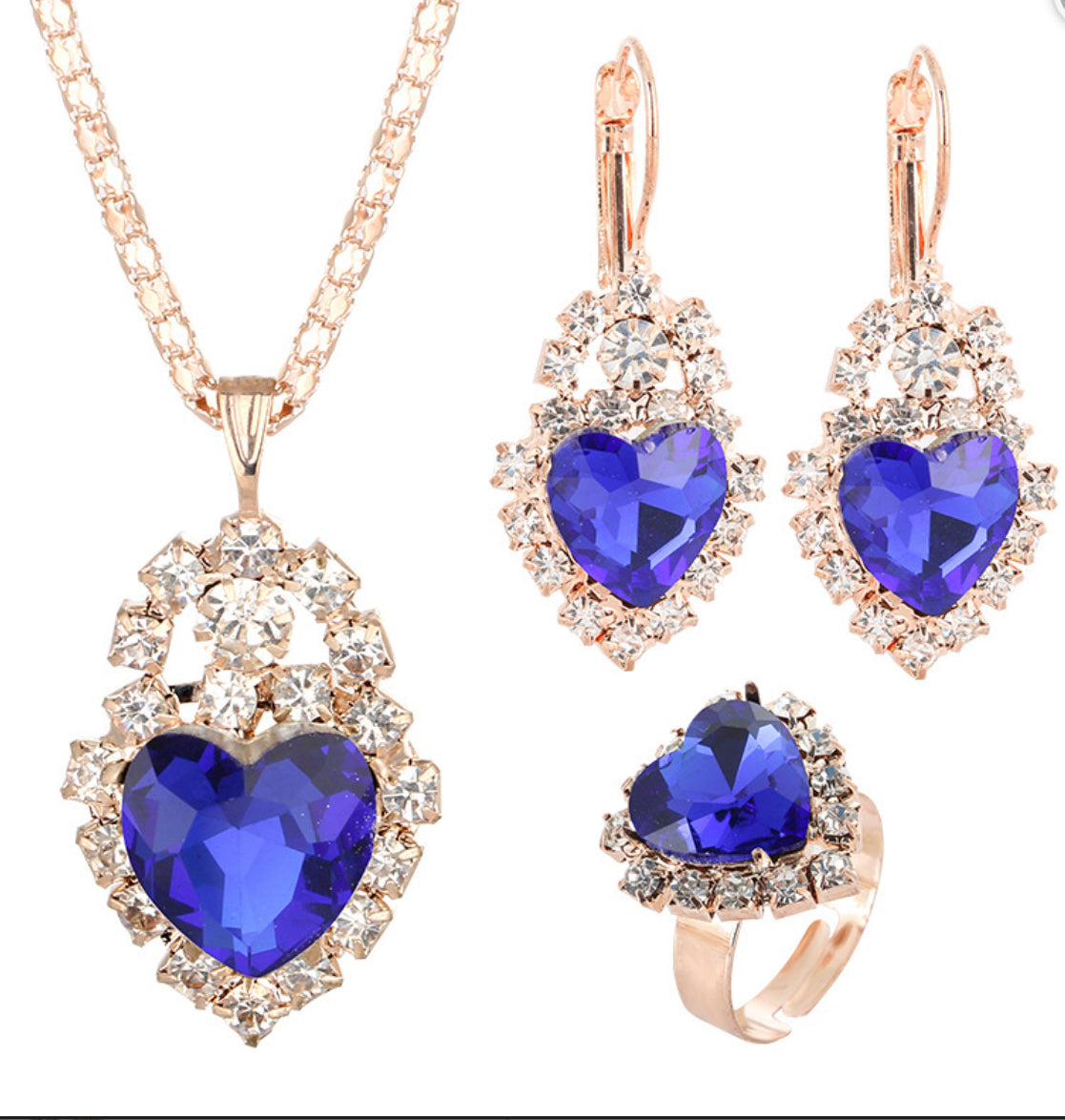 Blue sapphire crystal hearts rhinestone gold necklace earrings ring set