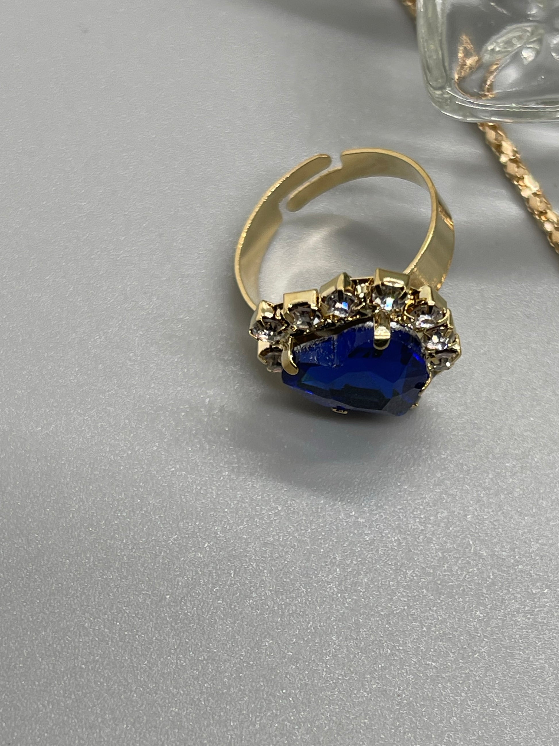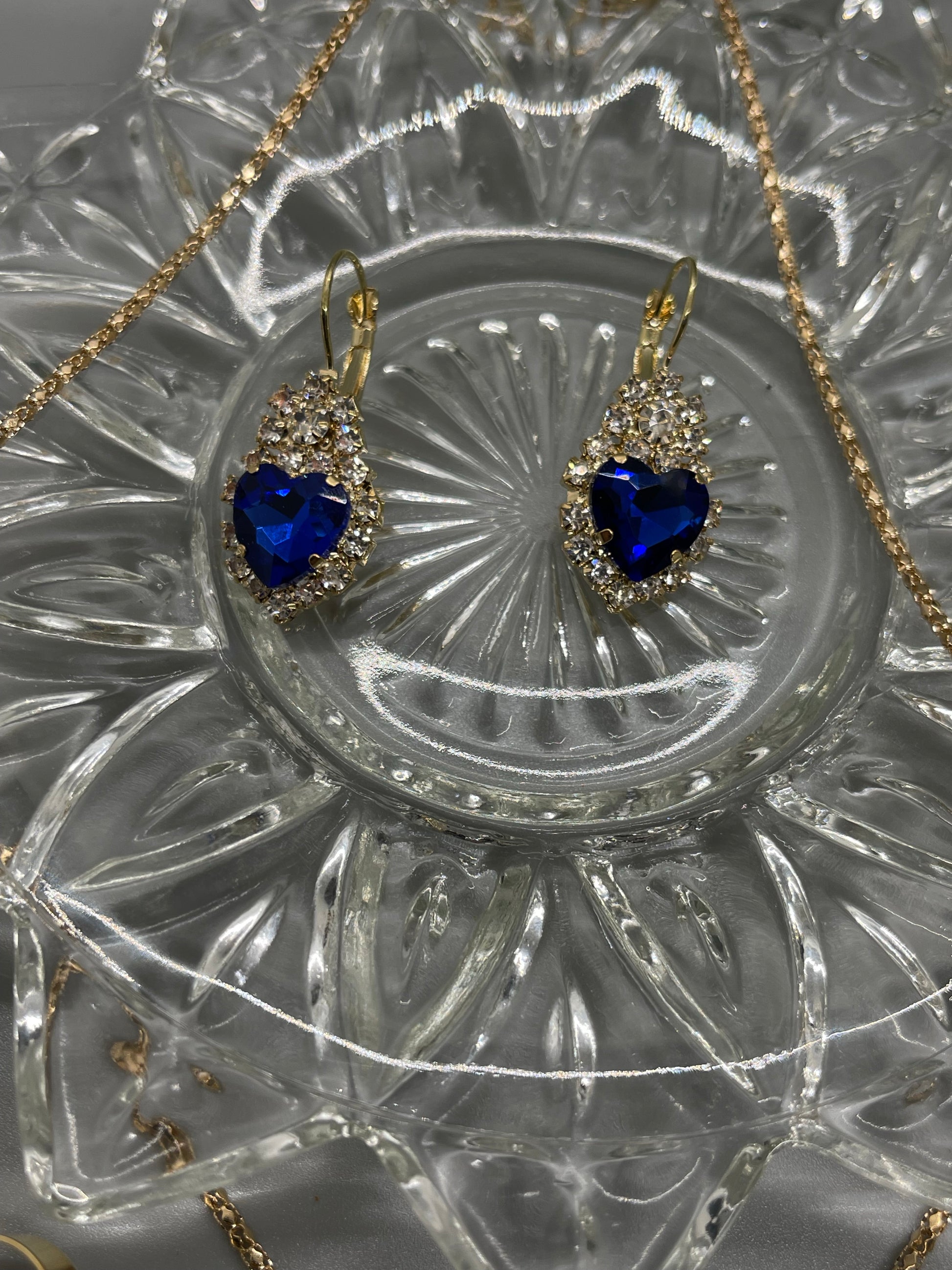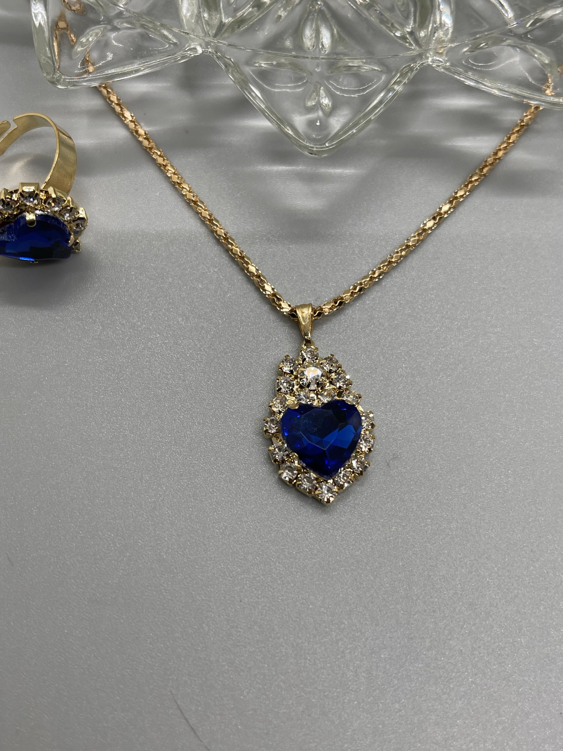 Blue sapphire crystal hearts rhinestone gold necklace earrings ring set