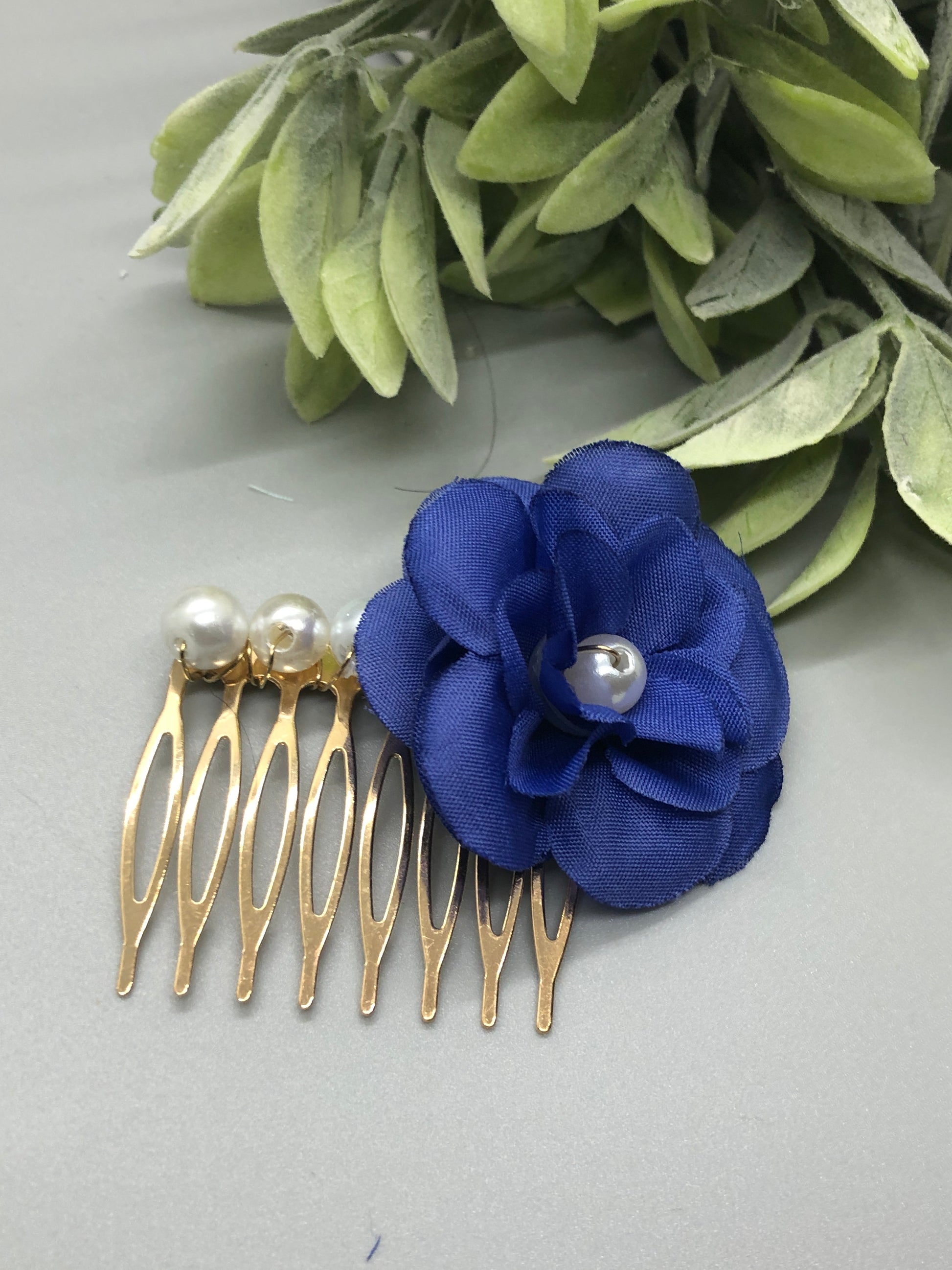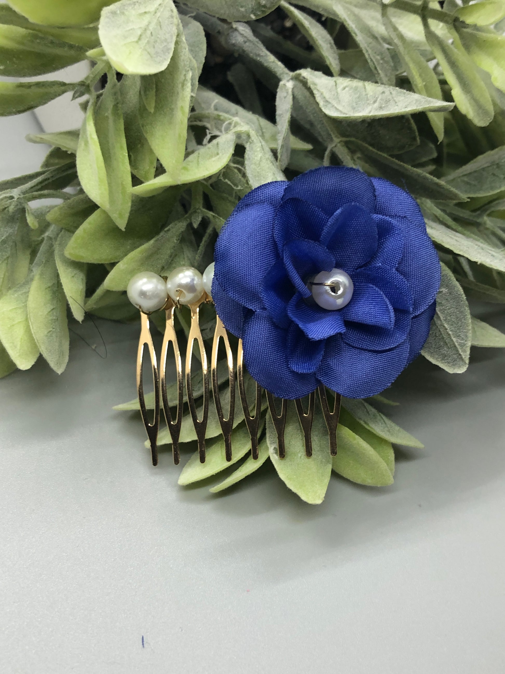 Navy Blue Flower White Beads 2.0" Metal Side Comb Retro Vintage Style Party Wedding Prom Birthday Or Everyday Wear