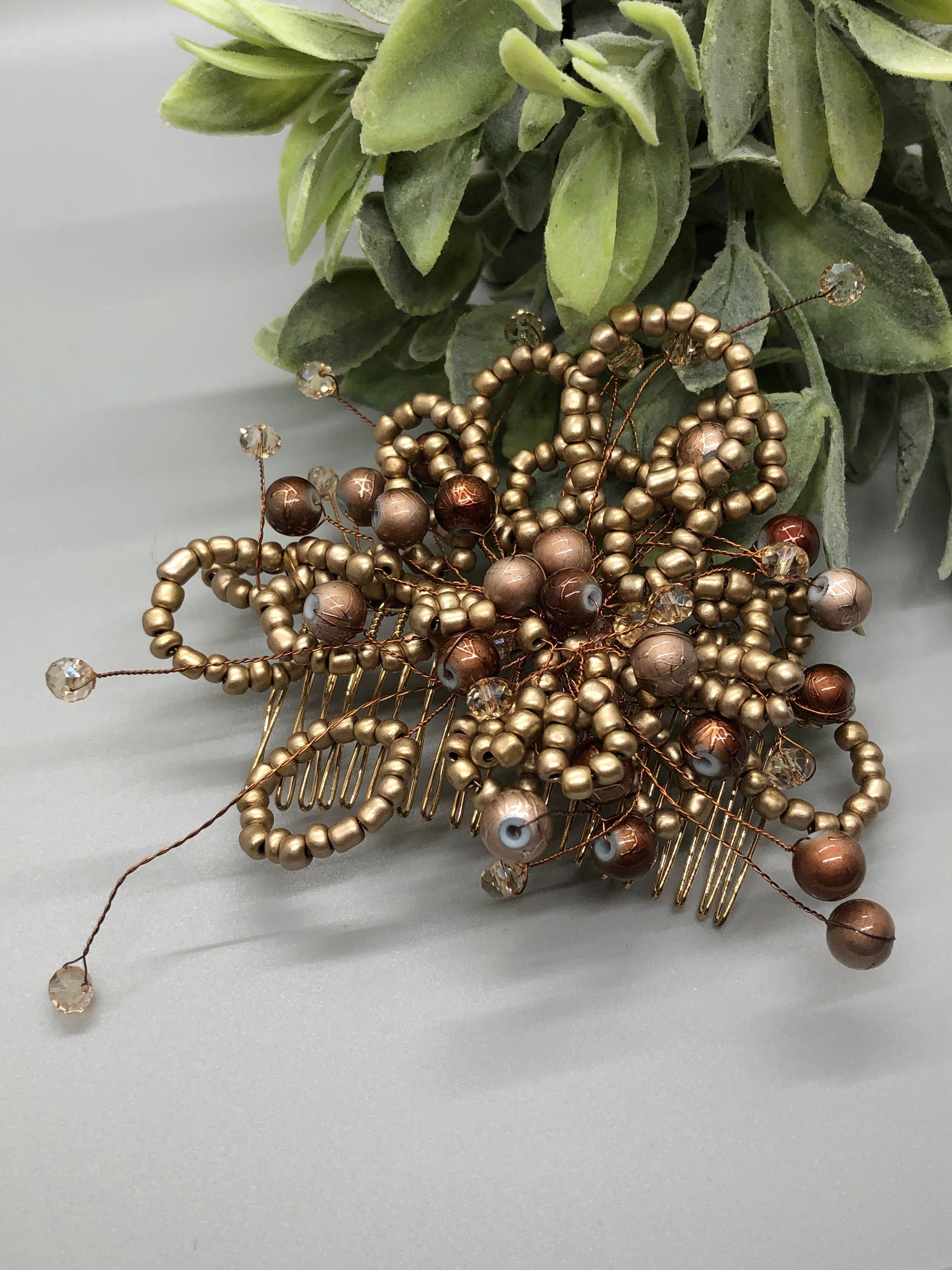Bronze Beaded Hair Vine on a Gold Tone Metal 3.5" Comb Handmade By Hairdazzel Retro Bridal Party Prom Birthday
