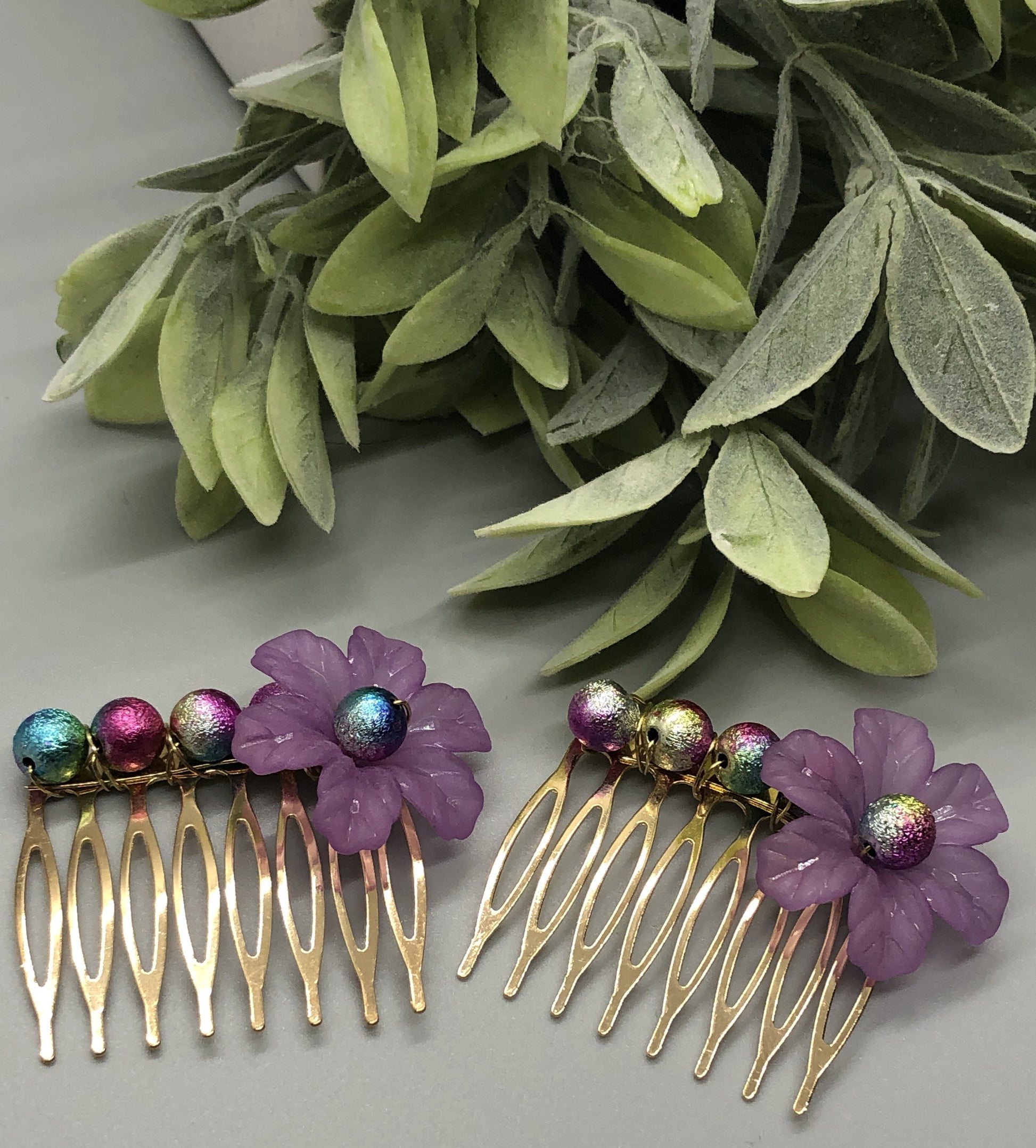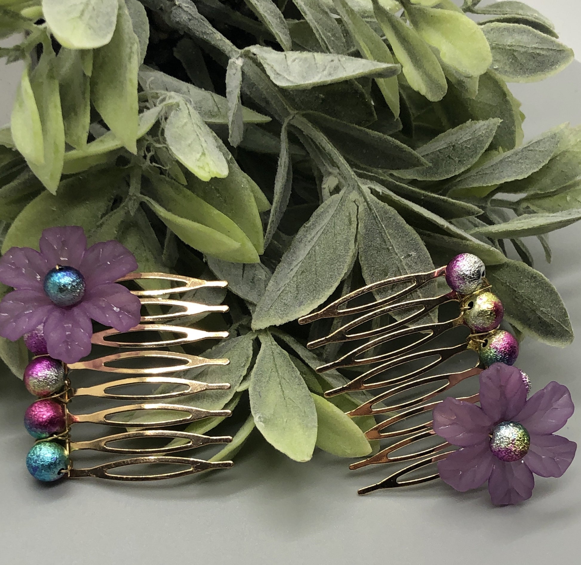 Purple Acrylic Flower Peacock Multi Color Beads 2.0" Metal Side Comb Retro Vintage Style 2 pc