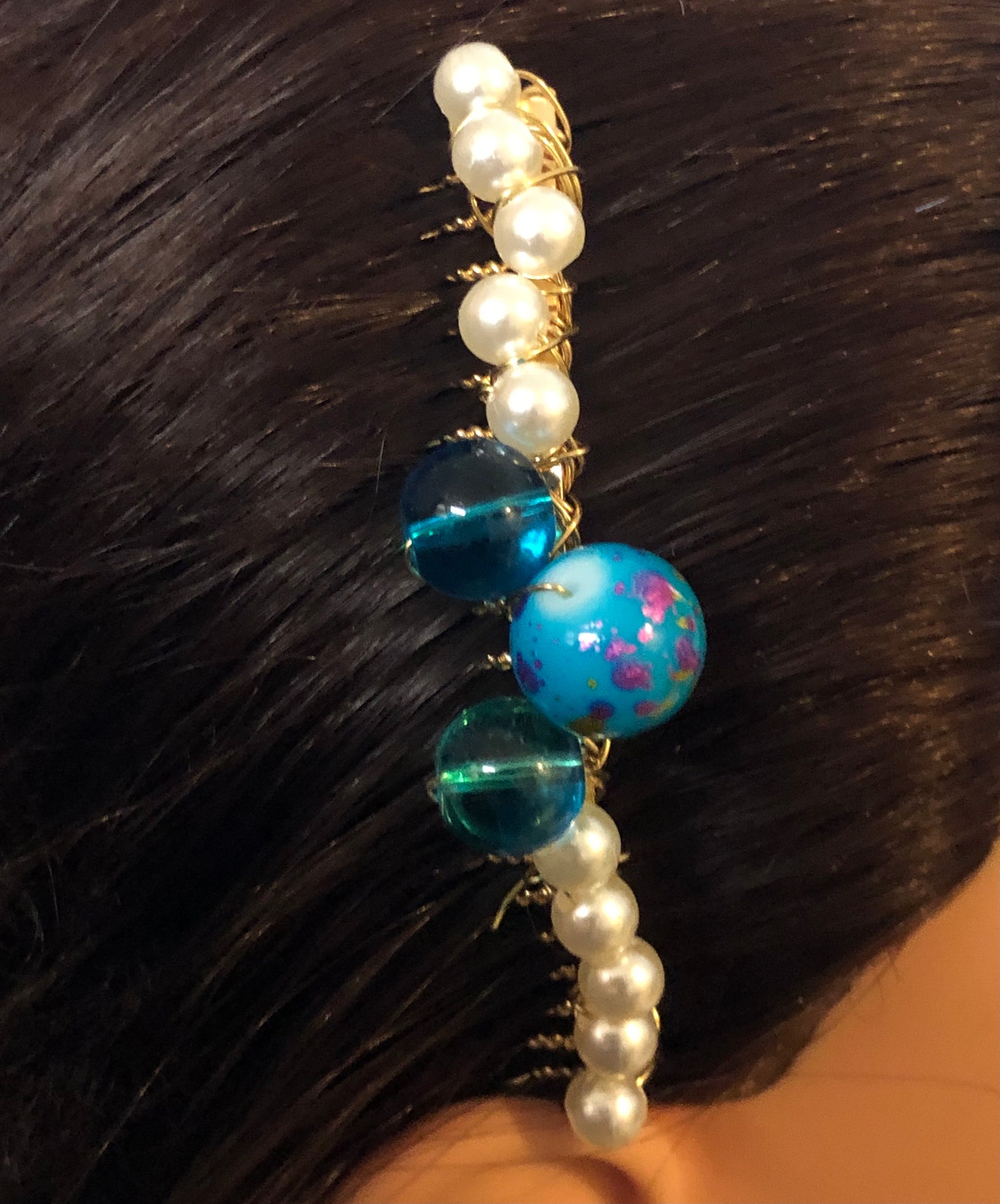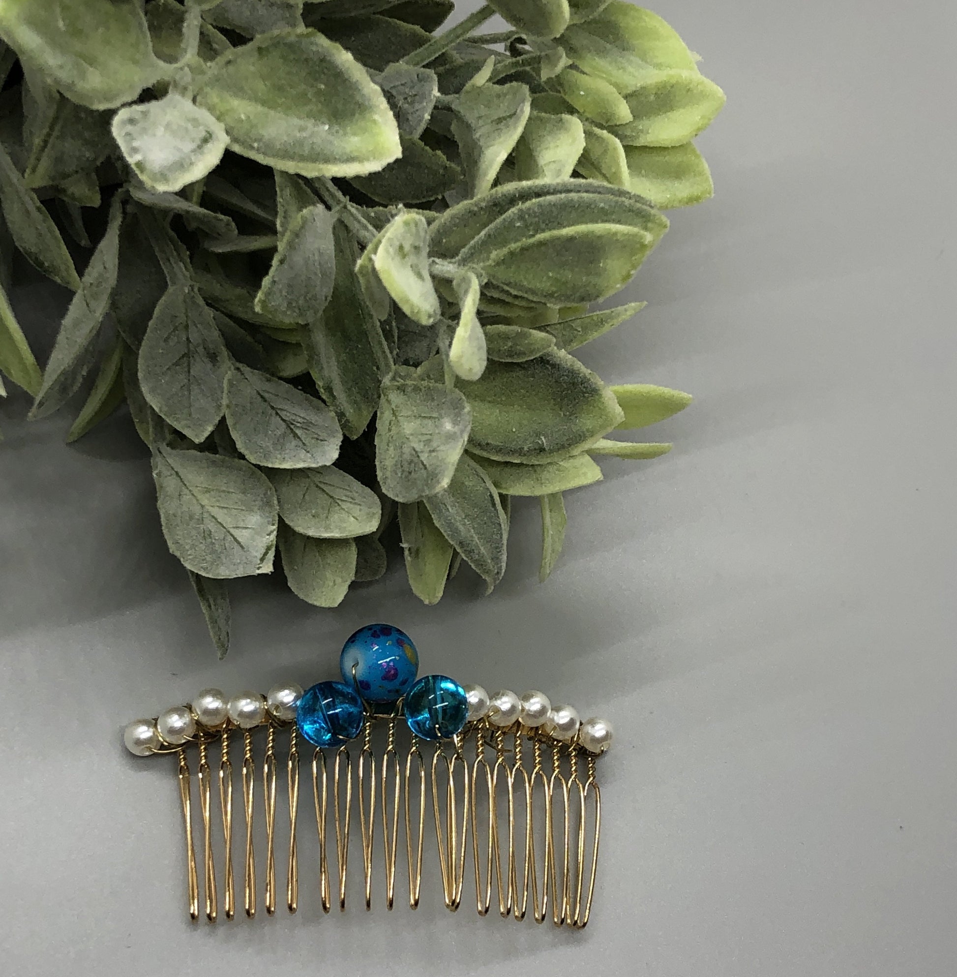 Blue White Marbel ball Beaded on a Gold Metal 3.5" Comb Handmade By Hairdazzel Retro Bridal Party Prom Birthday