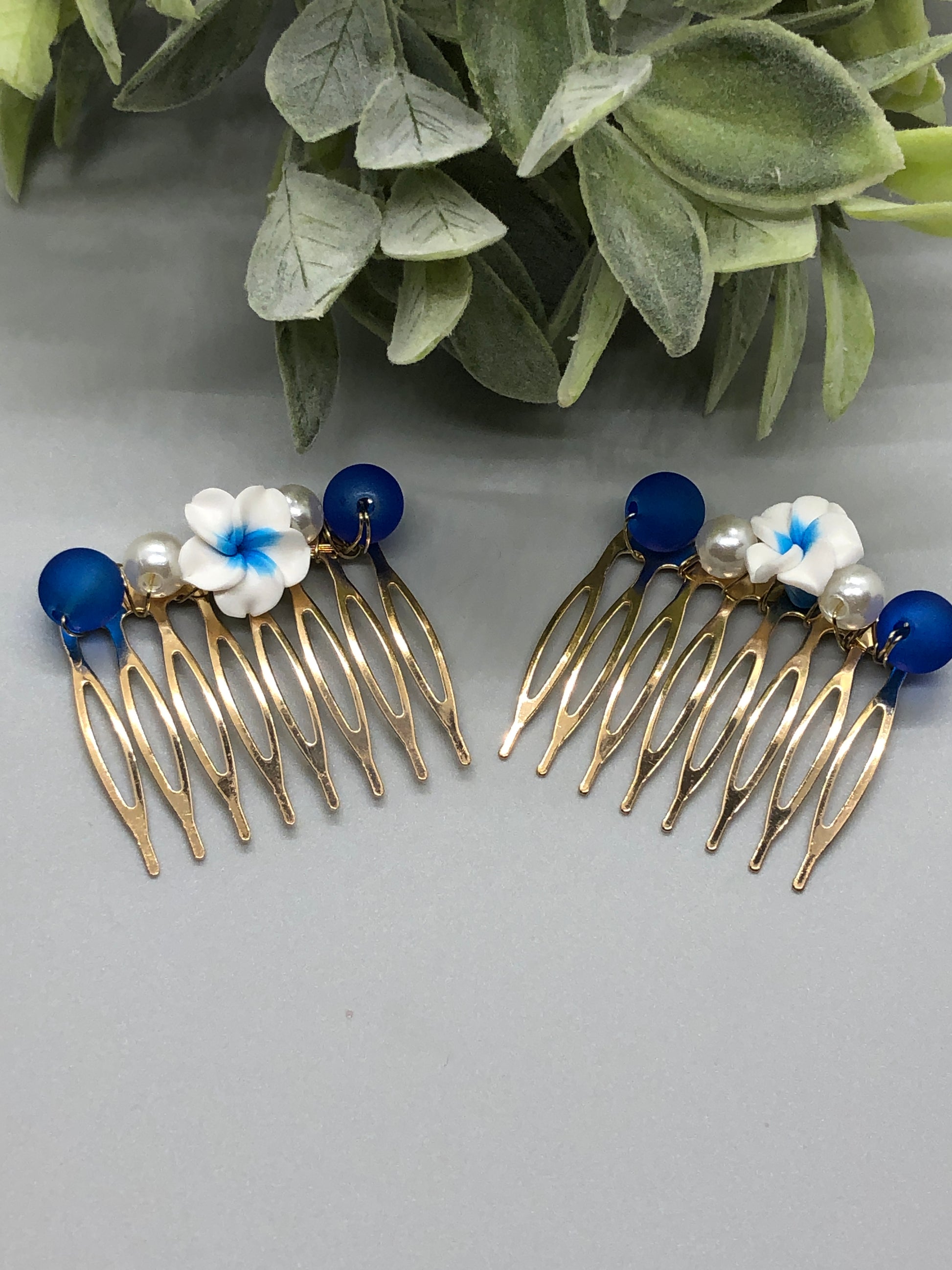 Blue White Flower Navy Blue Beaded on a Gold Tone Metal 2.0" Comb Handmade By Hairdazzel Retro Bridal Party Prom Birthday