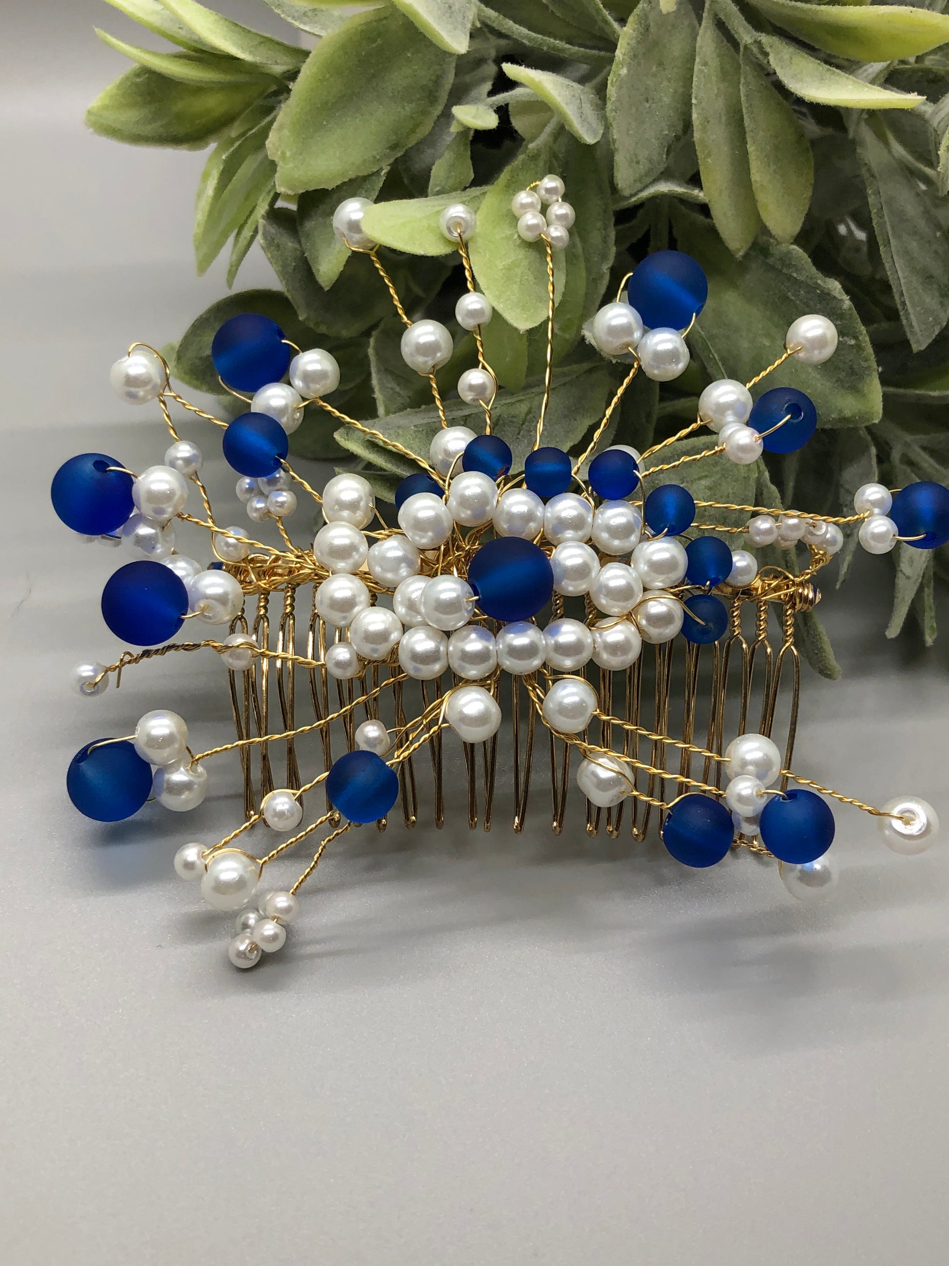 Navy Blue White Beaded Hair Vine on a Gold Tone Metal 3.5" Comb Handmade By Hairdazzel Retro Bridal Party Prom Birthday