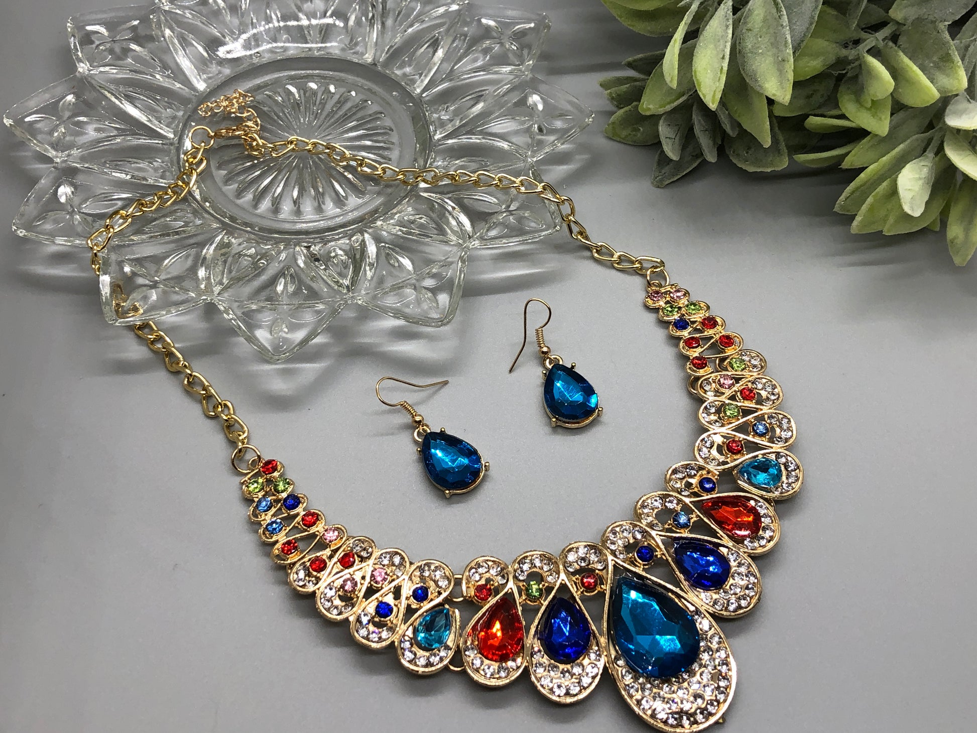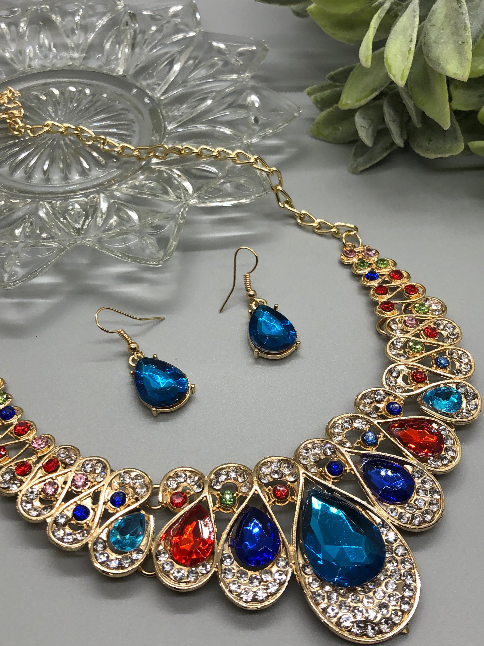 Peacock Multi Color Crystal Rhinestone Necklace Earrings Set Lobster Claps