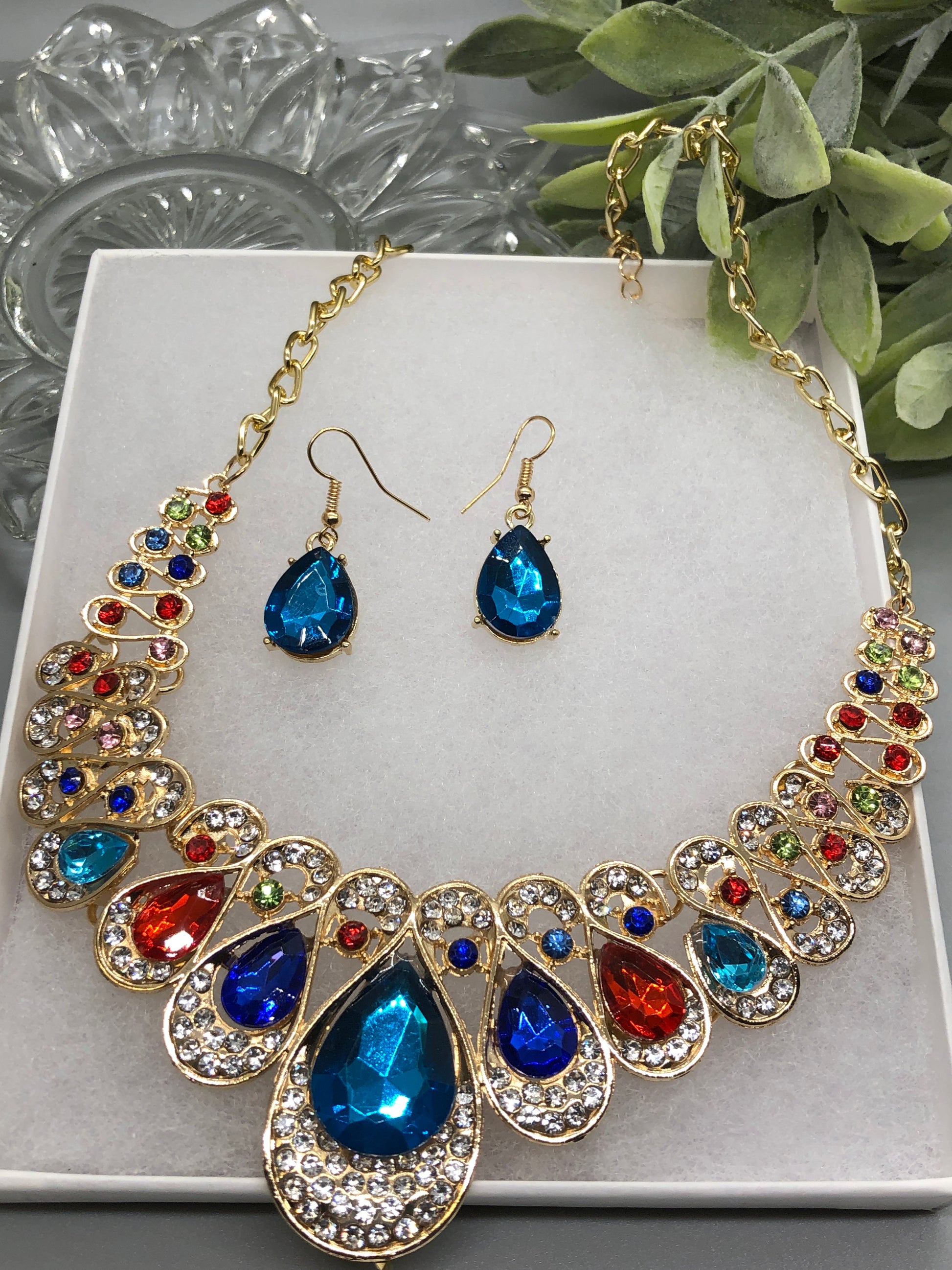 Rainbow Multi Color Crystal Rhinestone Bridal Necklace Earrings Sets Wedding Formal Shower Party Event Accessories #011