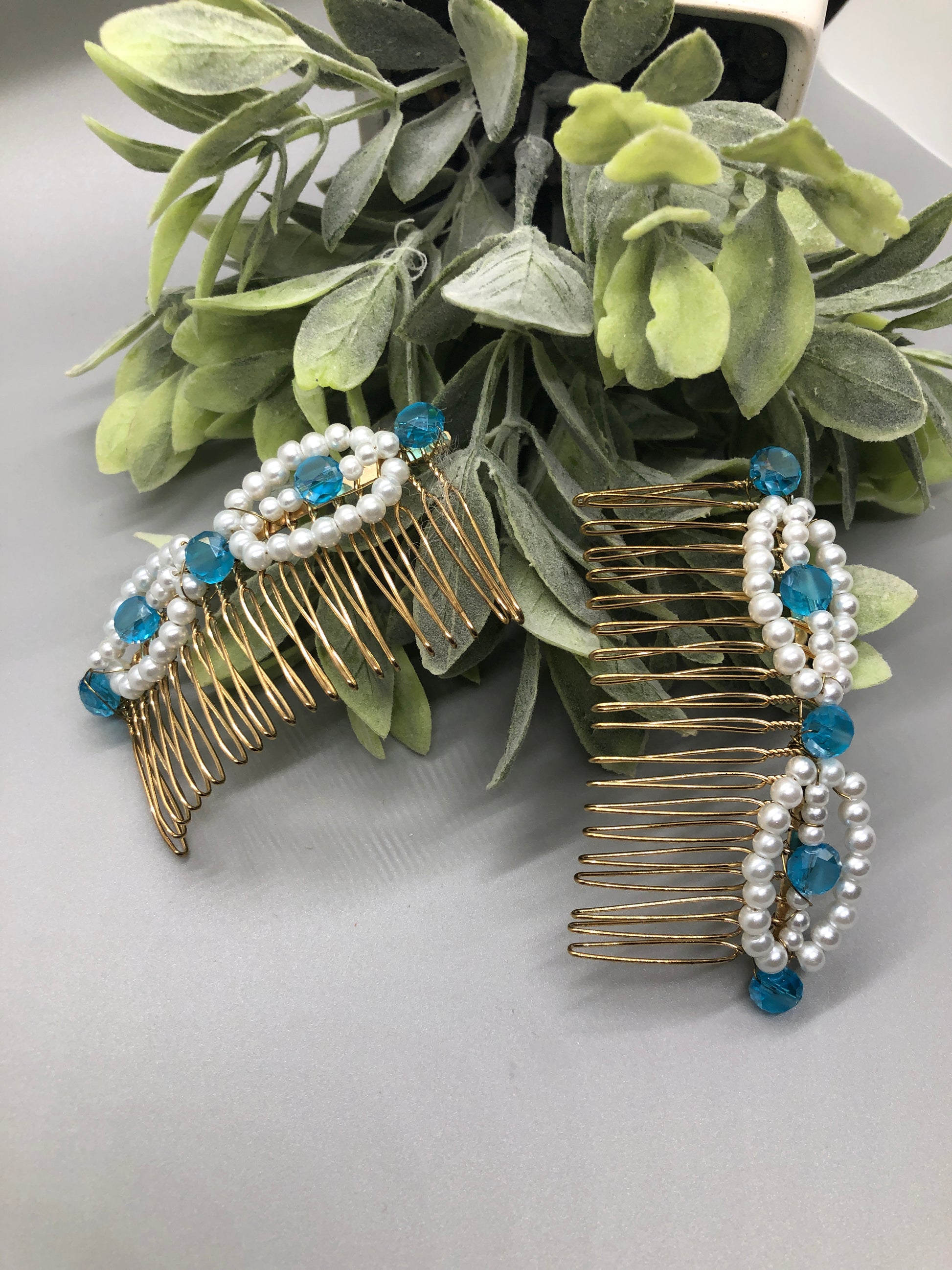 Clear Blue White Beaded Side Hair Comb Gold Metal Hair 3.5" Hair Comb Retro Vintage Style 2 pc