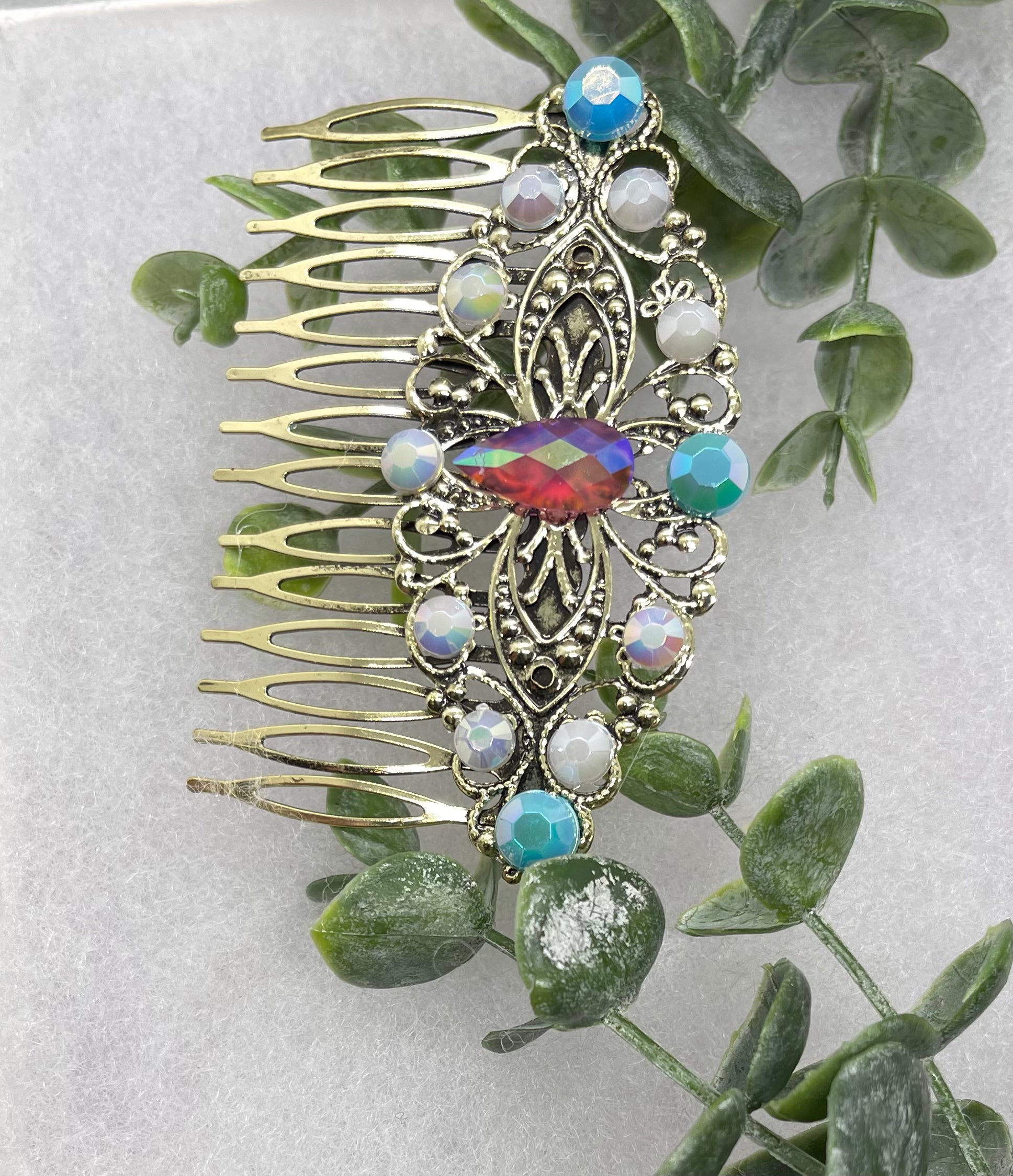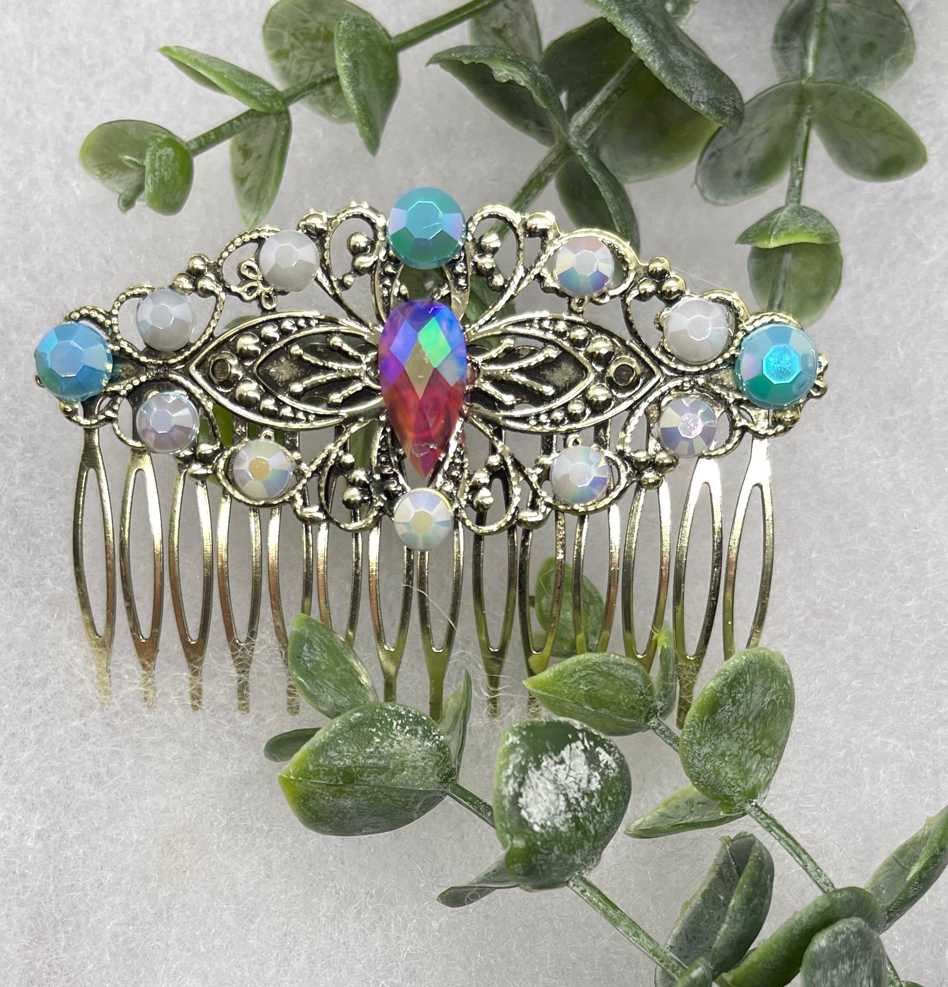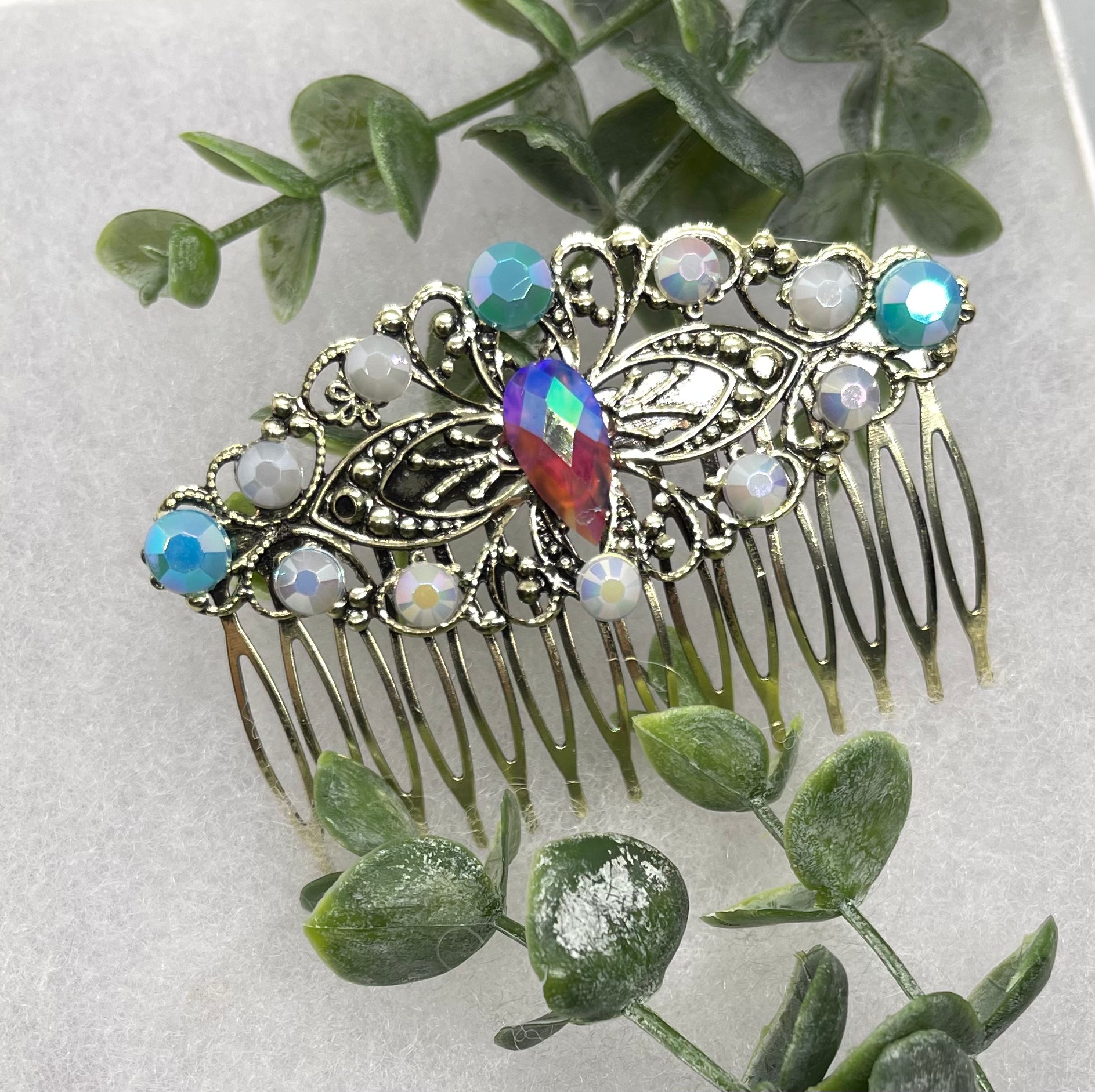 Blue iridescent pearl Vintage Style Crystal Rhinestone 3.5” antique tone Metal side Comb bridal accessories handmade by hairdazzzel wedding accessory