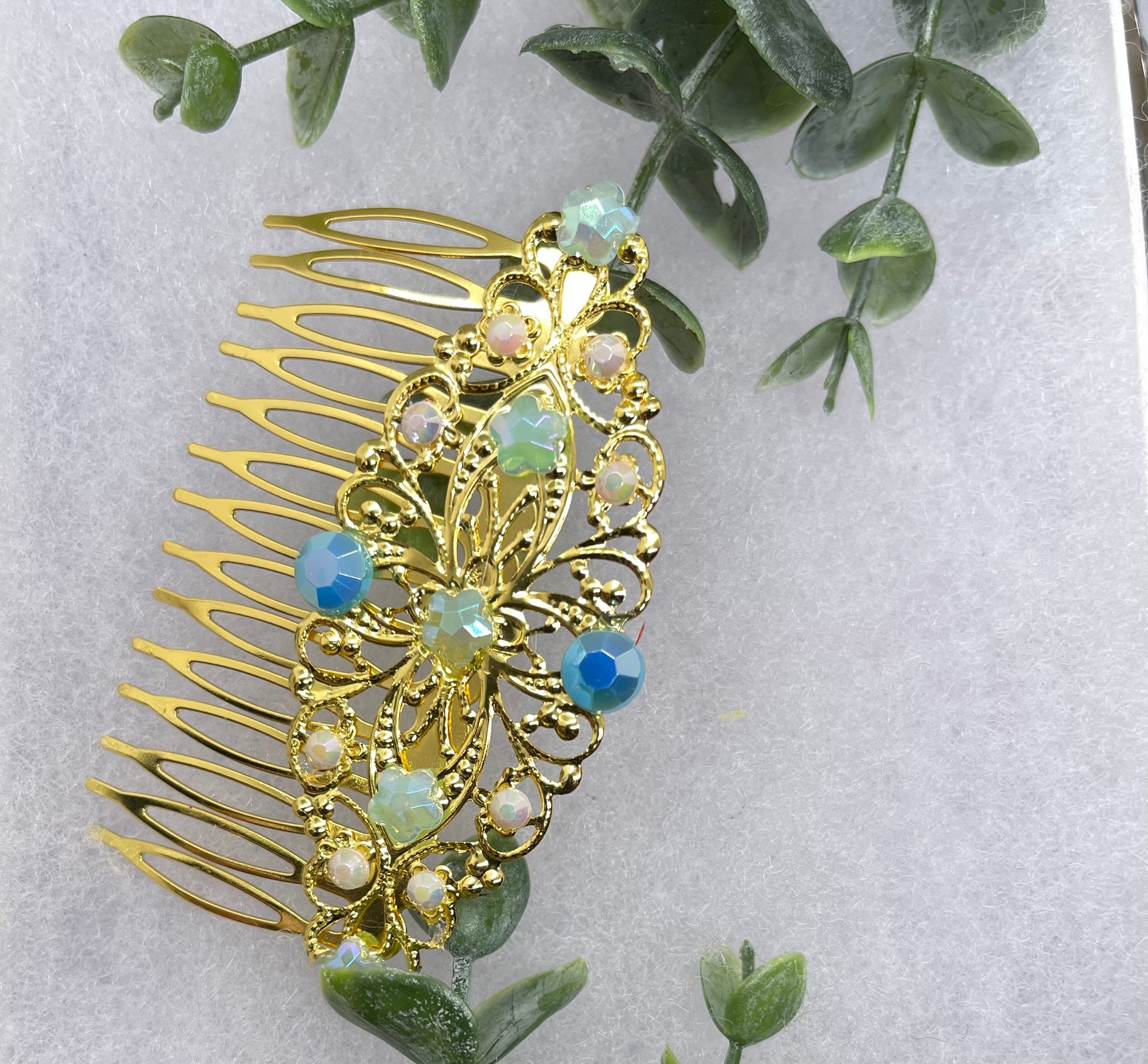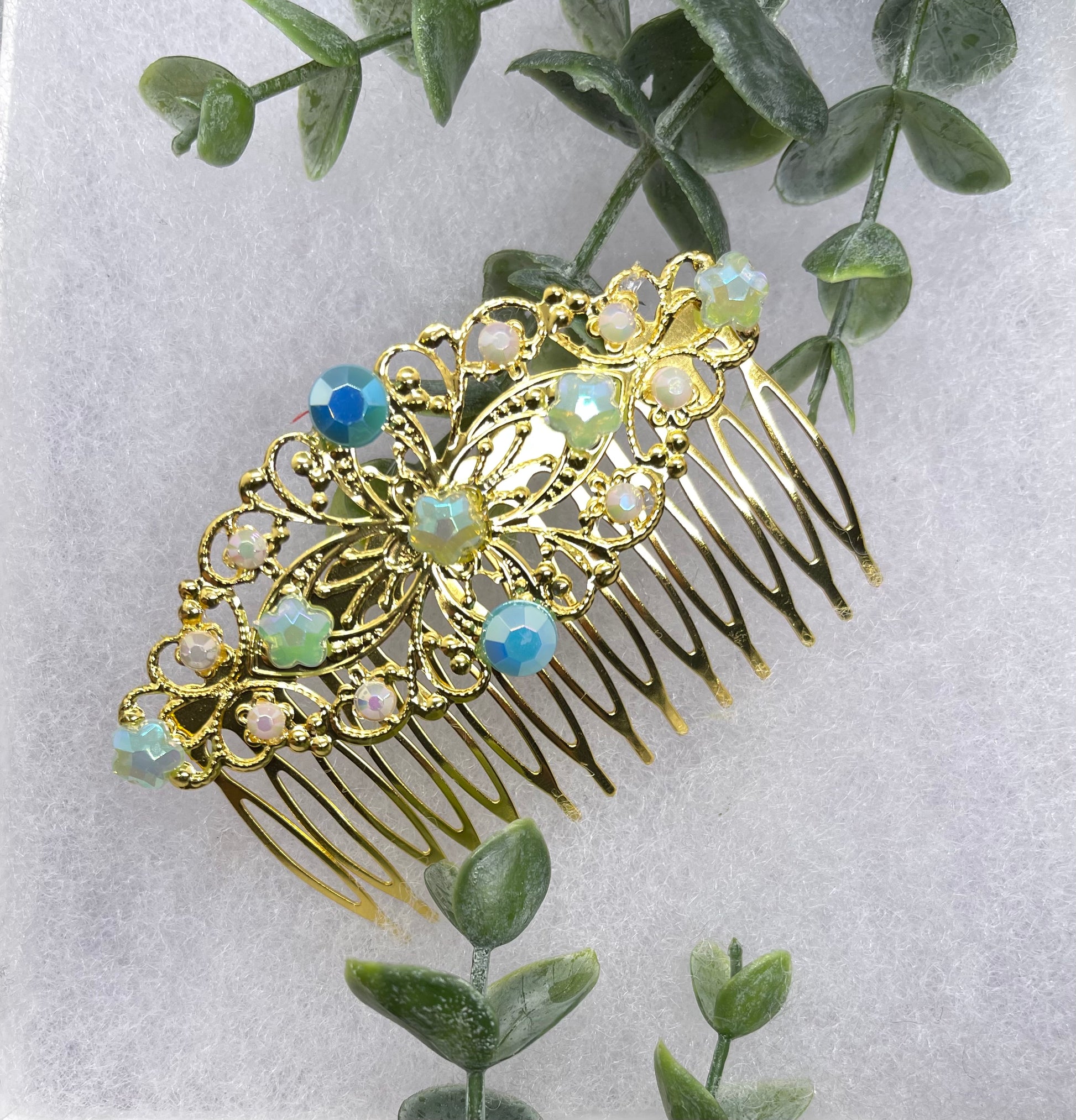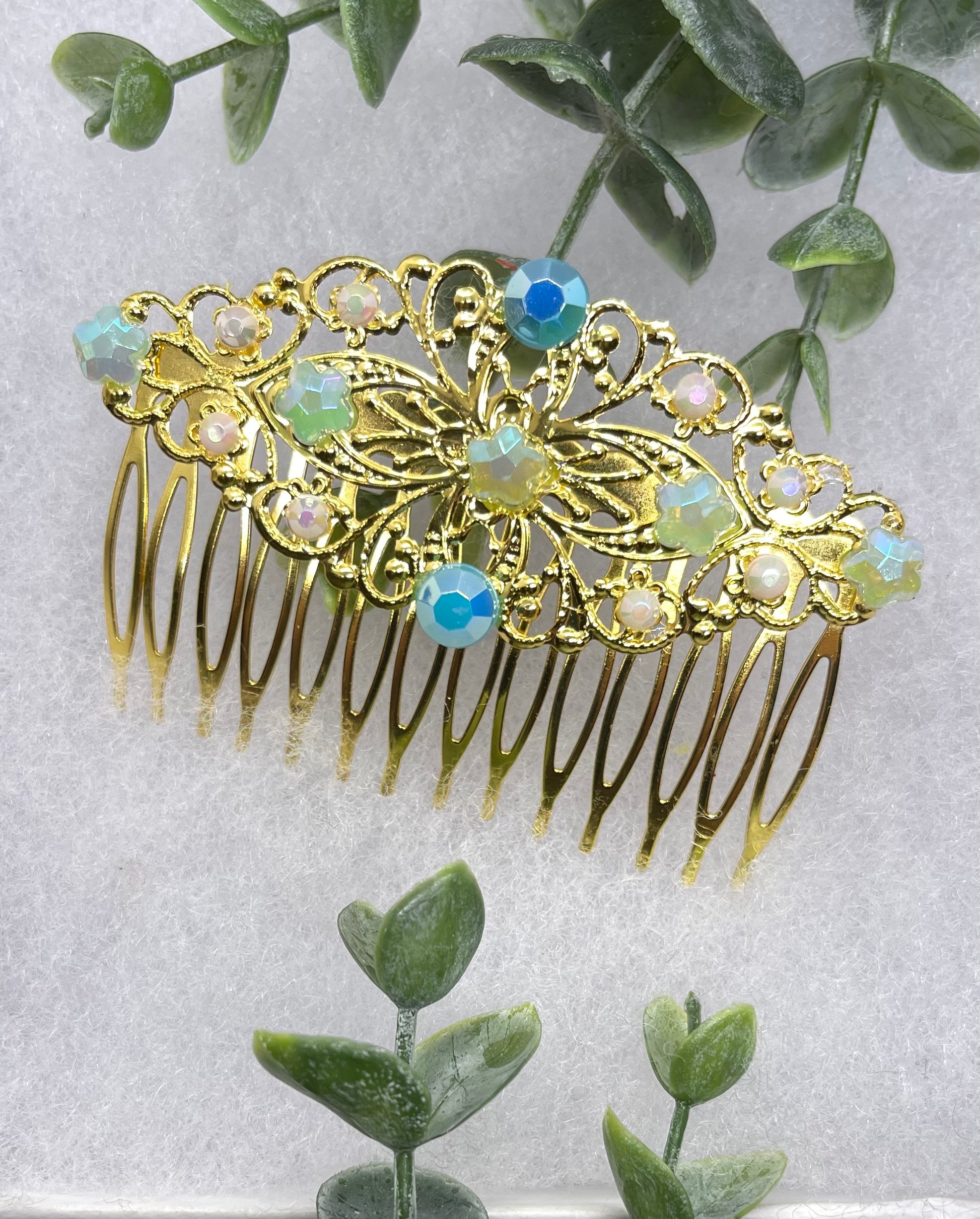 Iridescent blue green Vintage Style Crystal Rhinestone 3.5” antique tone Metal side Comb bridal accessories handmade by hairdazzzel wedding accessory