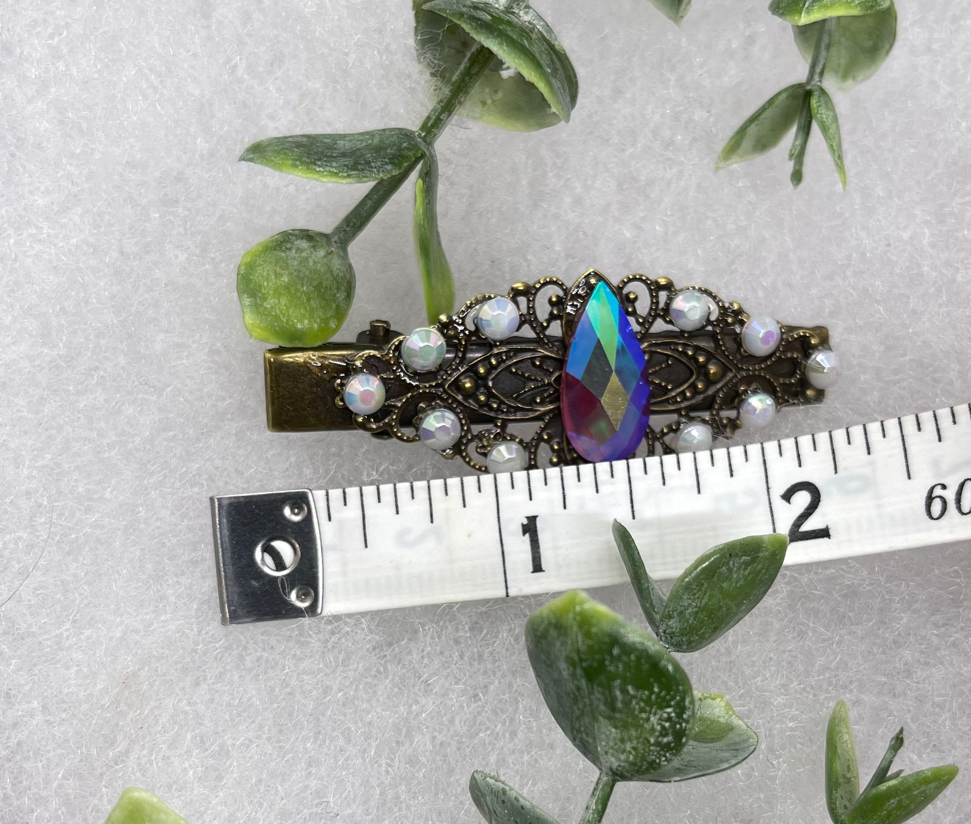 Iridescent Pearl Vintage Style Crystal Rhinestone 2,5” antique tone Metal Alligator clip brid