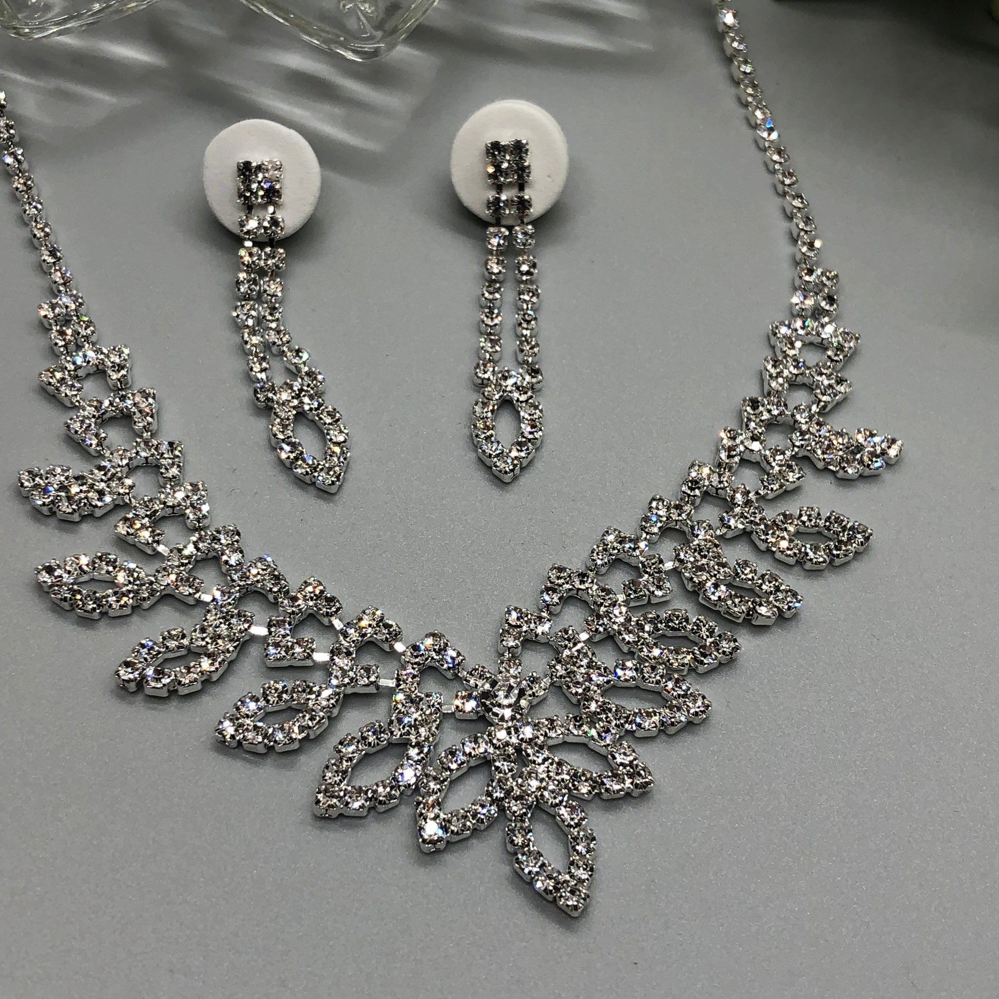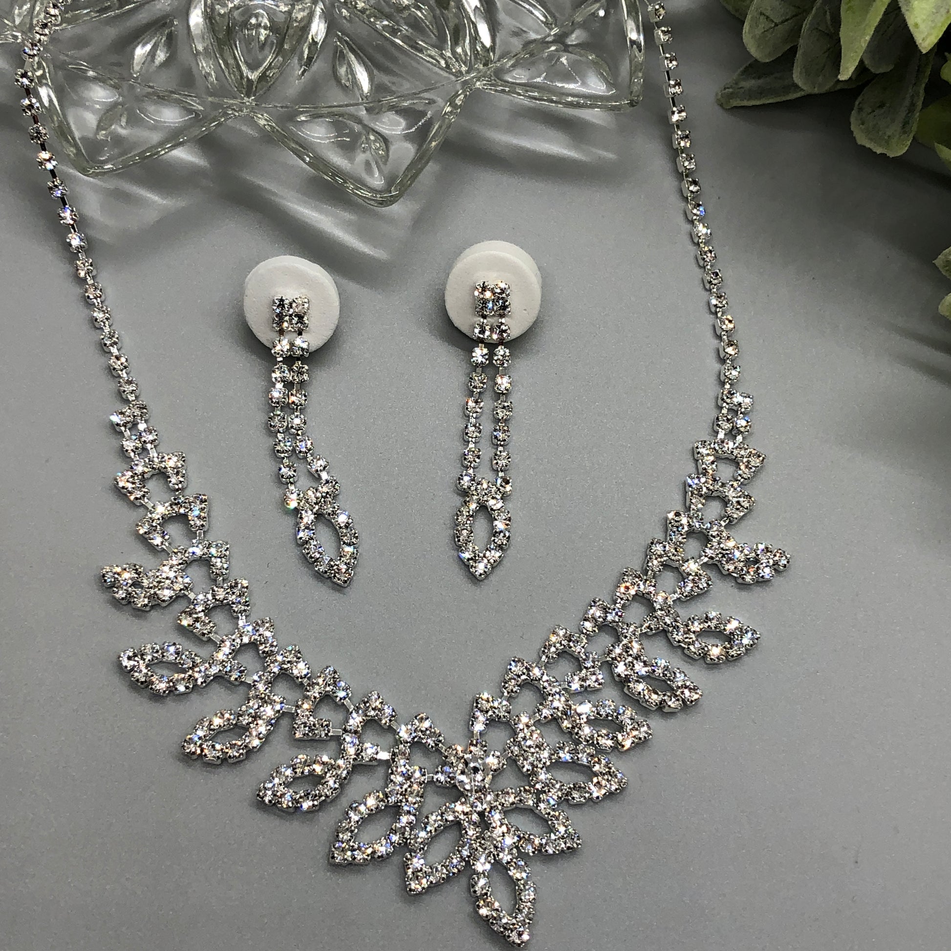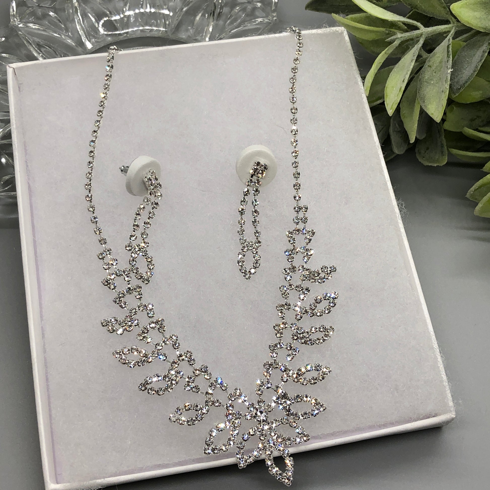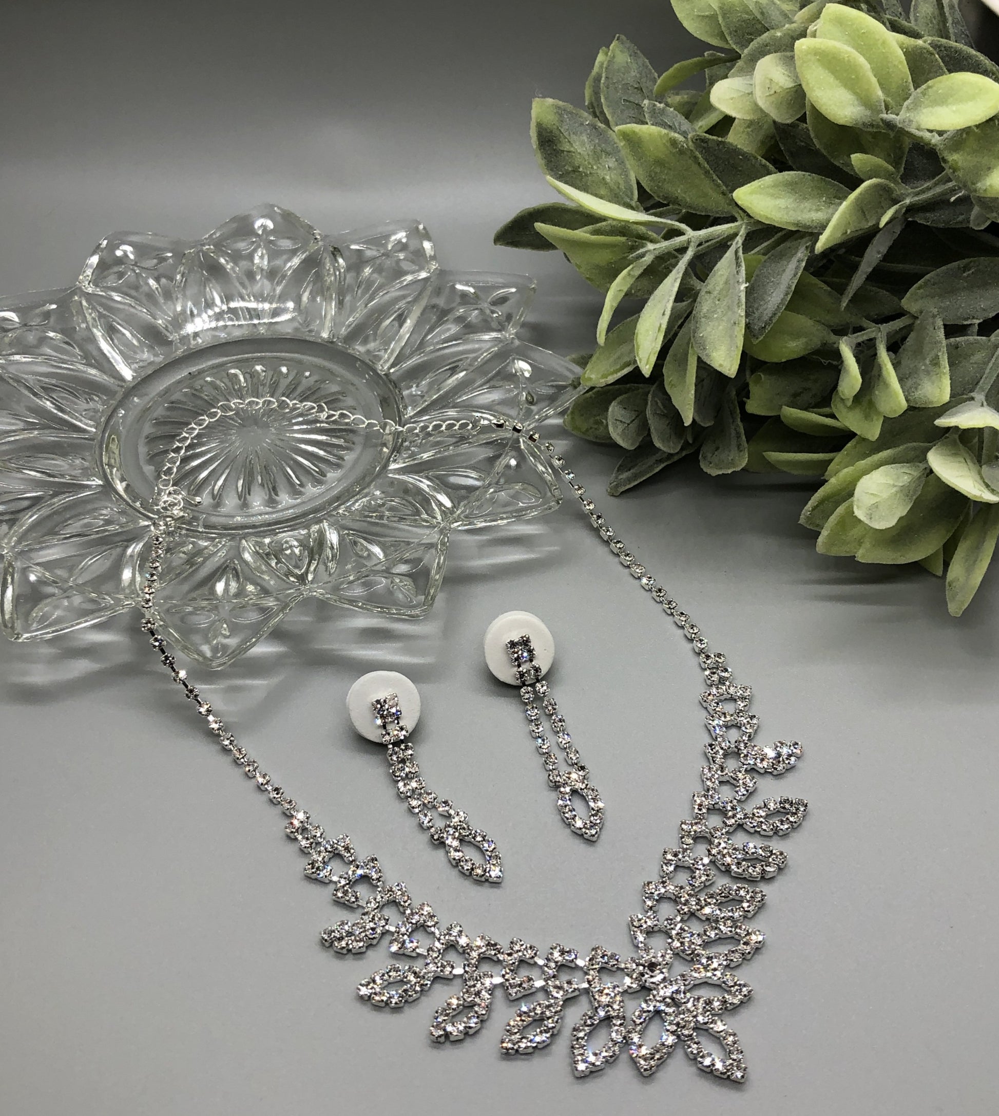 Crystal Rhinestone Leaves Necklace Earrings Set Lobster Claps approximately 17” long