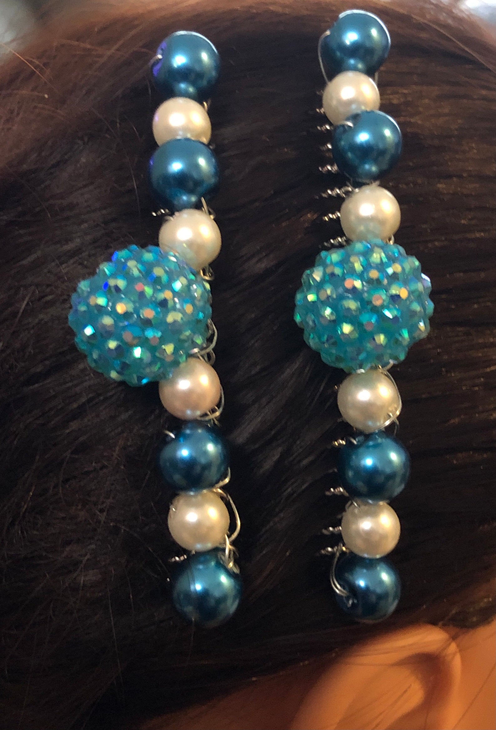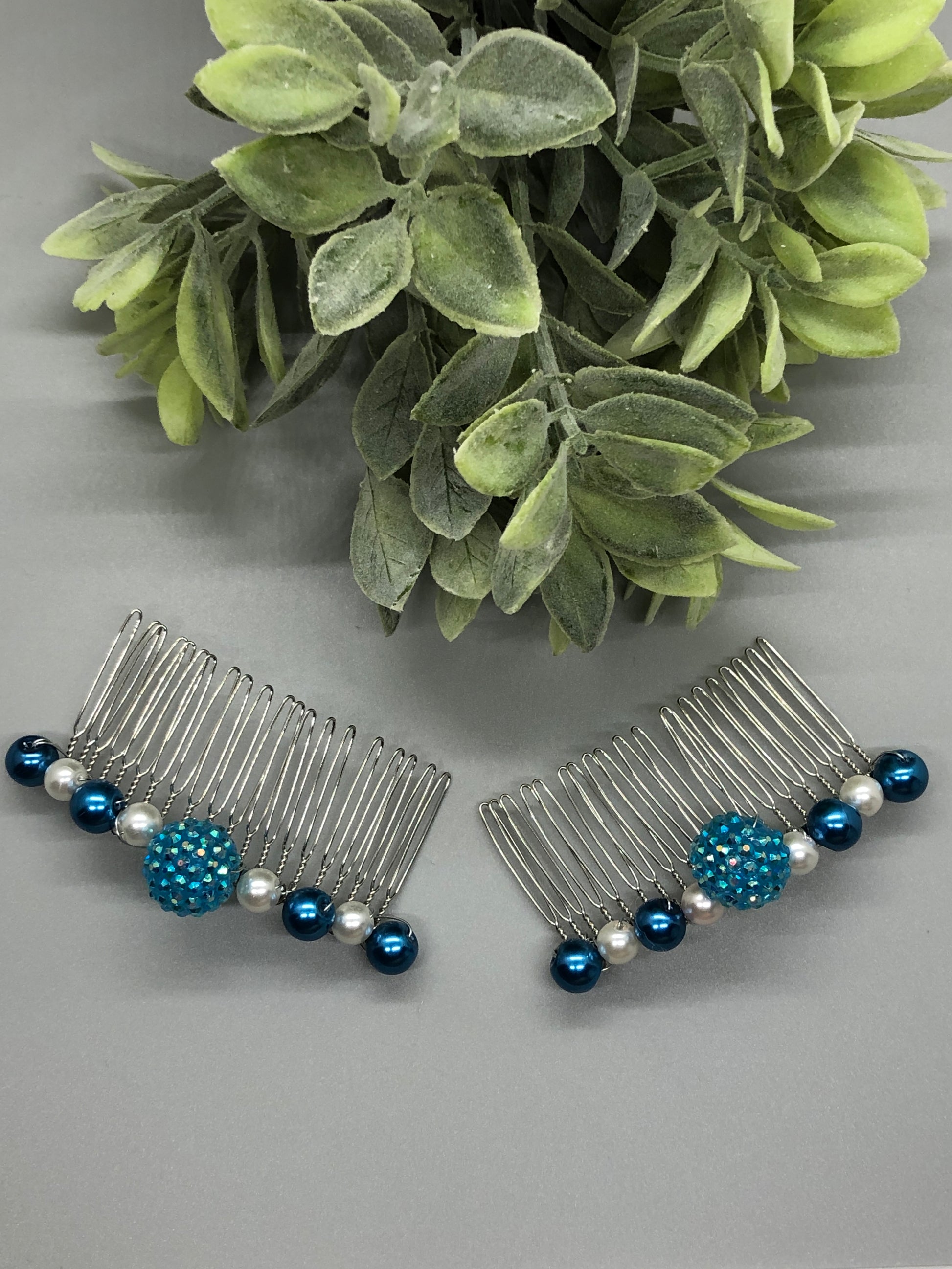 Blue White Disco Ball Faux Stone White Pearls Beaded Hair 3.5' Comb Retro Bridal Wedding Party Prom 2 pc set