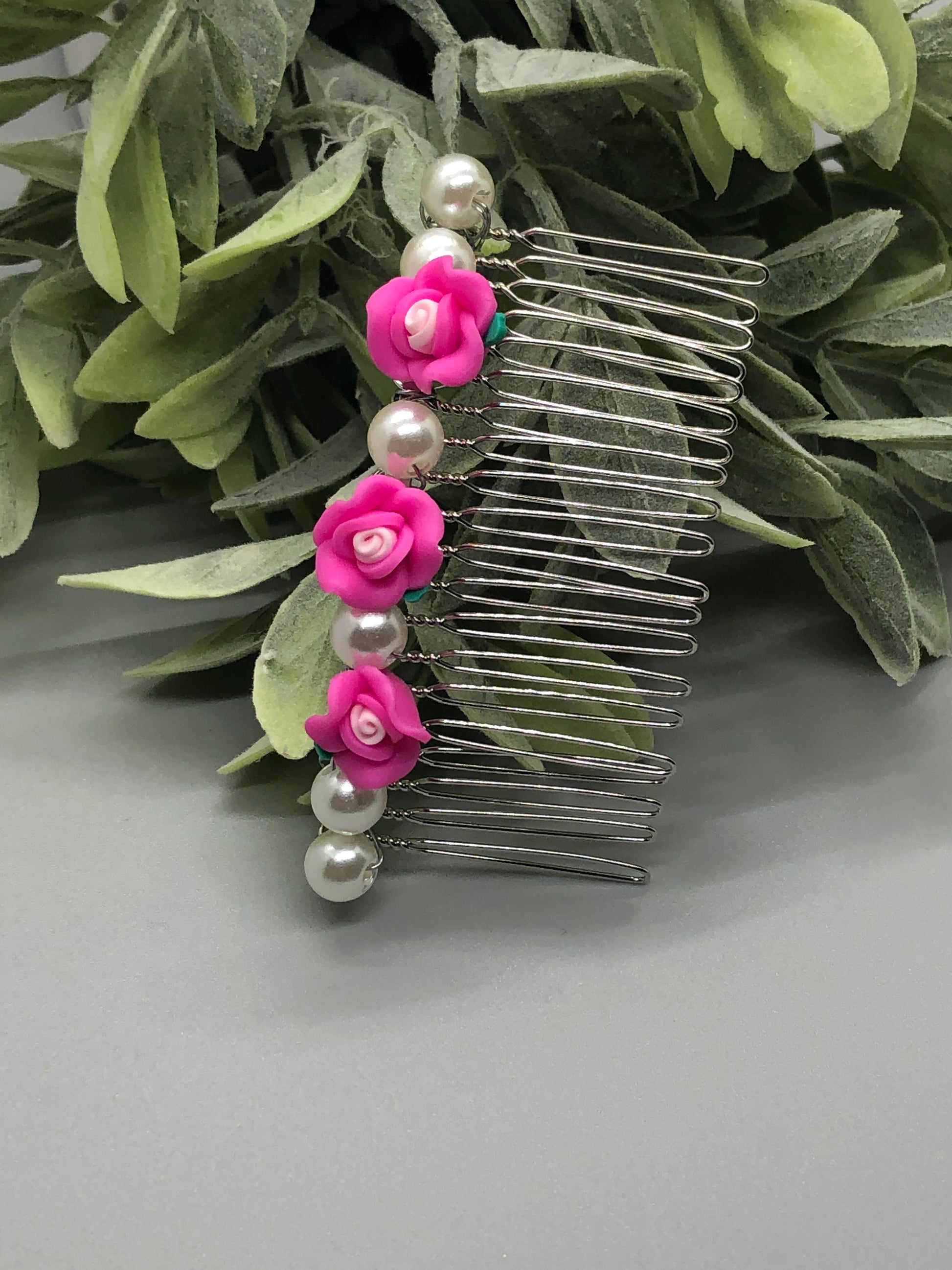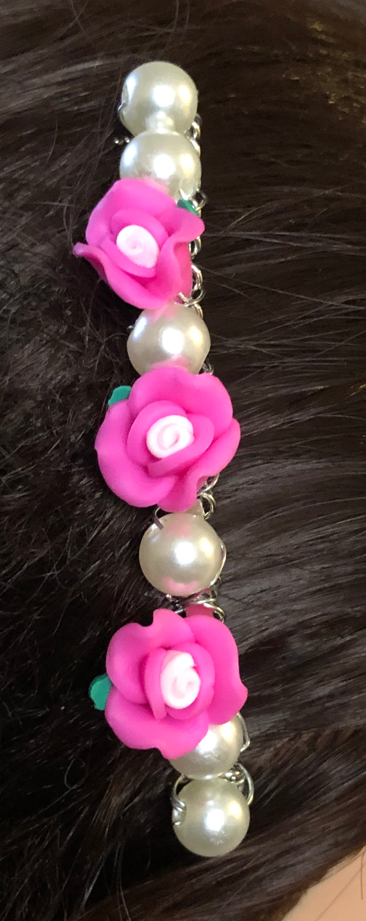Pink Flowers White Beads Side Comb Silver Tone Meatal Comb Beautiful for any occasion