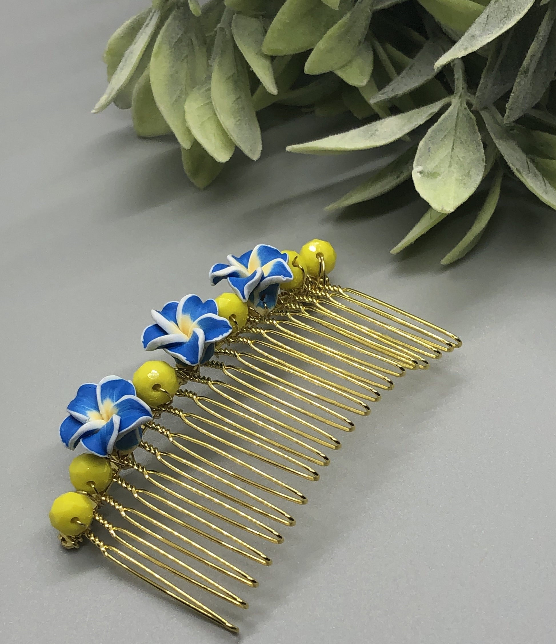 Blue Flowers Yellow Beads Side Combs Gold Tone Metal Combs Beautiful for any occasion