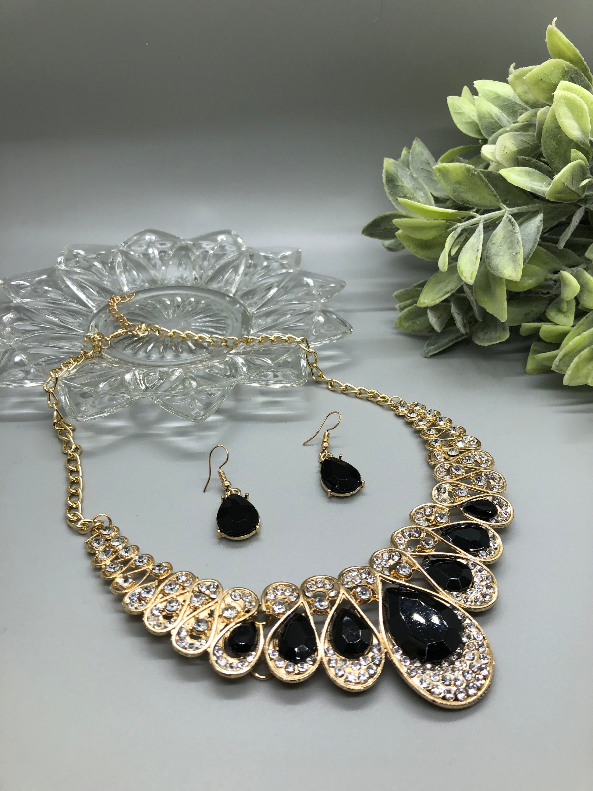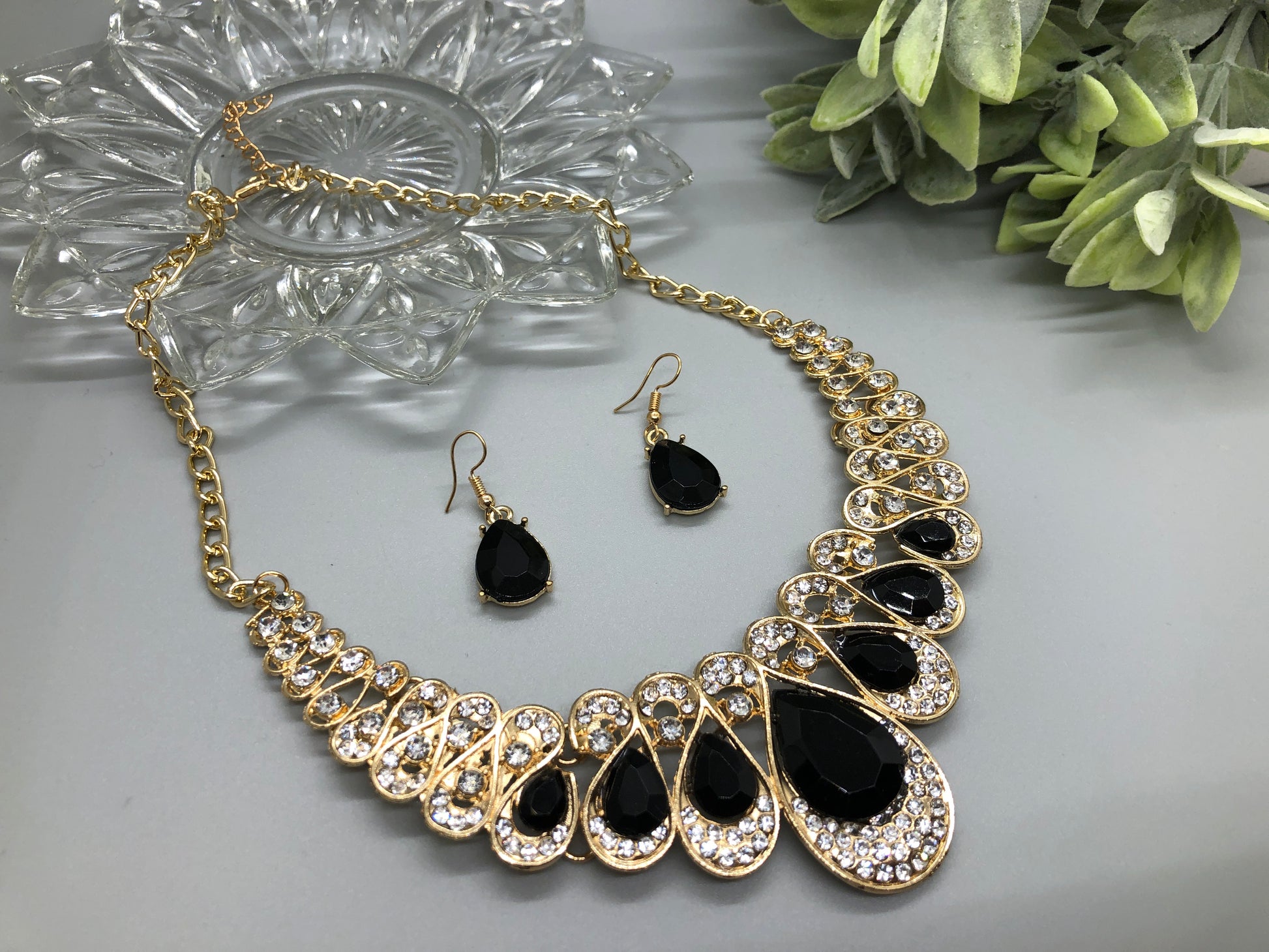 Black Crystal Rhinestone Necklace Earrings Set Lobster Claps