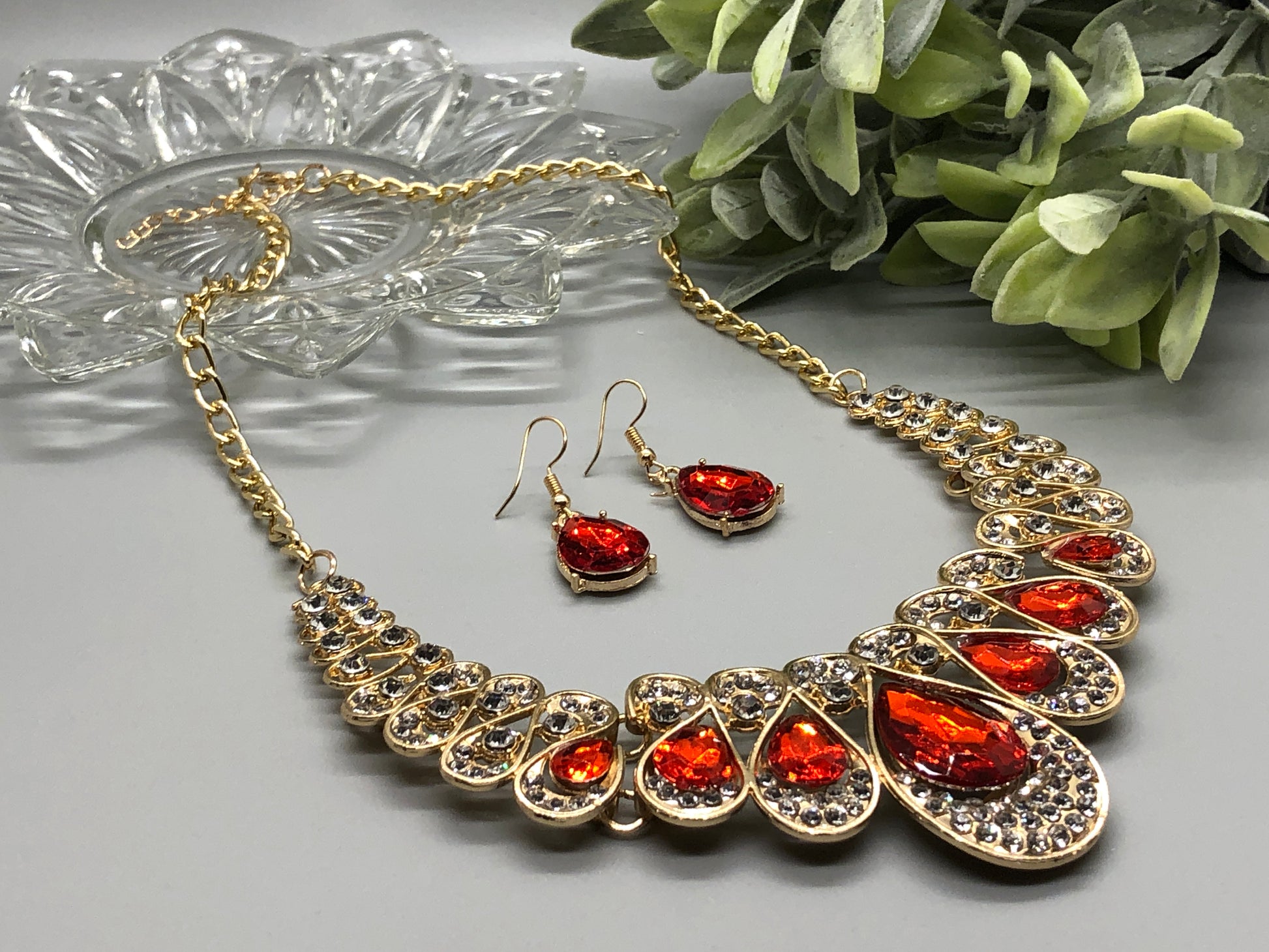 Red Crystal Rhinestone Necklace Earrings Set Lobster Claps