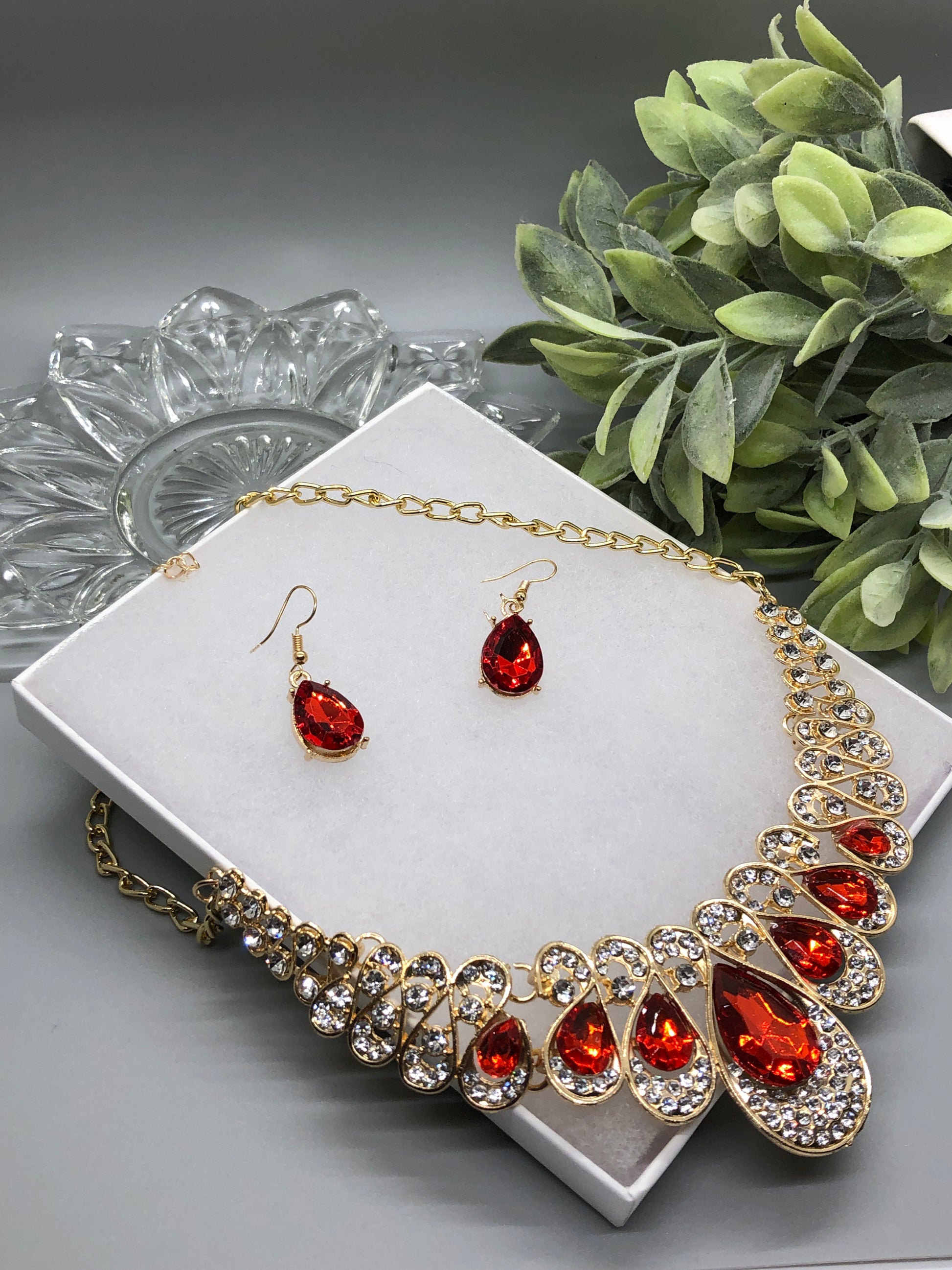 Red Crystal Rhinestone Bridal Necklace Earrings Sets Wedding Formal Shower Party Event Accessories #009