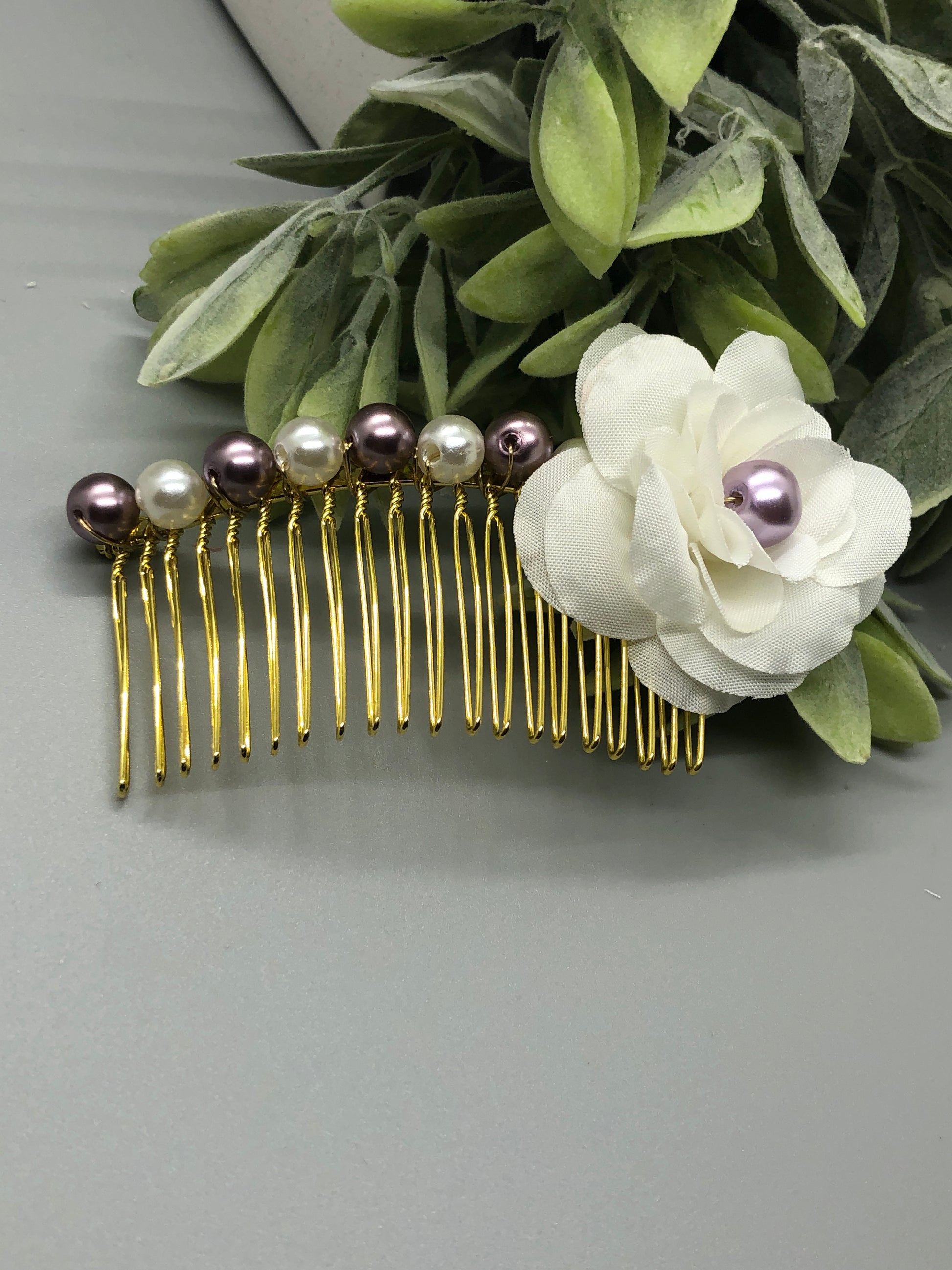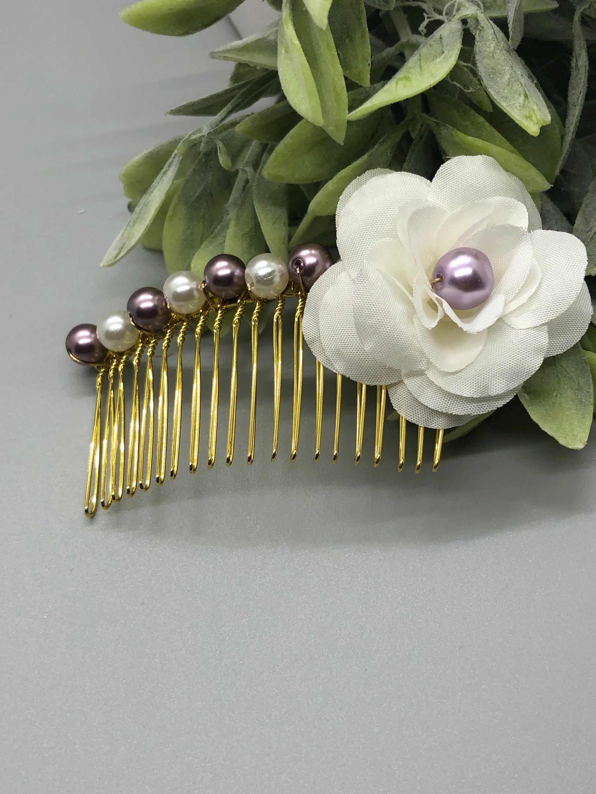 White Flower Purple White Metallic Beads 3.5' Metal Side Comb Retro Vintage Style 1 pc