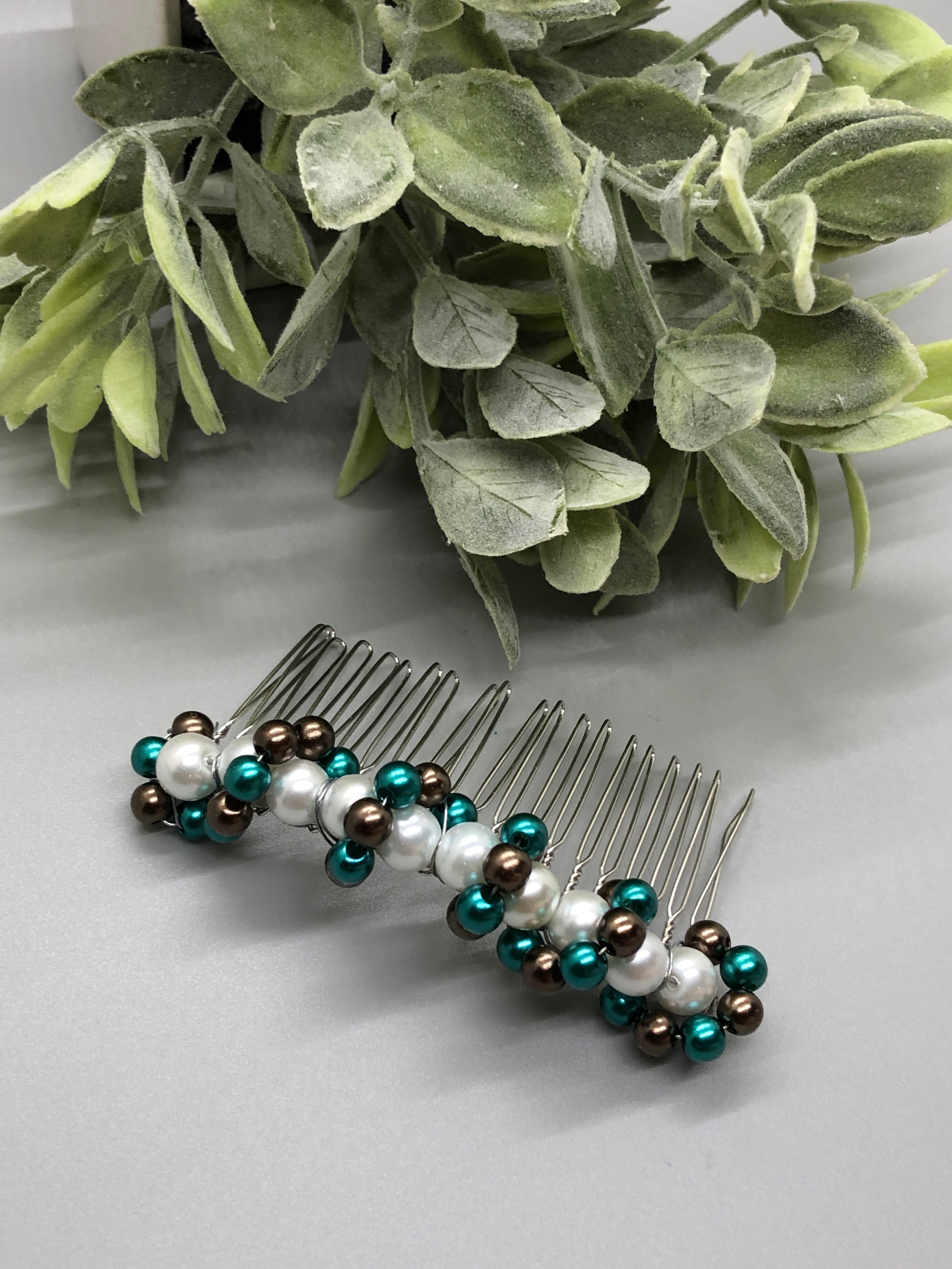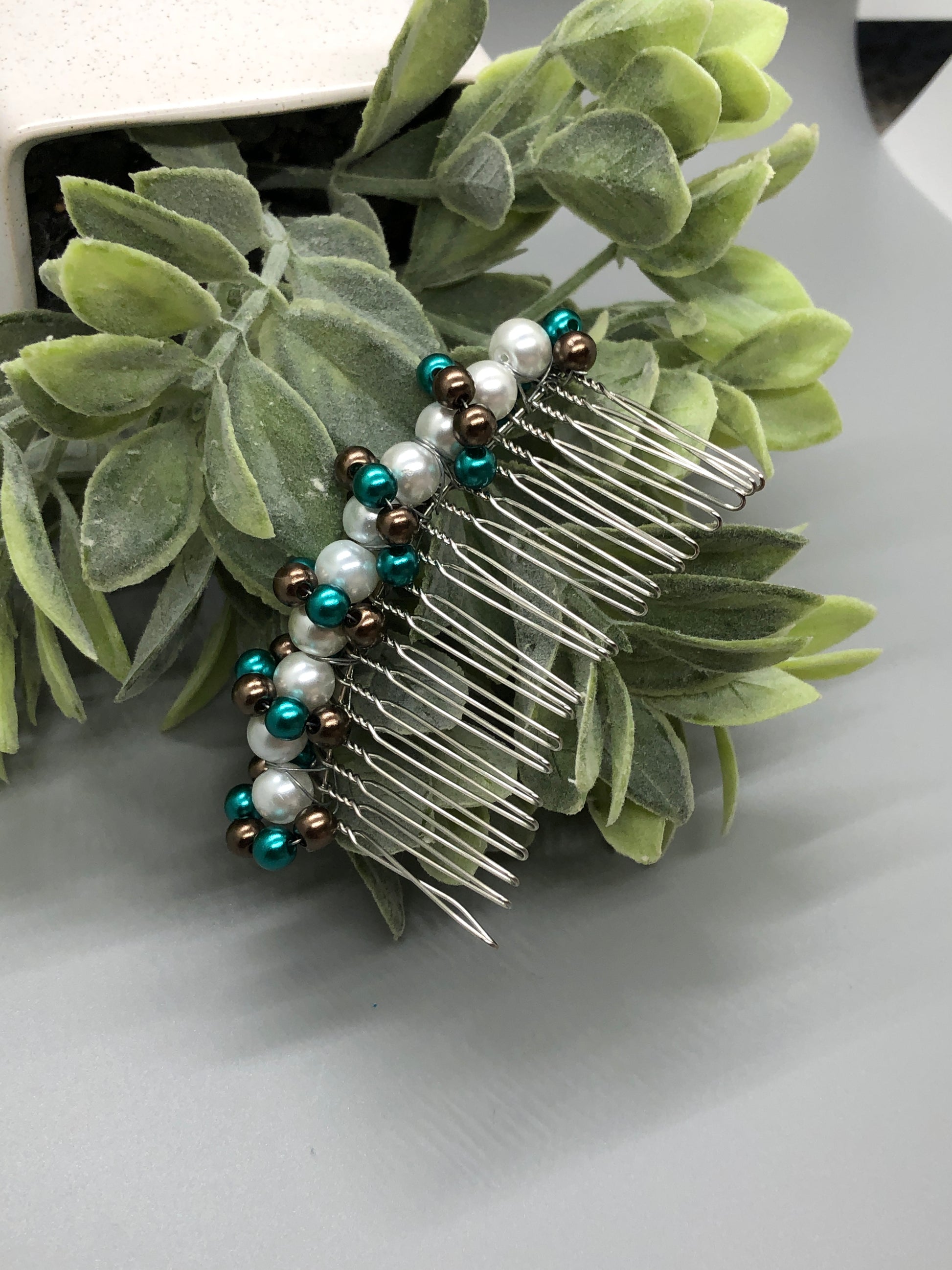 Purple White Teal Beaded Hair Comb on a Silver Tone 3.5' Metal Hair Comb