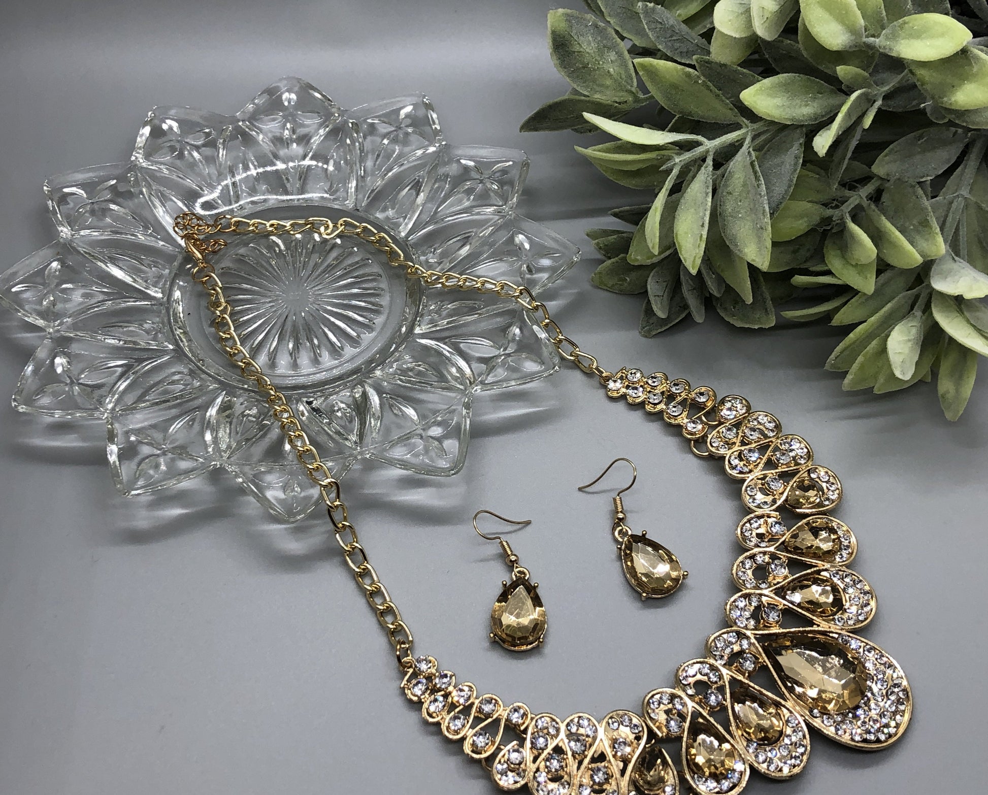 Brown Crystal Rhinestone Necklace Earrings Set Lobster Claps