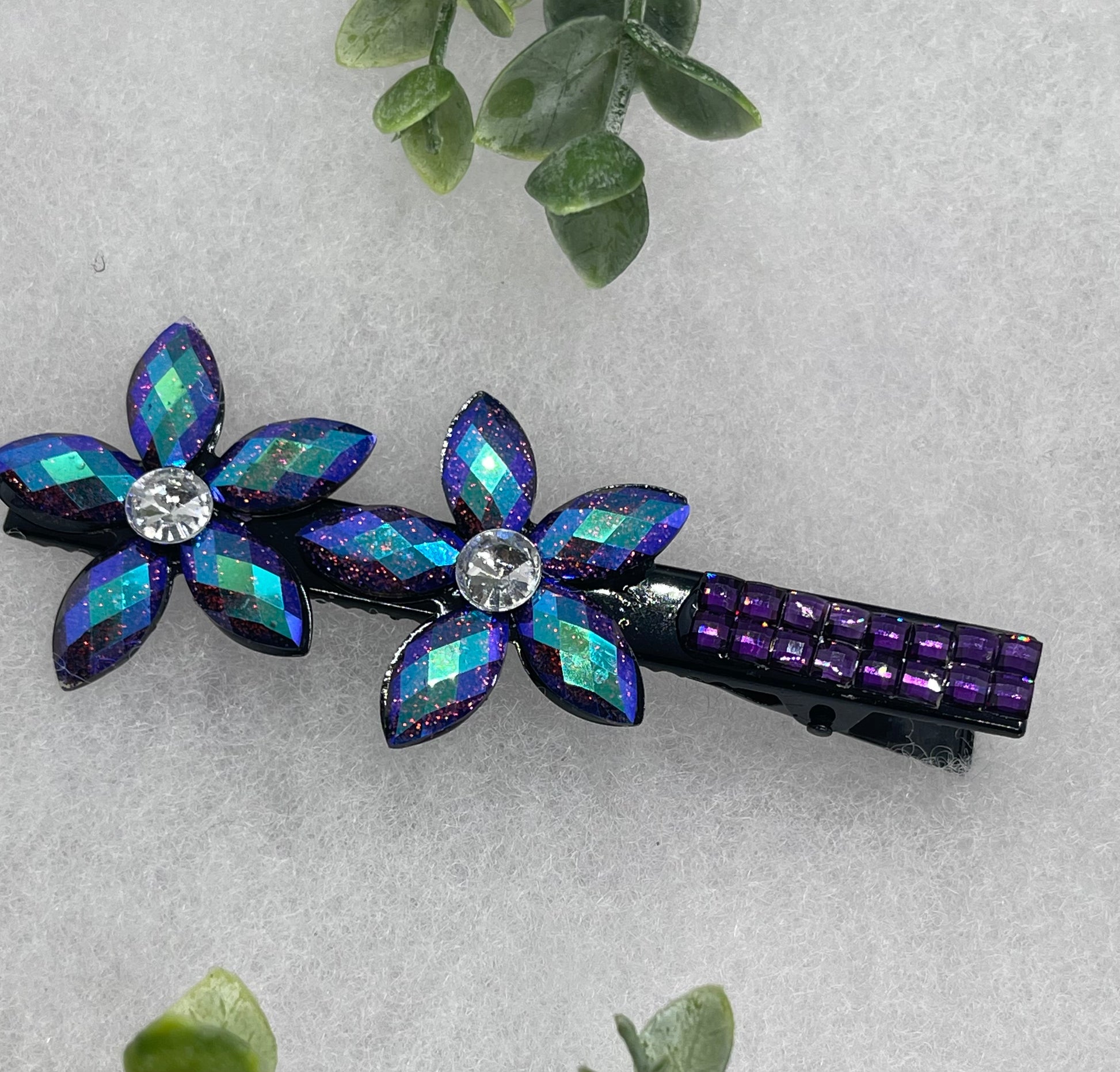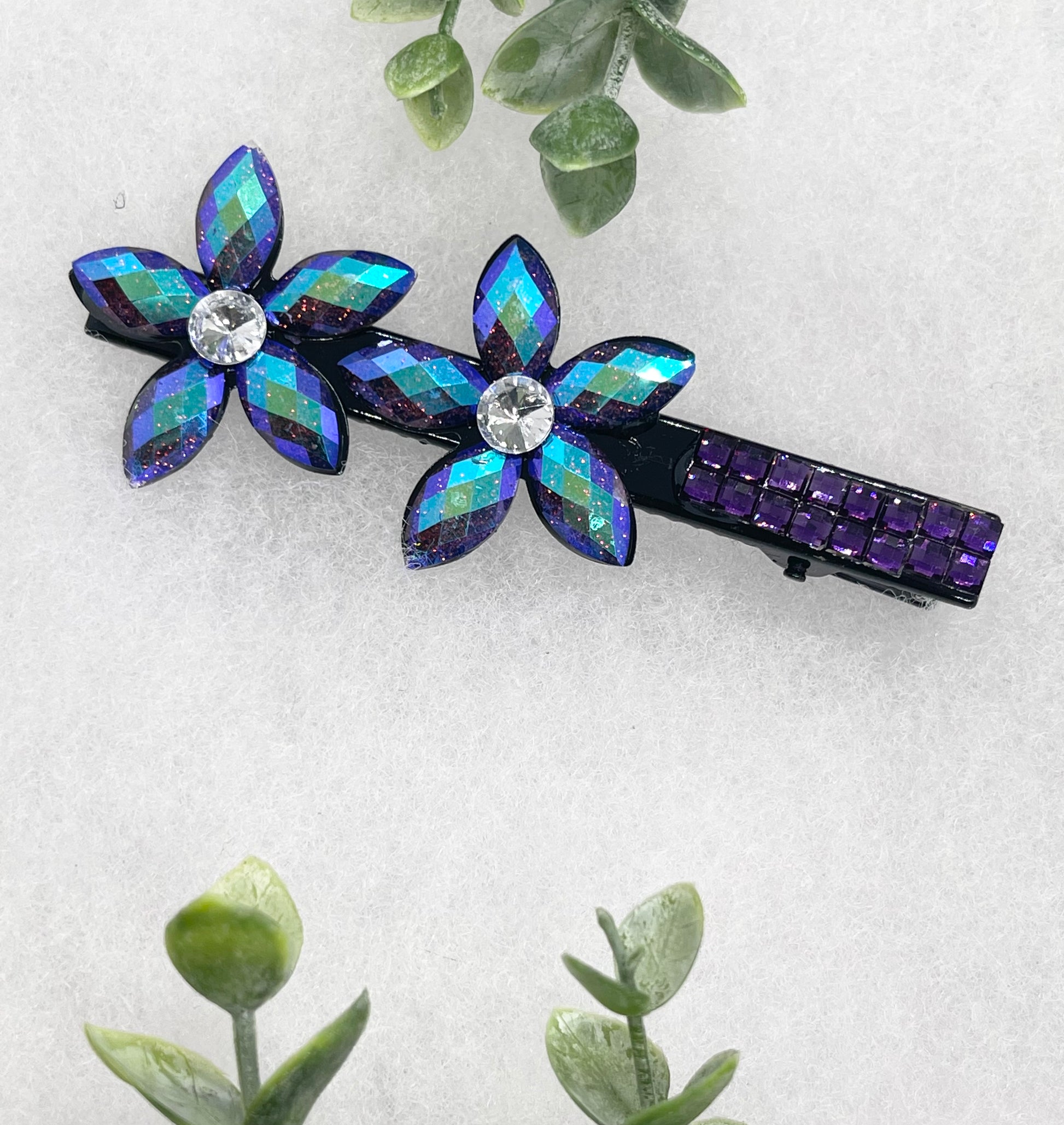 Blue Iridescent Crystal flower hair clip approximately 4.0” black tone formal hair accessory gift wedding bridal engagement